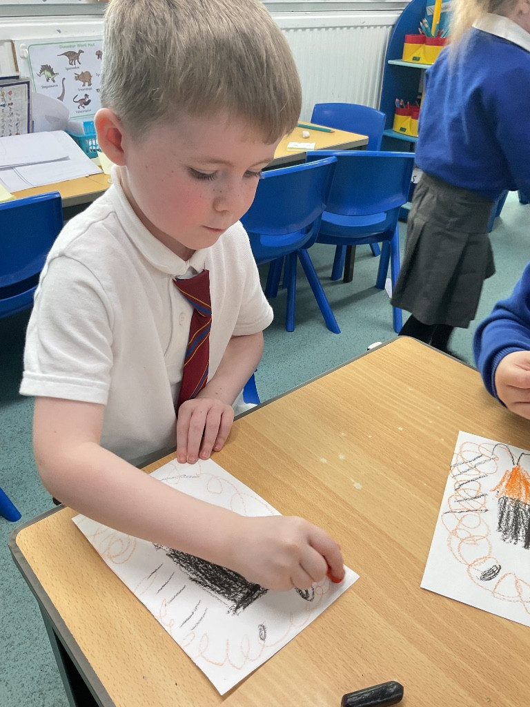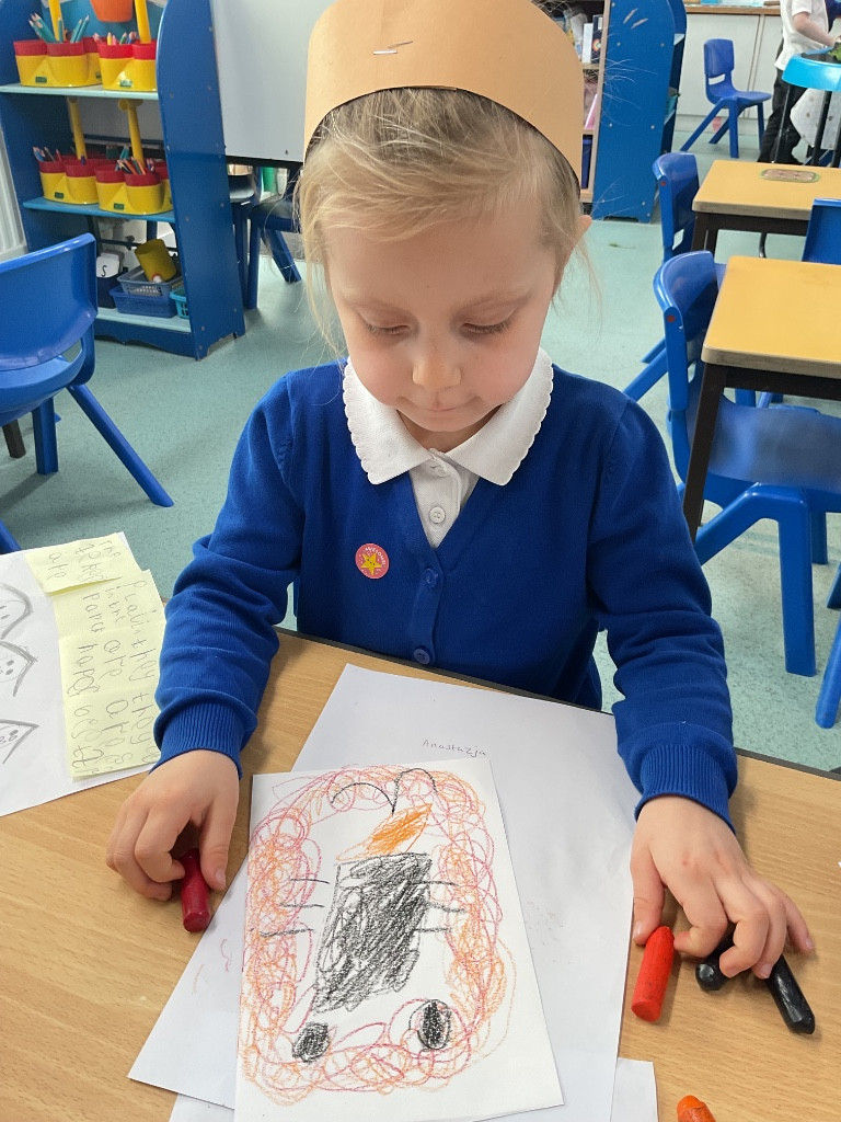 After the story, the children created their own lion pictures. They used wax crayons to draw, before adding brusho (a powdered ink) to paint over their work. The children were really interested to see how the wax resisted the paint, making their lions stand out with a lovely golden glow.