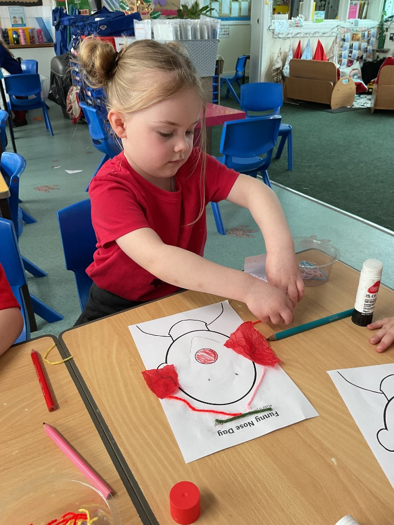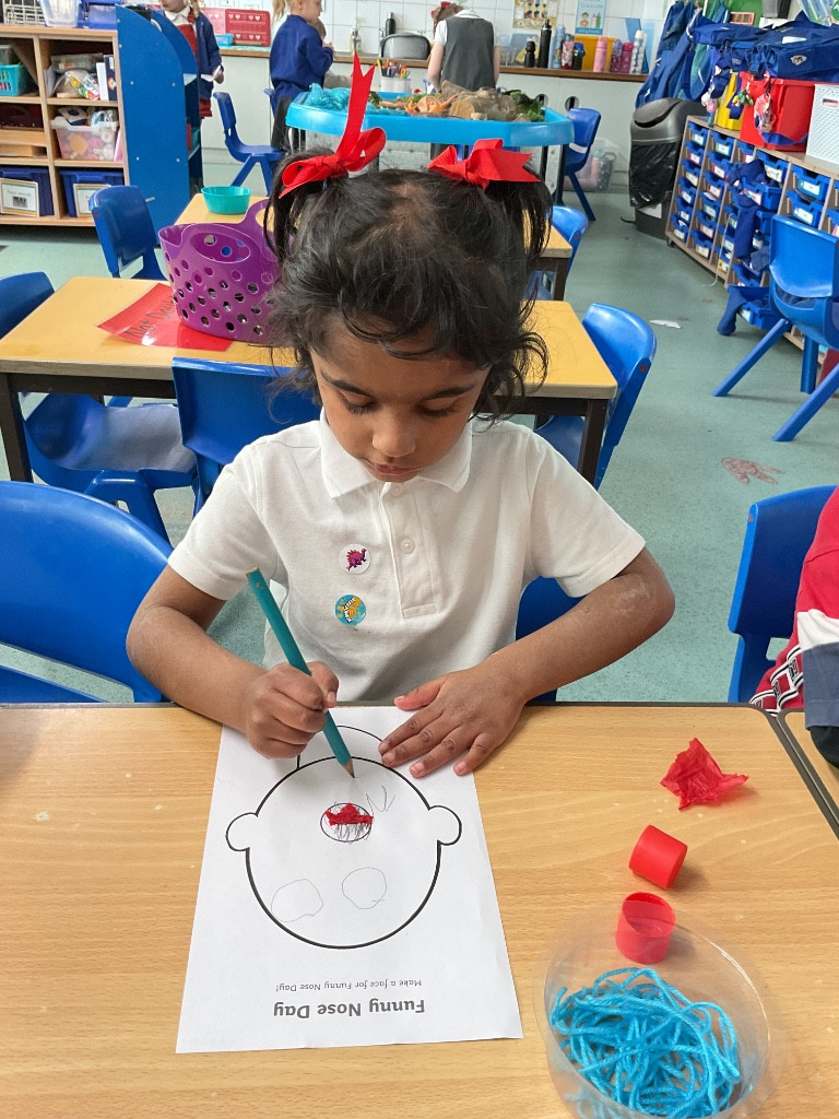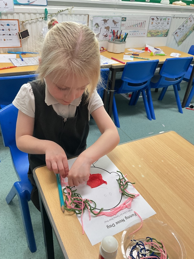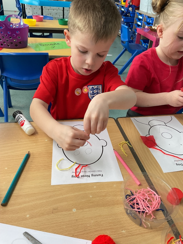 For Red Nose Day, the children enjoyed creating their own funny faces. They carefully added eyes, a bright red nose, and a mouth, then used colourful wool to design the hair. It was lovely to see their creativity and individual choices—some children added lots of vibrant hair, while others decided their funny face would be bald, choosing instead to include features such as a beard or moustache. The children were very engaged and took pride in their unique creations. What a giggle!