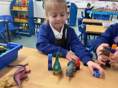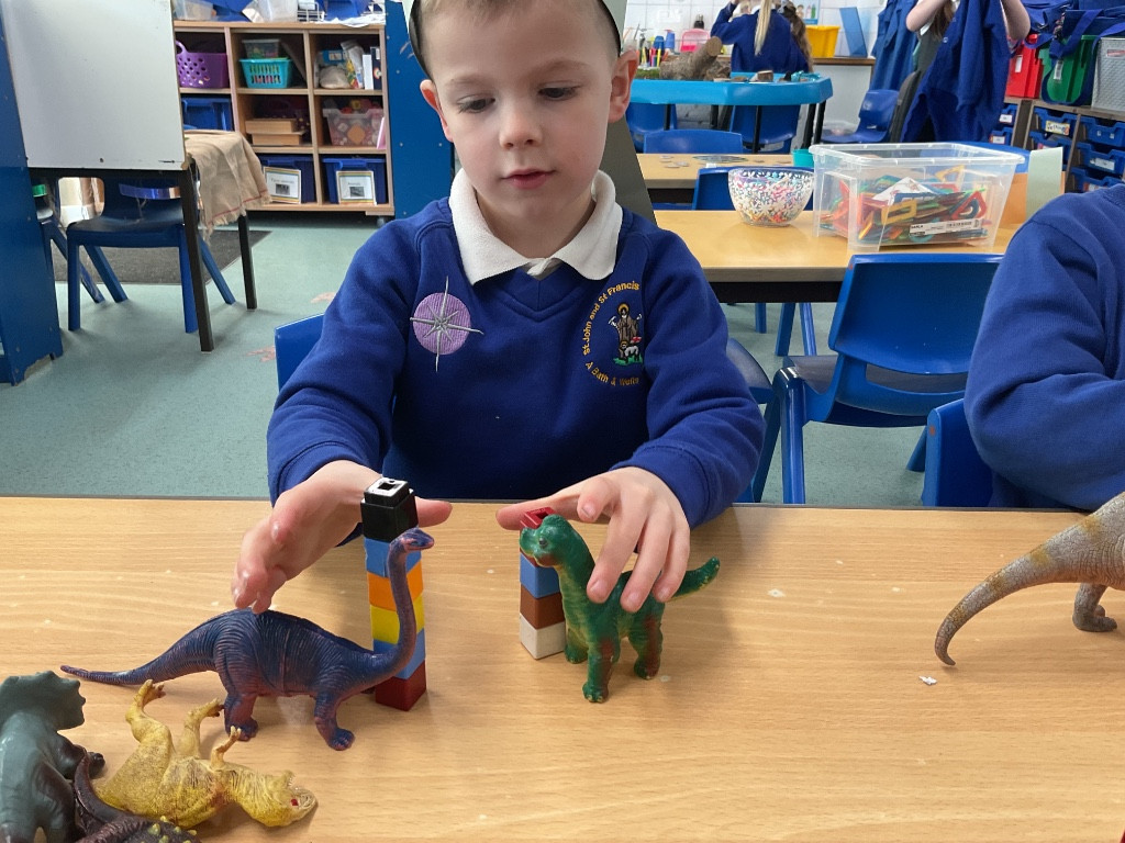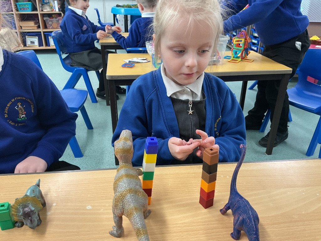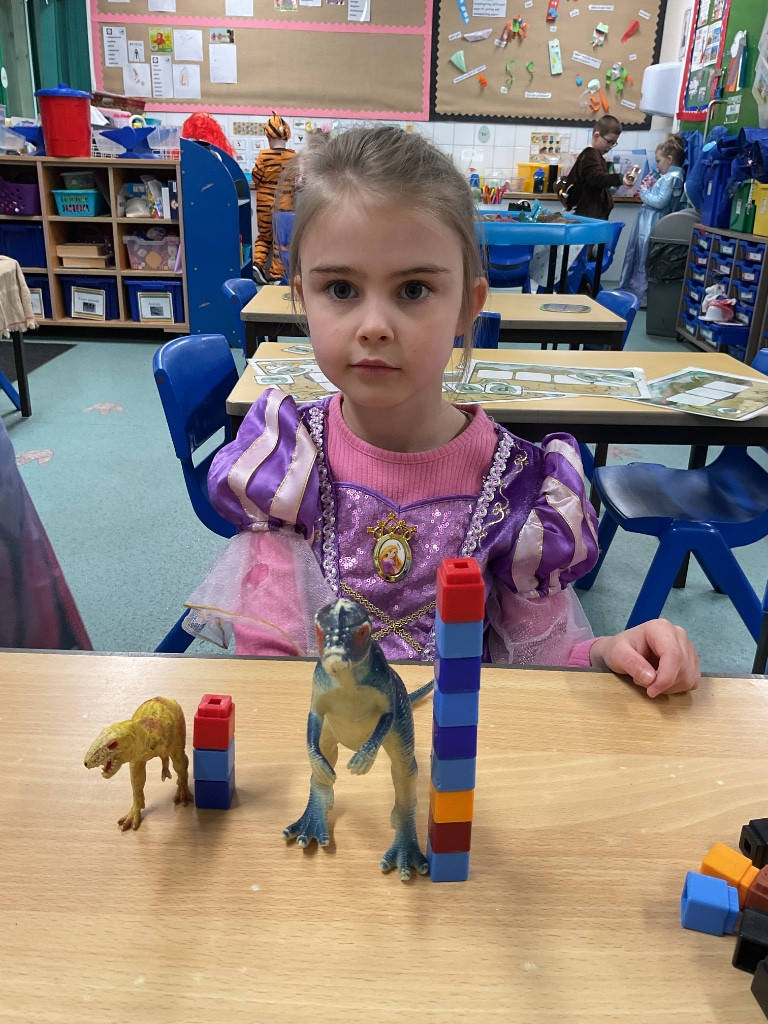 This week, we have been exploring measuring and comparing using dinosaurs! The children started by looking closely at different dinosaurs and ordering them by height. They then compared pairs of toy dinosaurs, predicting which was taller, shorter, longer, or smaller, and used the word “than” to describe their comparisons—for example, “The Tyrannosaurus rex is taller than the Stegosaurus.”