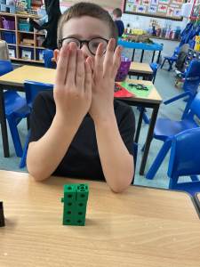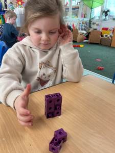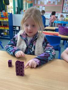Today, the children explored the concept of doubles using practical resources. They used cubes to build doubles by making two towers with the same number of cubes. They also investigated when some were not split into two equal parts.