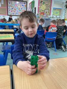 Next, we used cubes to measure the dinosaurs and check our predictions. The children noticed that taller or longer dinosaurs took more cubes to measure than shorter ones, helping them understand how measurement works in a hands-on way.