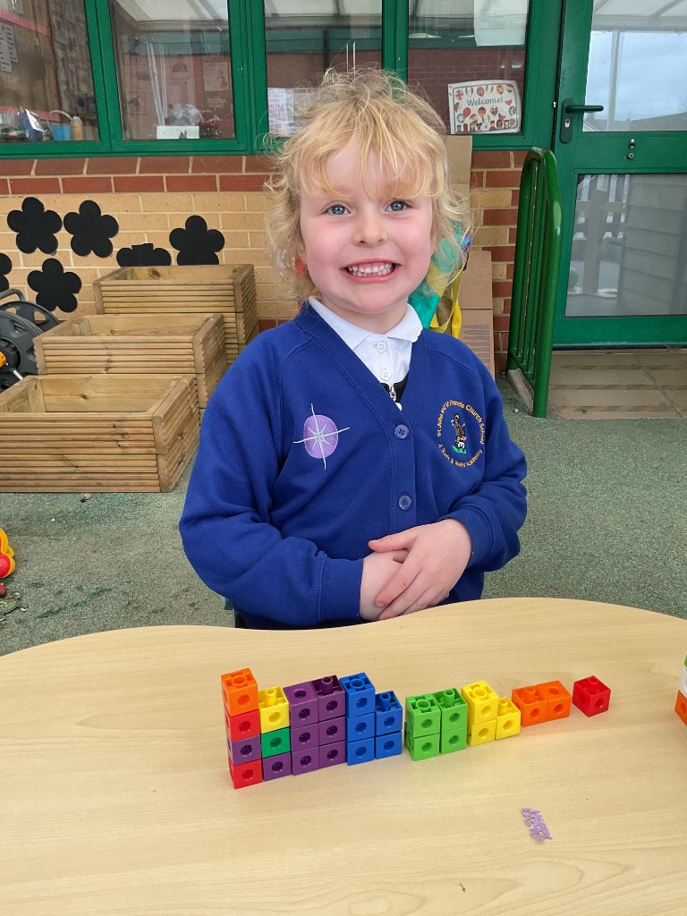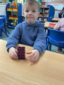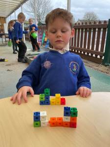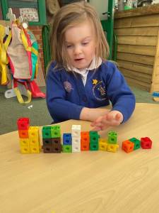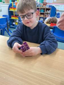 We have been making our own Numberblocks characters from 1 to 5. We had to carefully count out the correct number of cubes. We then sequenced them and noticed that they looked like a staircase. This is a growing pattern where one more is added each time. We predicted that the next number would be 6!
