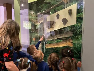We began by exploring the museum, where we saw a range of fascinating artefacts, including real dinosaur fossils. The children were eager to share their knowledge, confidently talking about dinosaurs and prehistoric creatures. They impressed us with their understanding of the differences between carnivores and herbivores, using this vocabulary accurately in context.