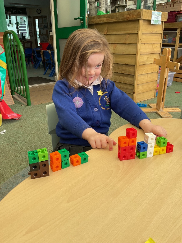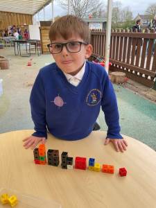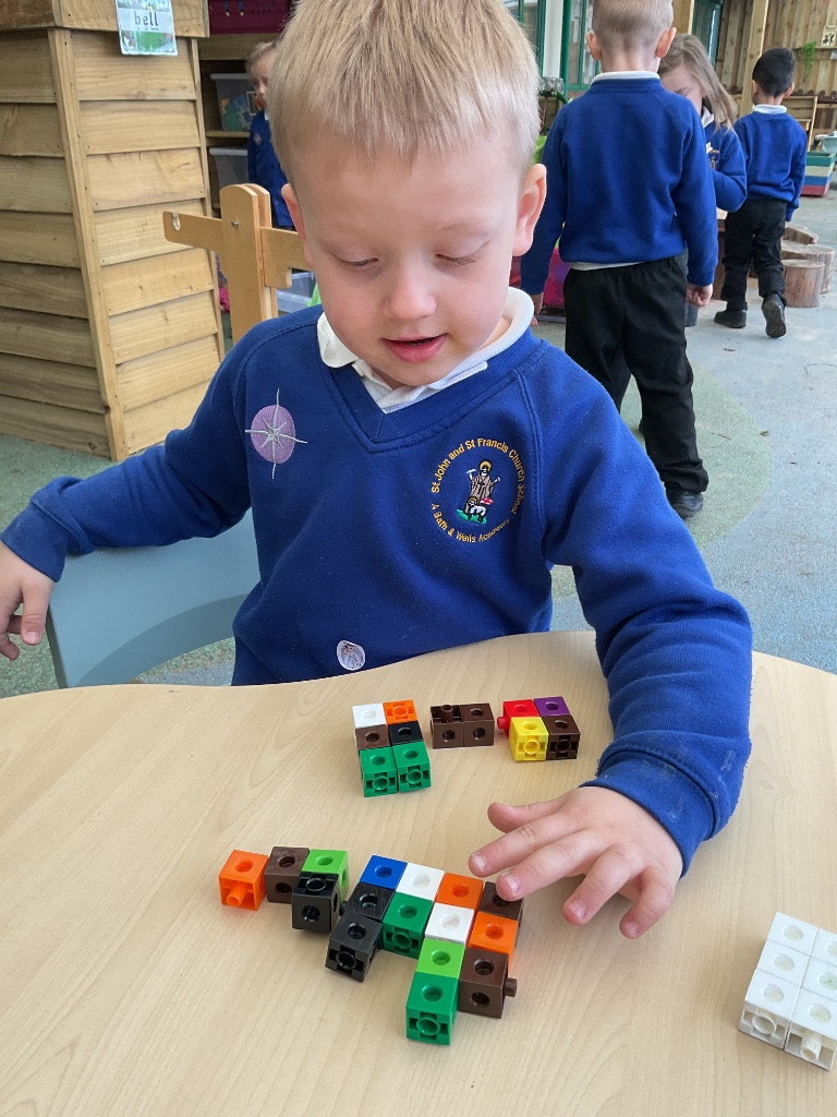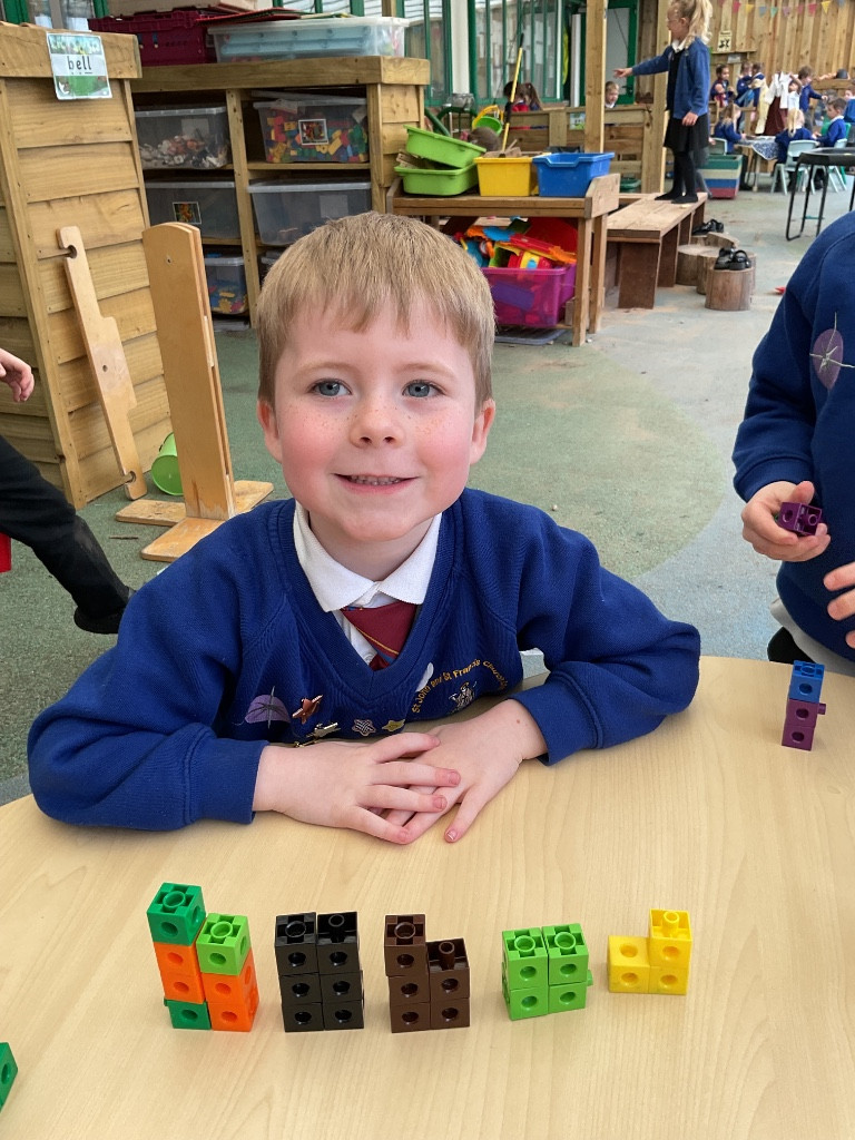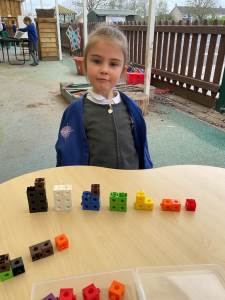 We have been learning about the composition of the number 7 and finding different ways to make 7 using two colours of cubes. We have been using the generalisations that “1 and 6 make 7”, “2 and 5 make 7” and “3 and 4 make 7”. Maybe you could use your toys at home to show different ways of making 7!