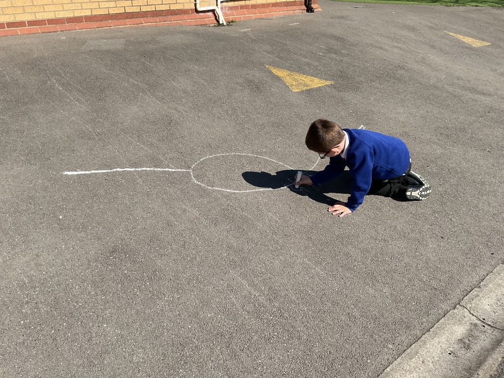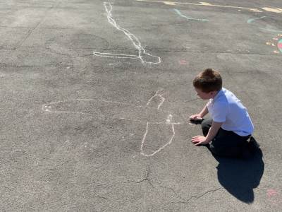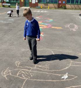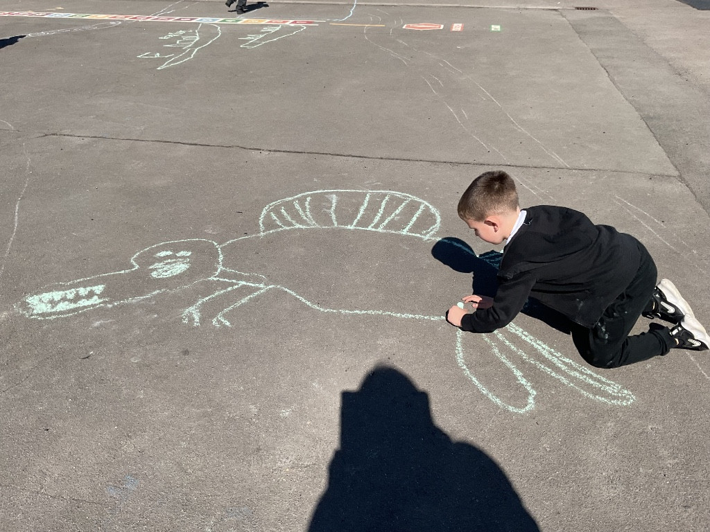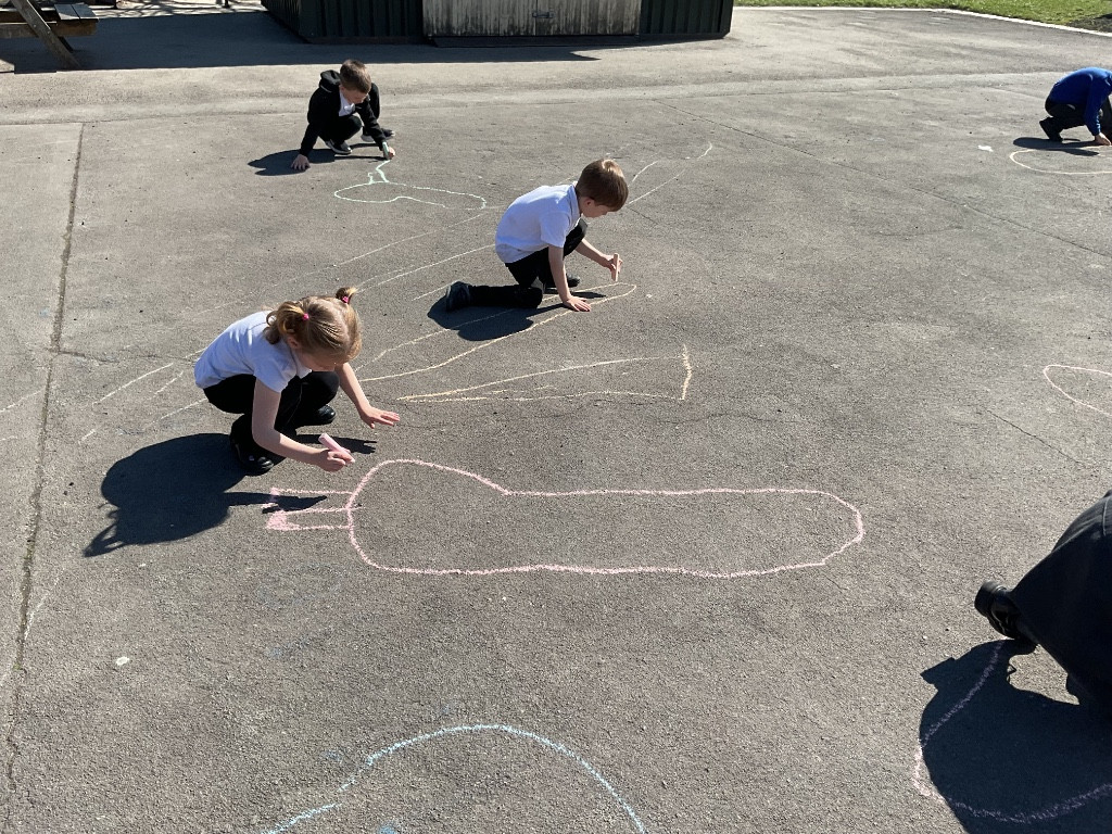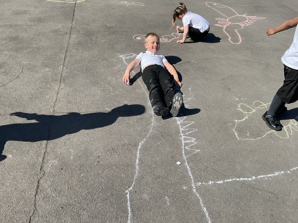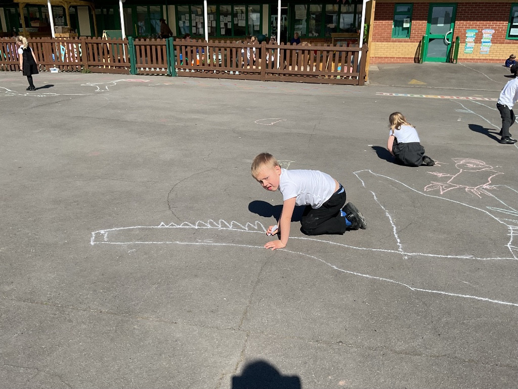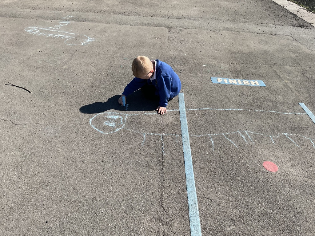 To finish our exploration, the children used chalk to draw their very own dinosaurs on the playground. They then measured their creations using the trundle wheel, just like real scientists and palaeontologists.