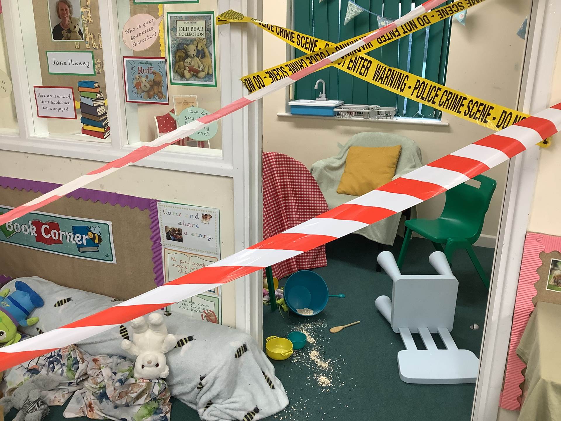 This morning we came into school and saw that our role-play area had been cornered off with police tape. The chairs had been knocked over and there was porridge all over the floor. What could have happened?