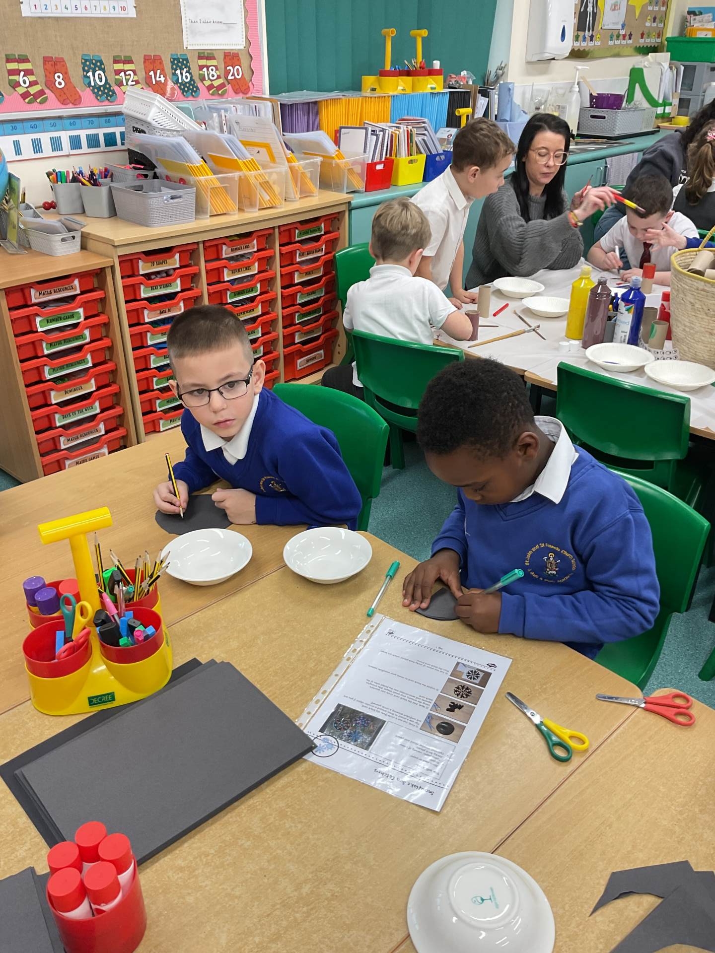 We learnt lots from her fantastic visit. We discovered that it is celebrated a little bit like Christmas where they have a lovely family meal, dress in their best clothes ( Mrs Malhi's dress looked very different to the clothes that we wear), they share sweets and gifts, they decorate their homes and even have fireworks. We were very lucky as we got to make our own Diva lamps to take home. We then created some of our own pictures and patterns using some Rangoli powder and Mrs Edwards and Mrs Leach even had a Mendi pattern drawn on their hands. Mrs Malhi even gave us some sweet treats and the staff some freshly backed spring rolls and samosas which tasted delicious.