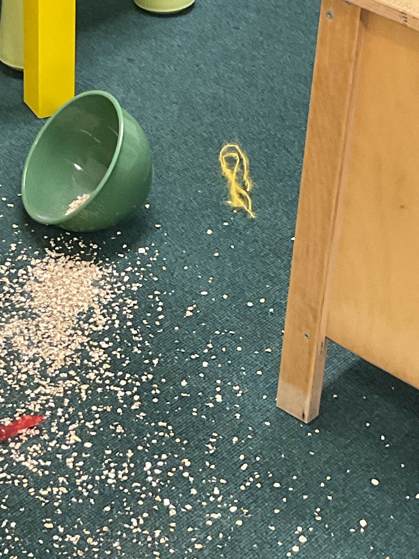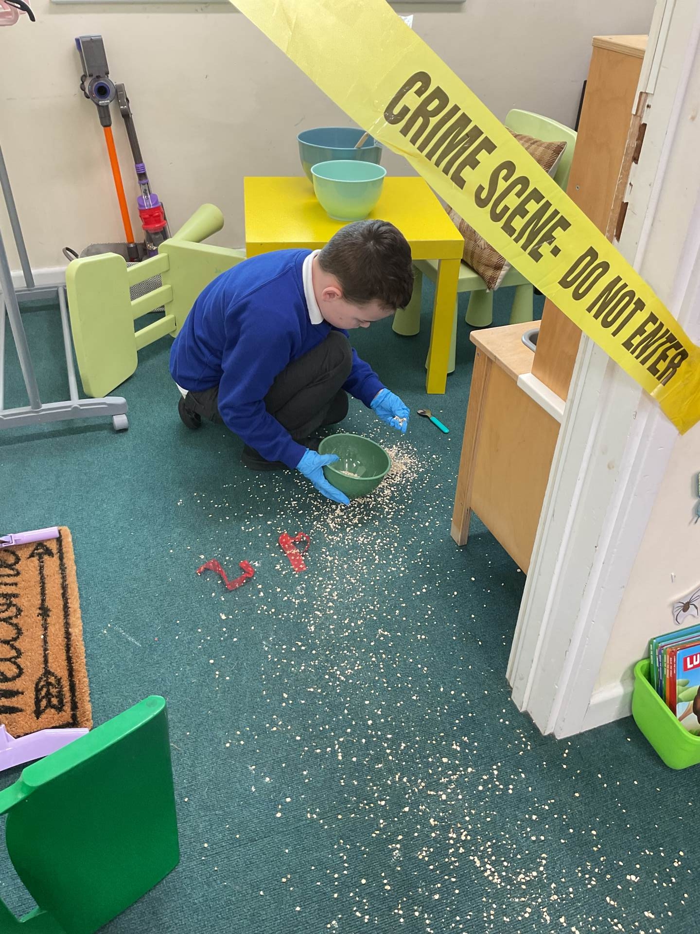 This morning we came into school and saw that our role play area had been cornered off with police tape. The chairs had been knocked over and there was porridge all over the floor. What could have happened?