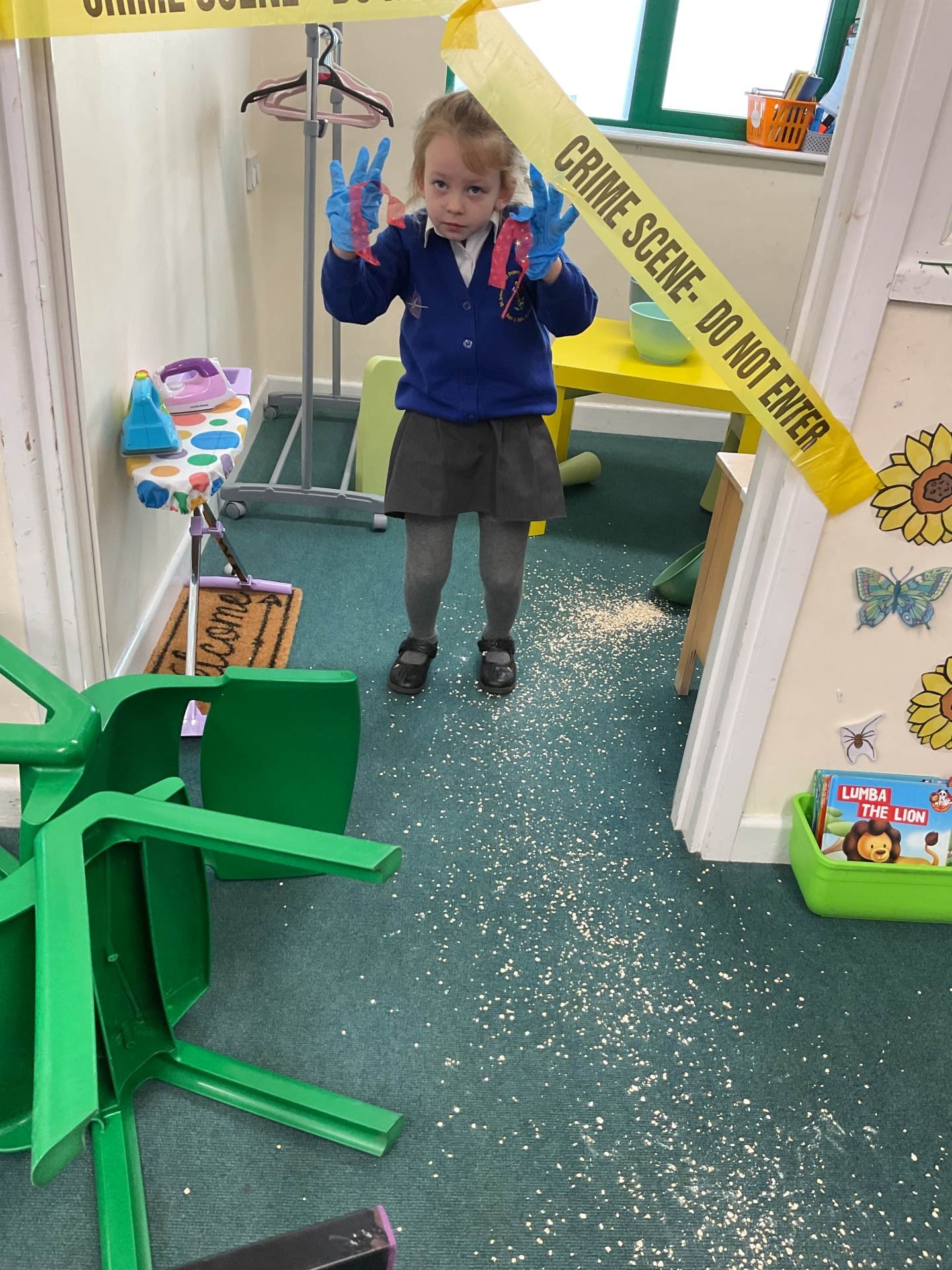 This morning we came into school and saw that our role-play area had been cornered off with police tape. The chairs had been knocked over and there was porridge all over the floor. What could have happened?