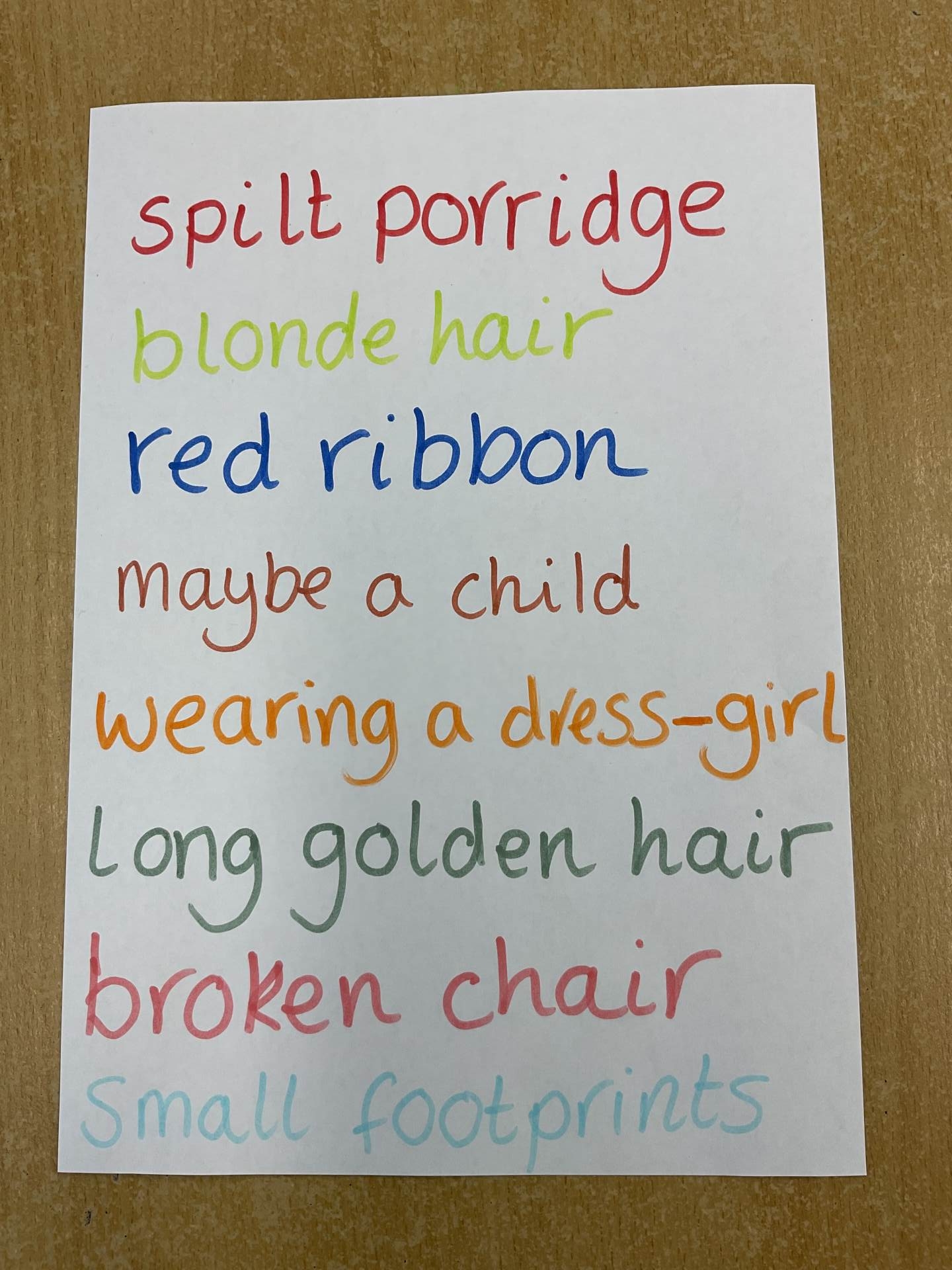 We watched some video clips from our cleaning team and Mrs Warner who had discovered the mess. We used our detective skills to try to work out who it could of been. They had blonde hair, They were a child, They left a red ribbon and wore a blue dress. Who could it be?