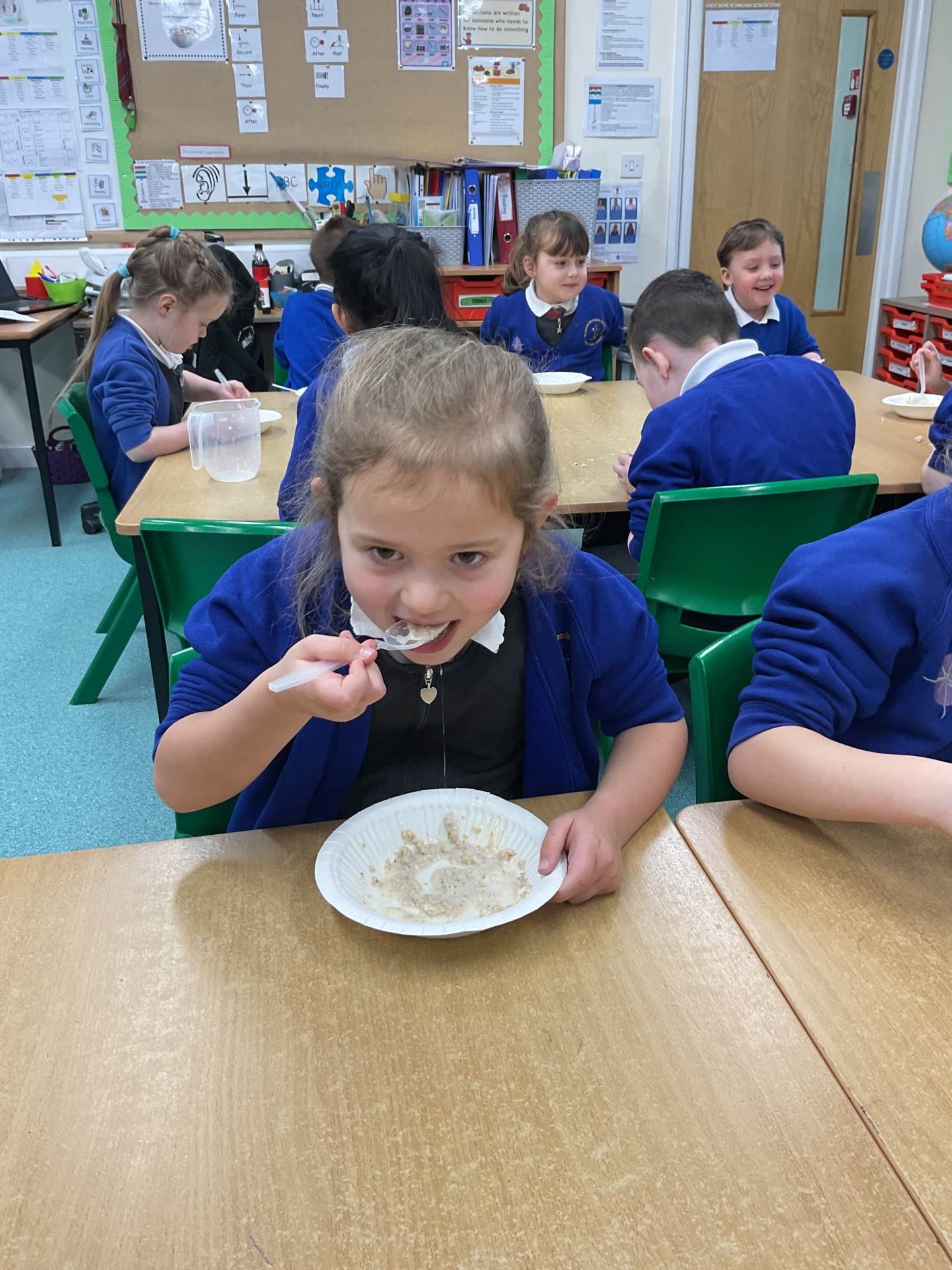 Today Sparrow and Blackbird Class made porridge! The children were able to follow and explain the instructions step by step. We read the instructions together and added sign and gesture to support our retelling. We discussed the layout of an instruction text and discussed why they are important.