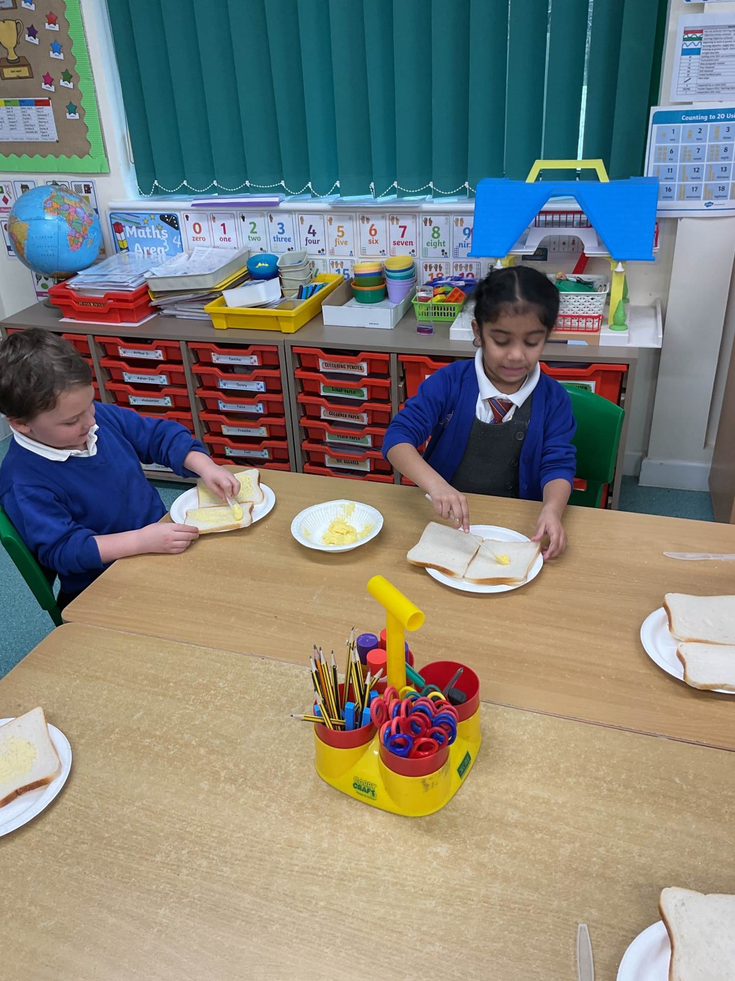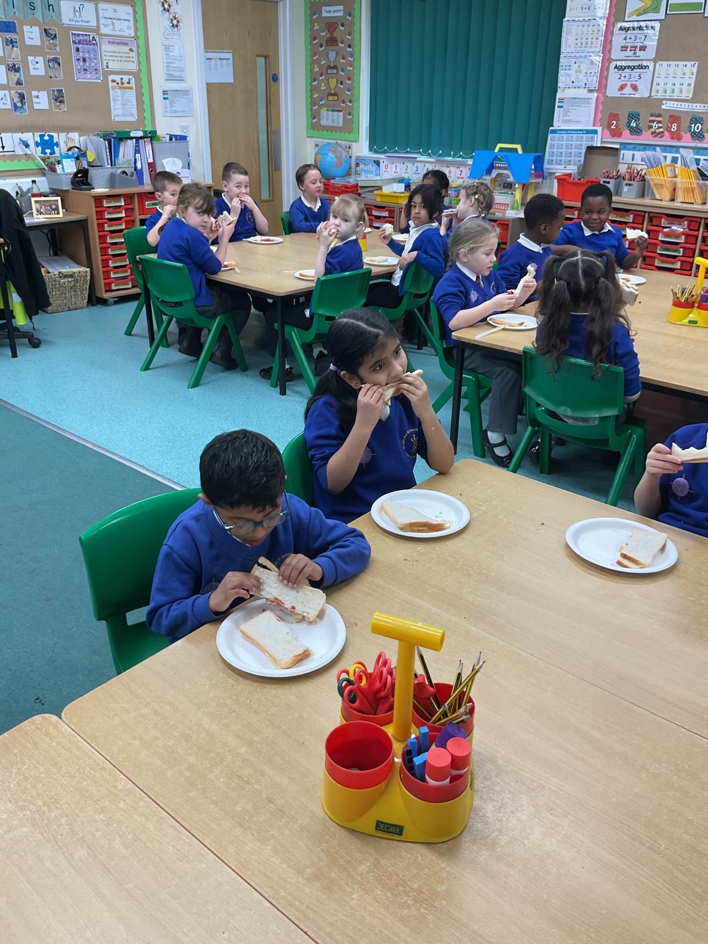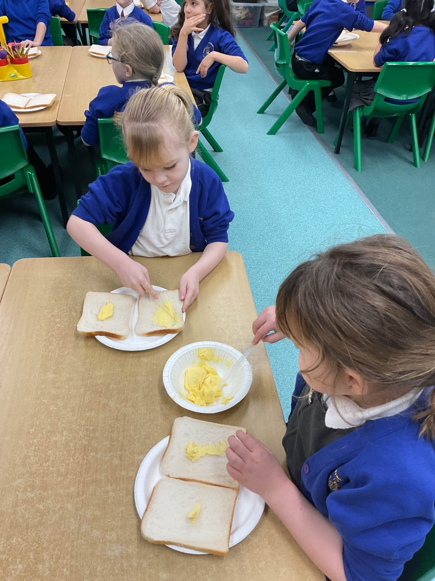 Today we made jam sandwiches! Our teacher made us laugh because she got the instructions muddled up the first time. You can’t cut the sandwich before you’ve put the jam in!!