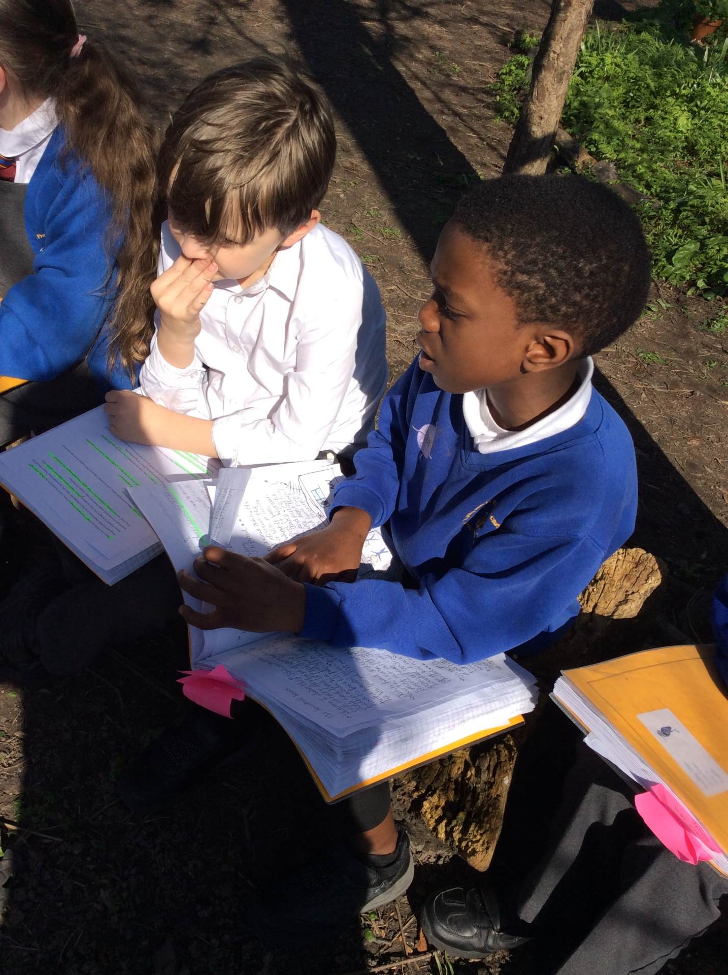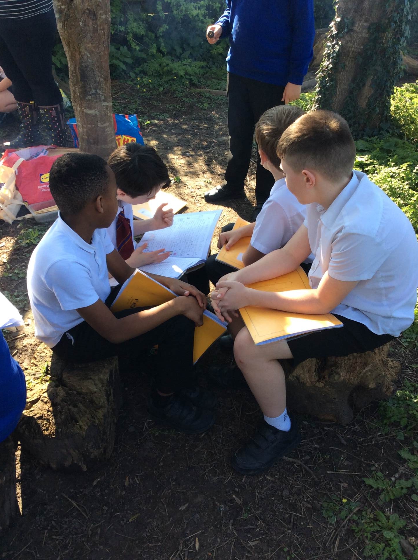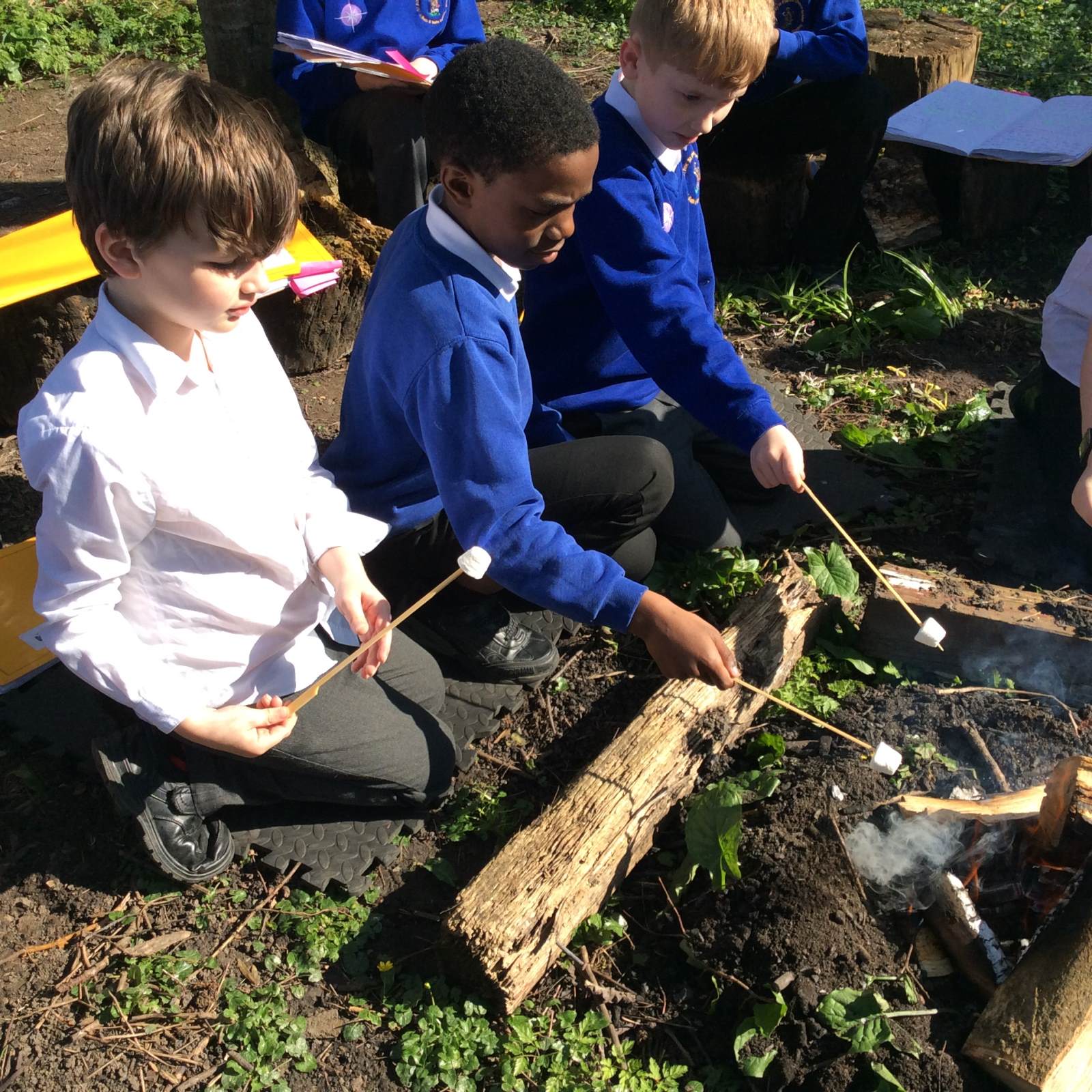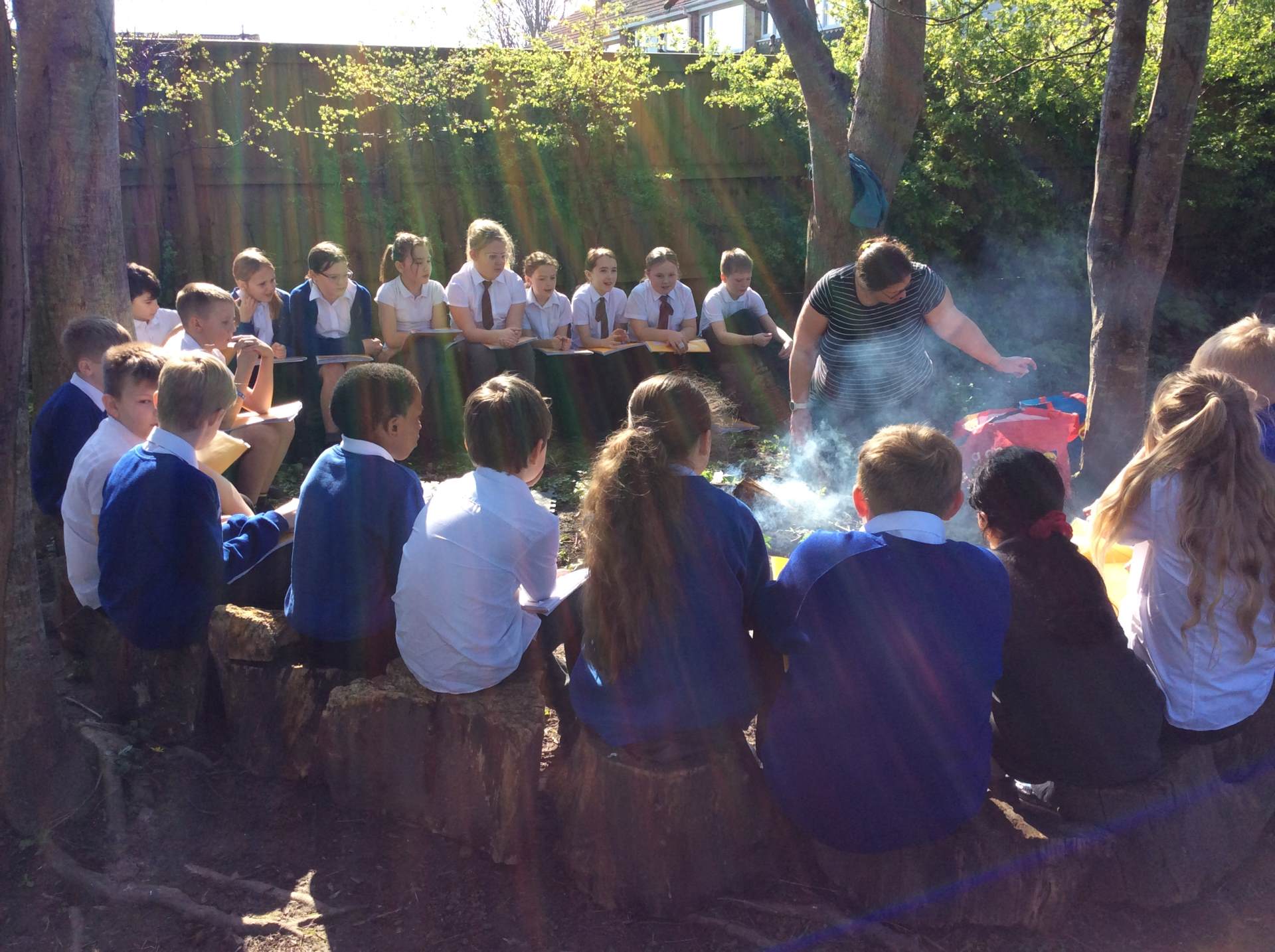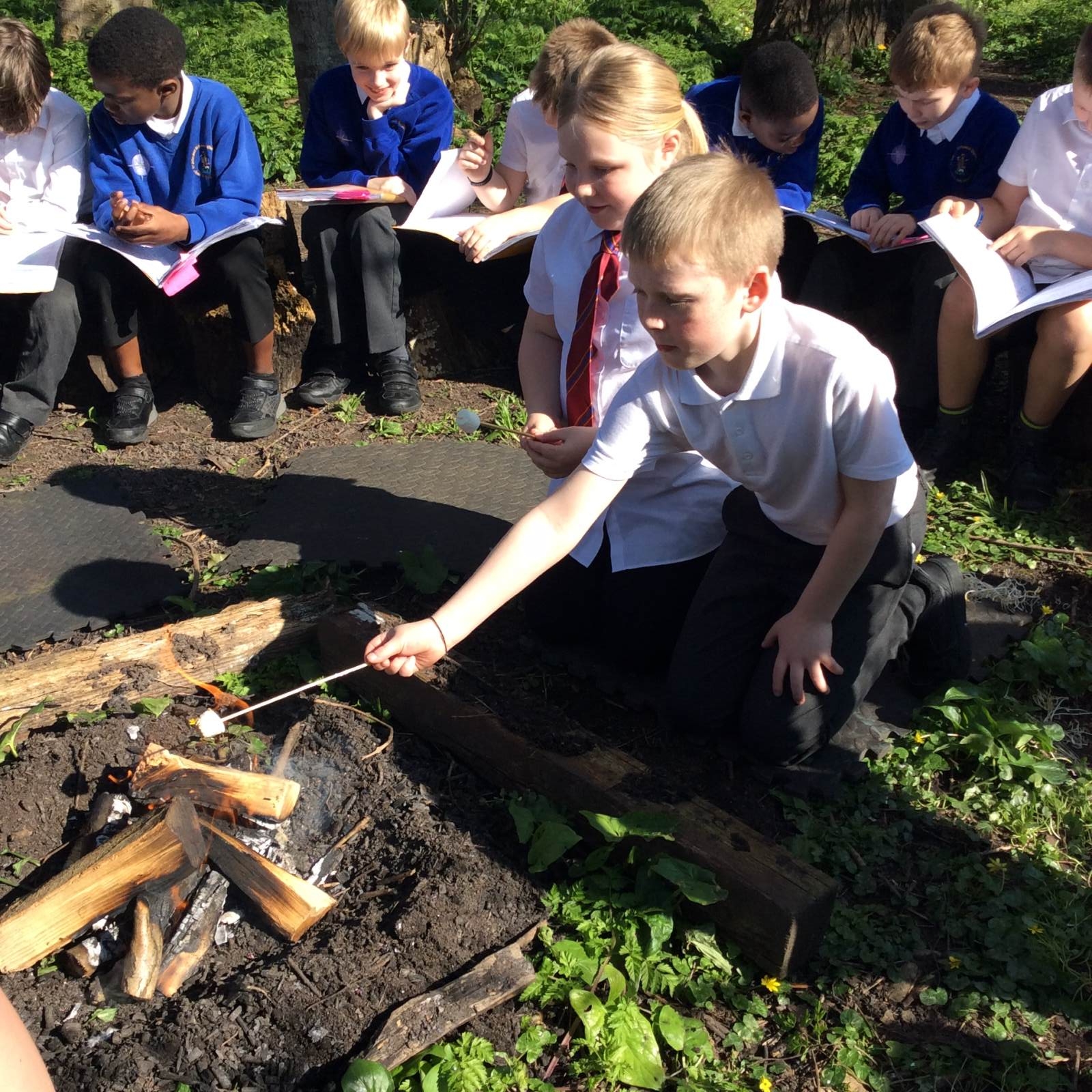 We headed out to our Forest School area, where the children gathered around a crackling campfire. Surrounded by nature, the setting created the perfect atmosphere and ambience for storytelling. In pairs and small groups, the children bravely read aloud their “scary stories,” using expressive voices to build suspense and keep their audience on edge!