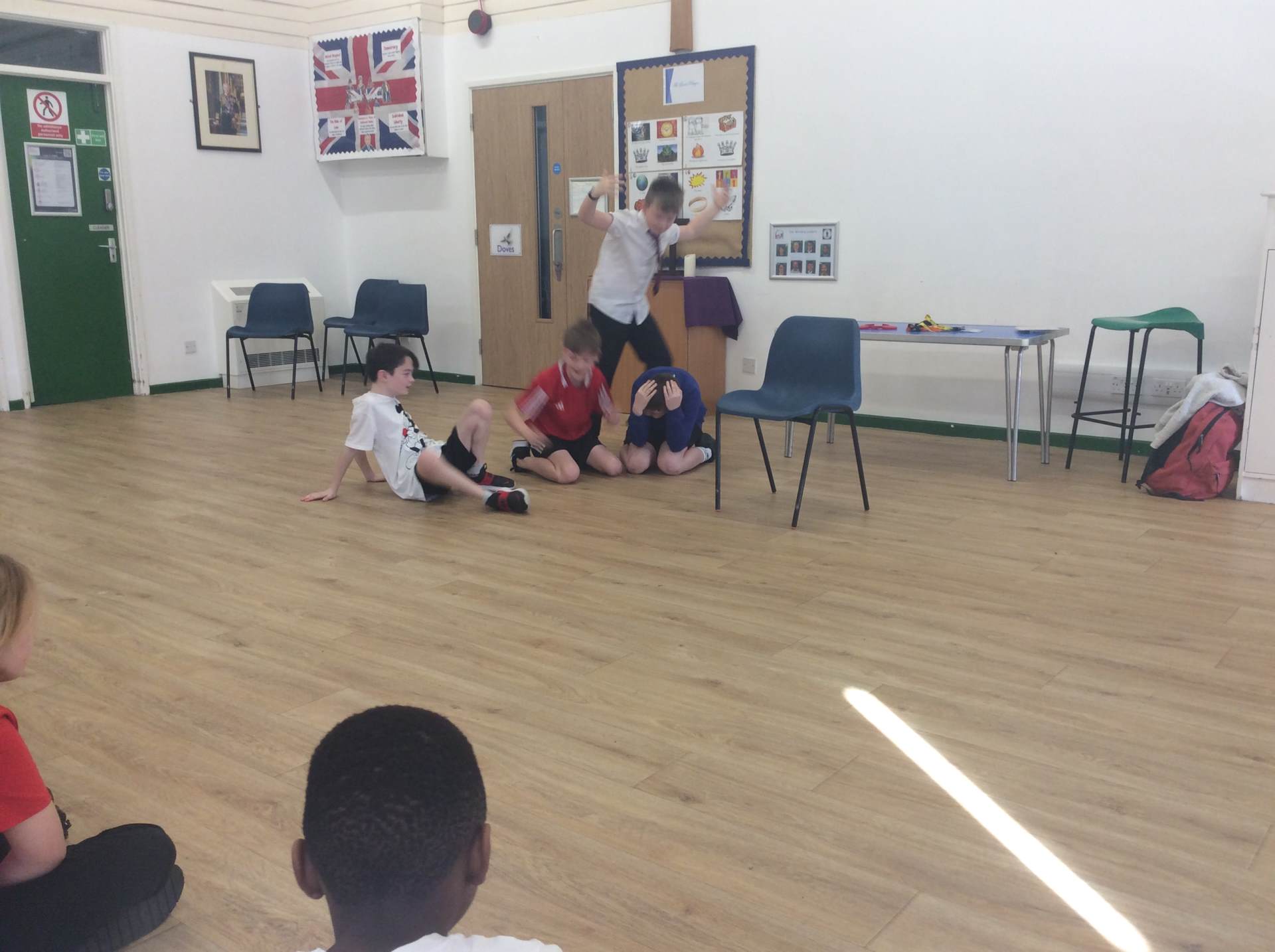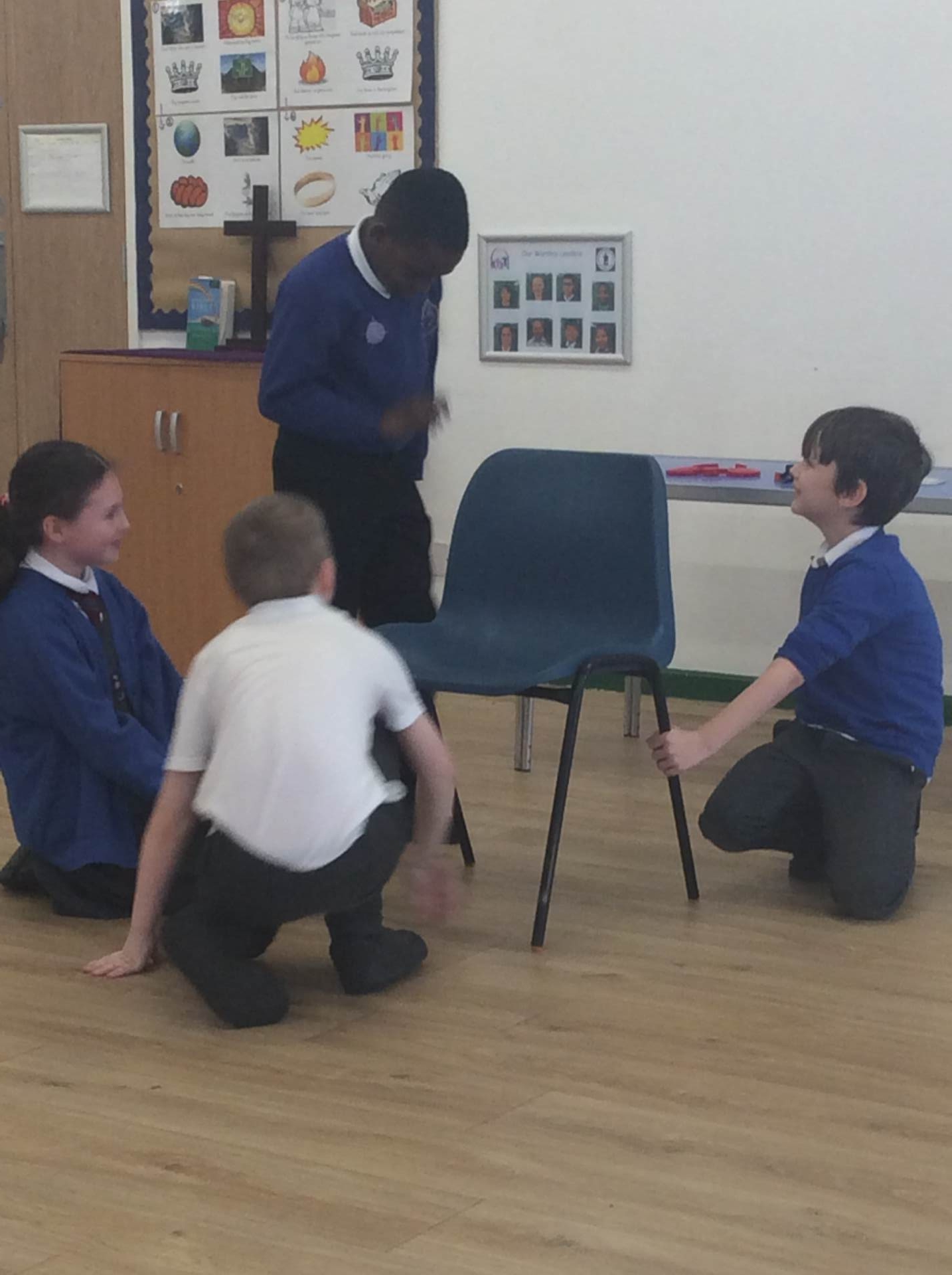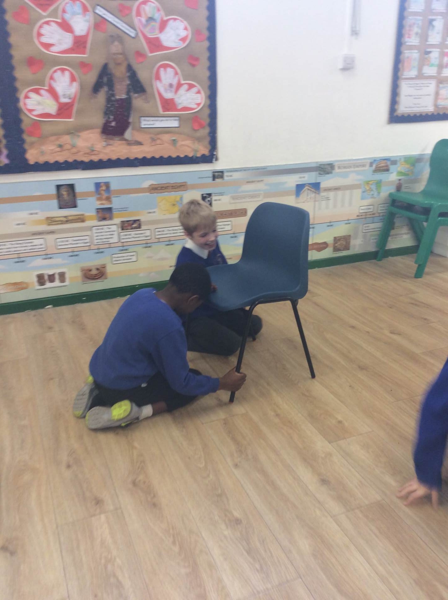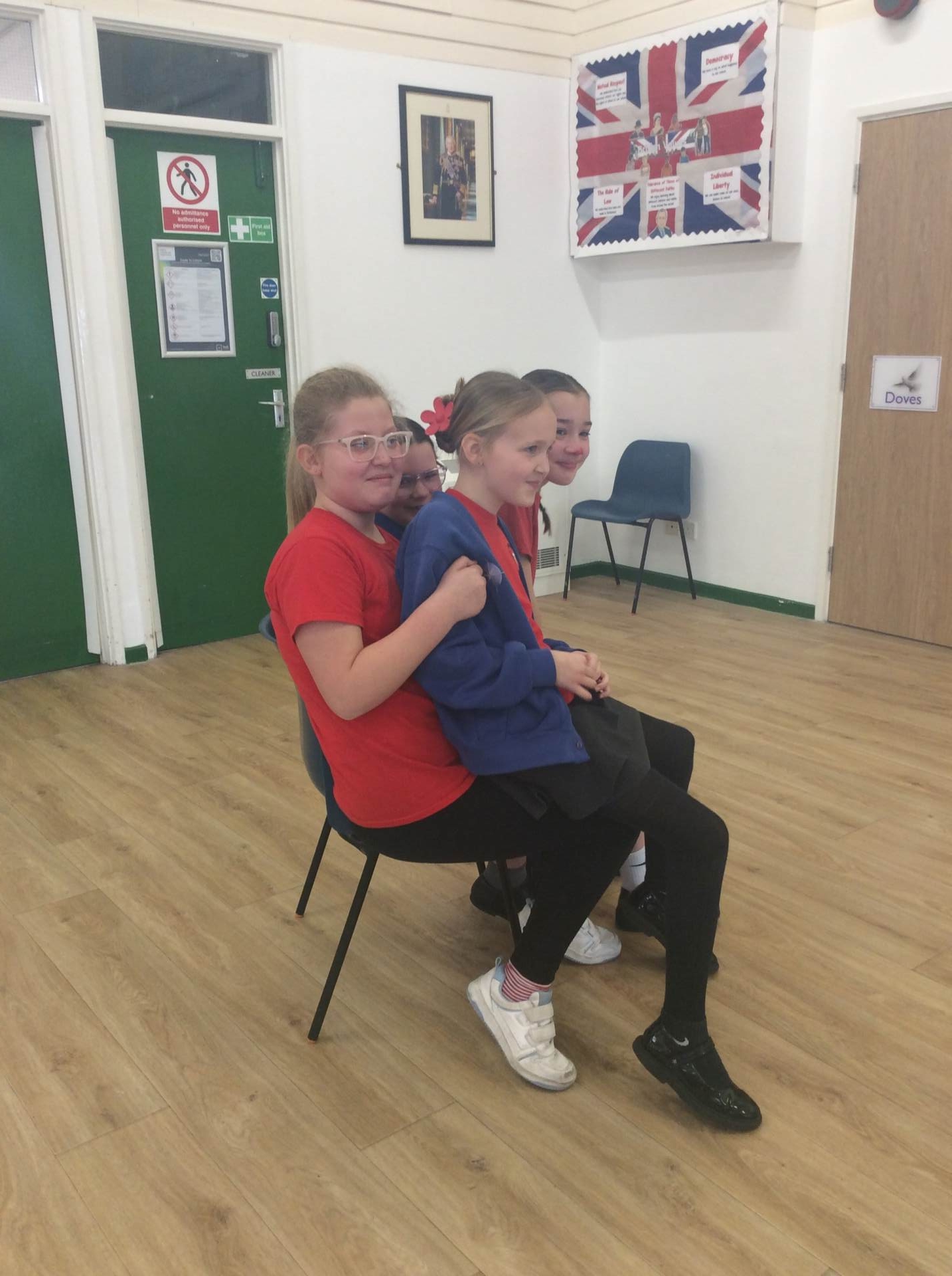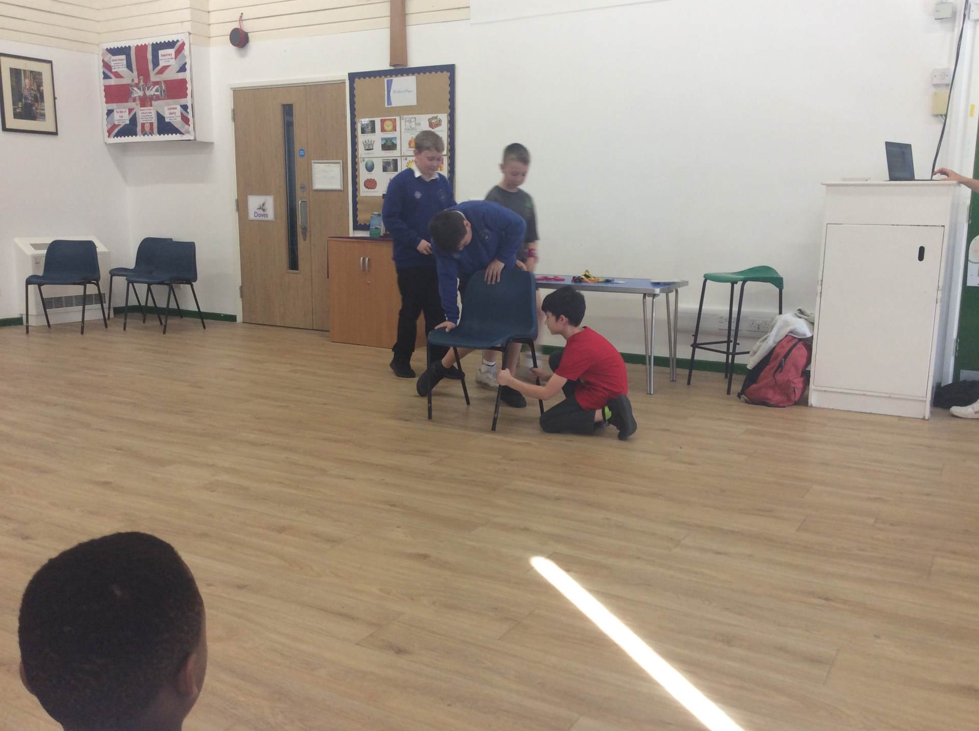 Another activity involved pretending to pick up a chair that was stuck to the ground This helped us develop our mime skills further and think carefully about weight, balance, and realism. We built on this by working in pairs, before progressing into groups of four.