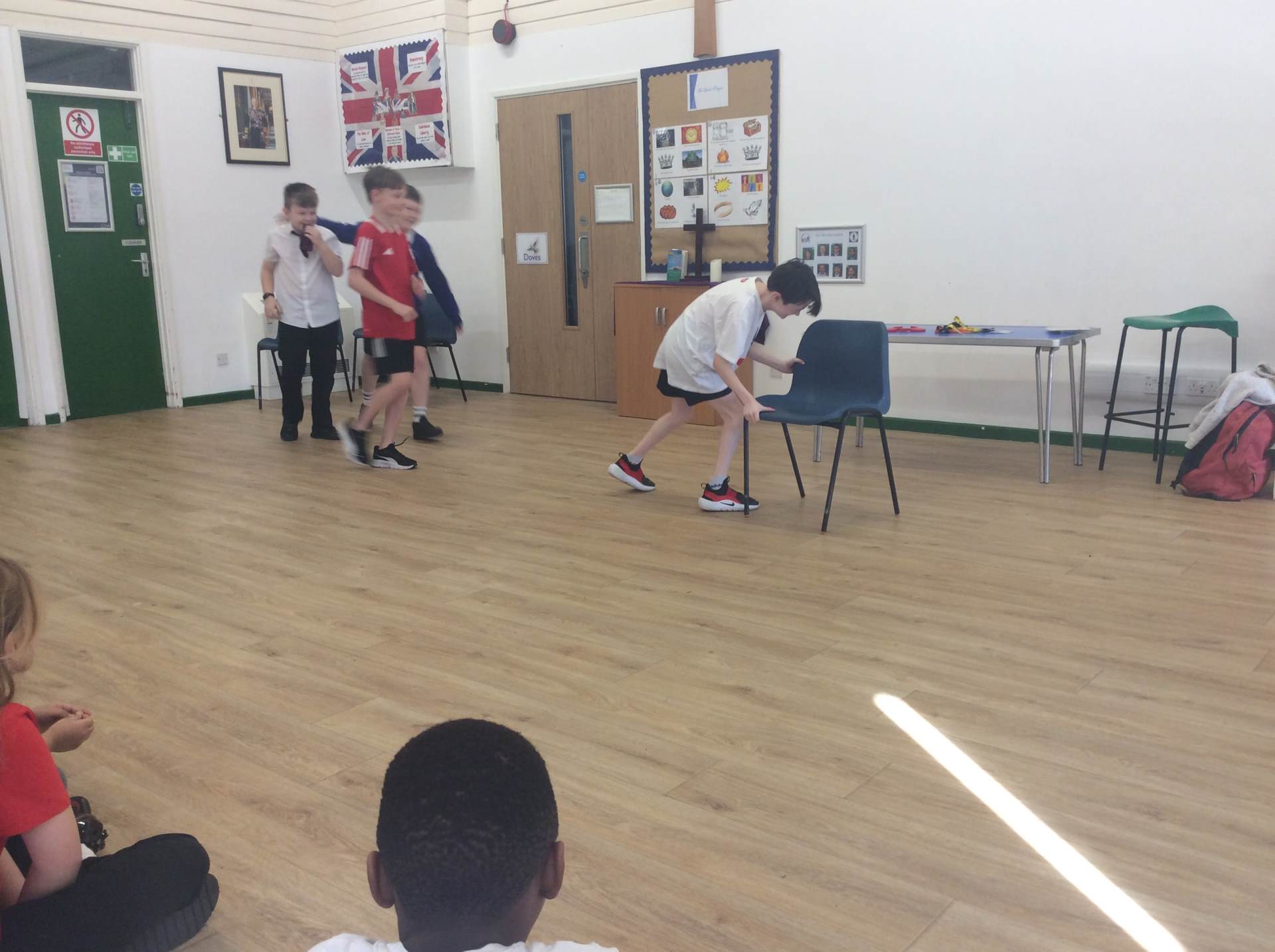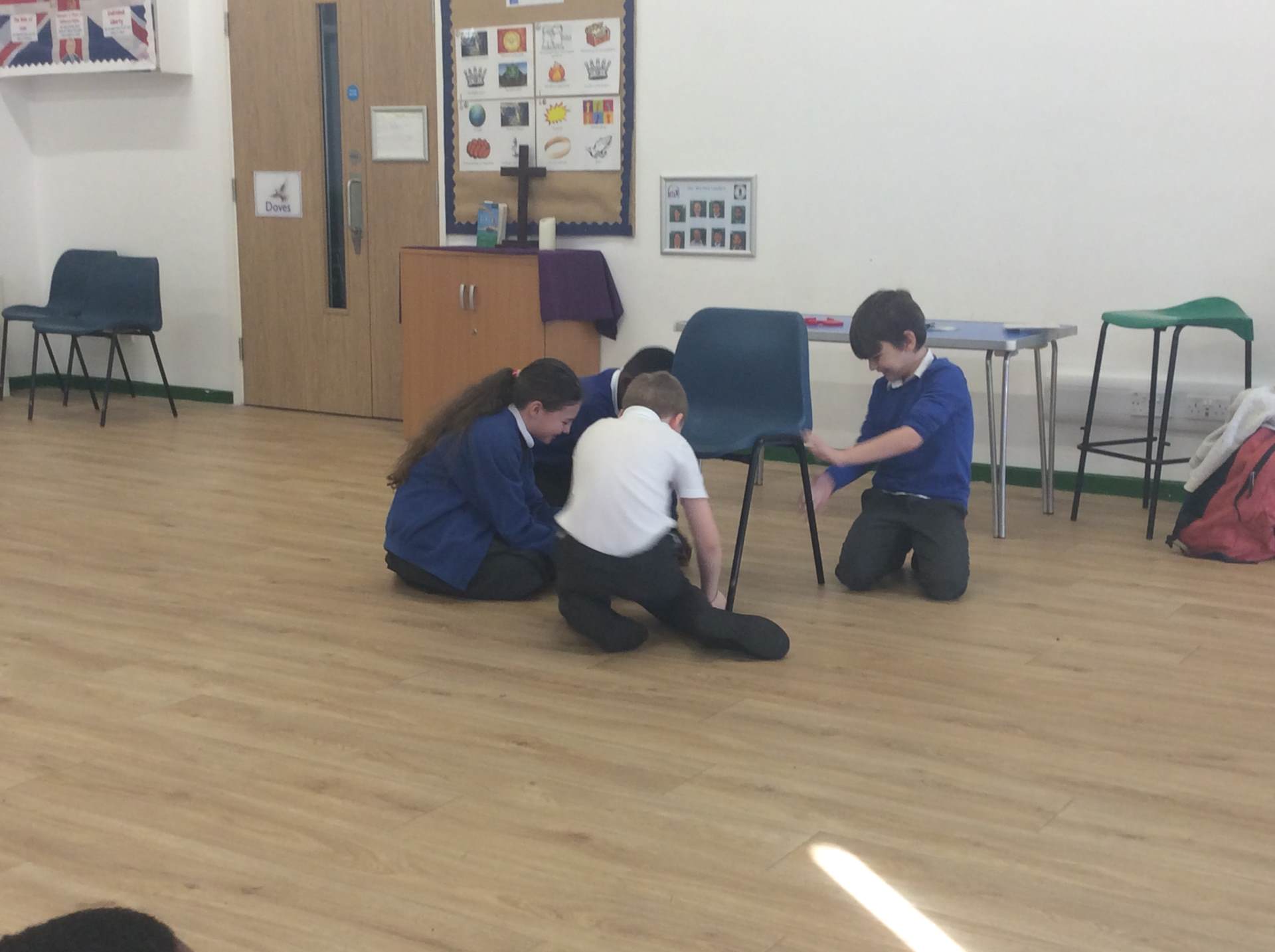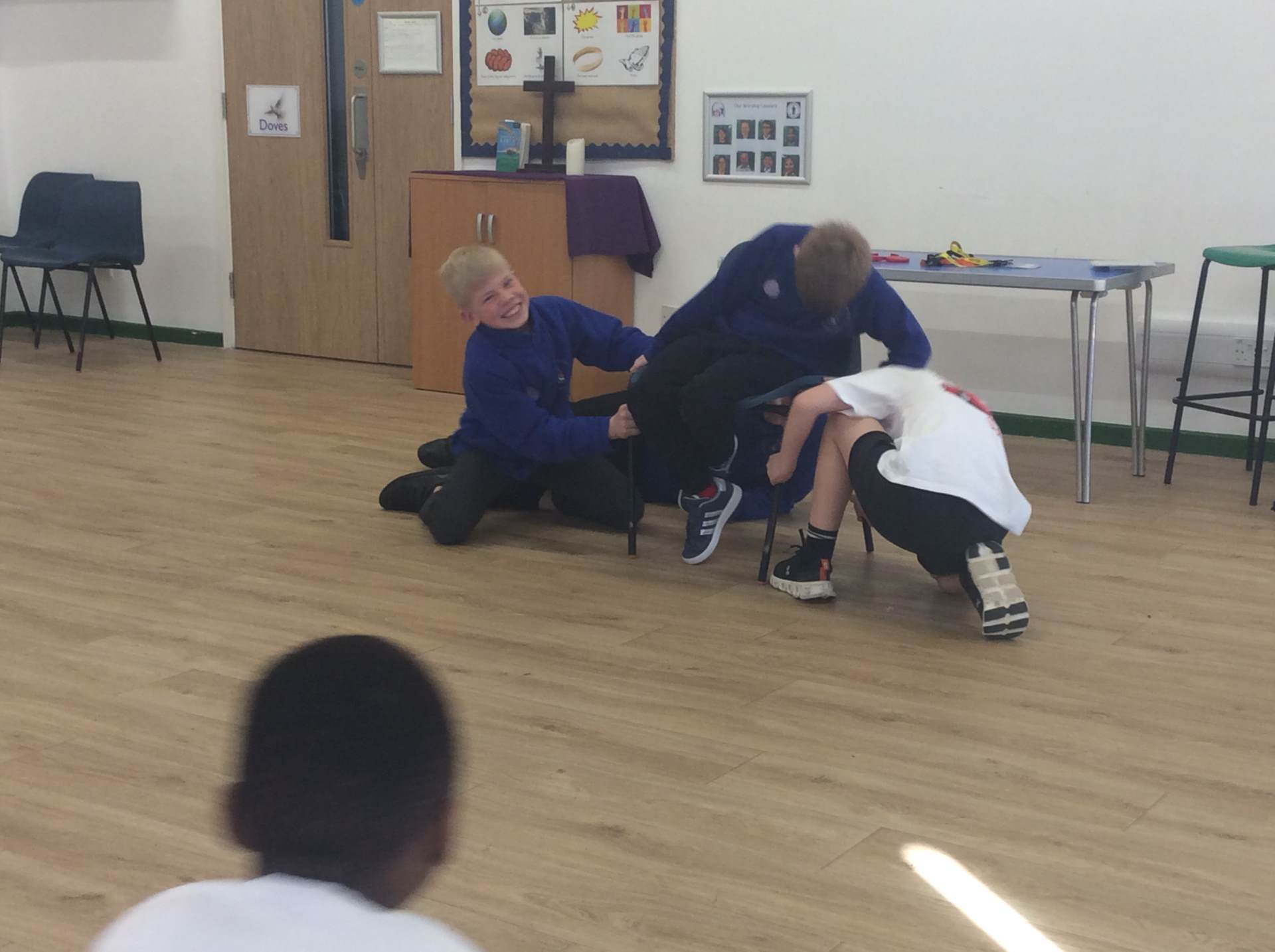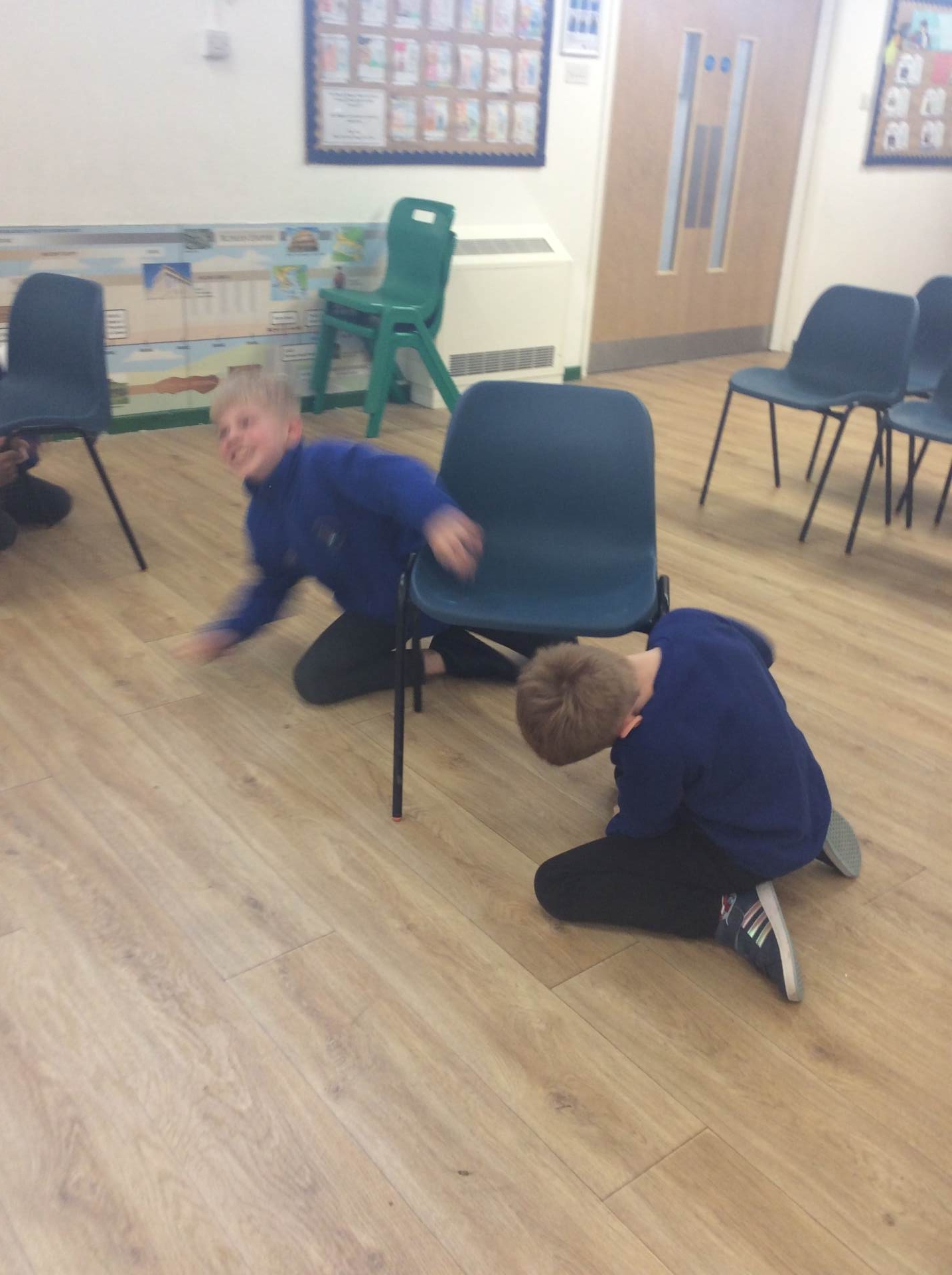 Another activity involved pretending to pick up a chair that was stuck to the ground This helped us develop our mime skills further and think carefully about weight, balance, and realism. We built on this by working in pairs, before progressing into groups of four.