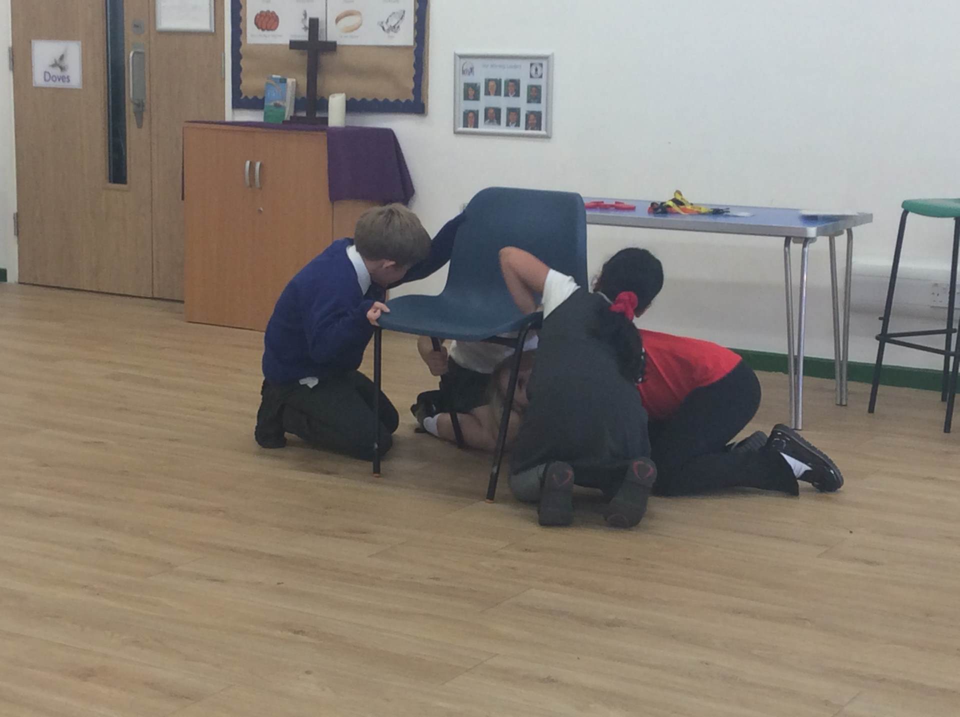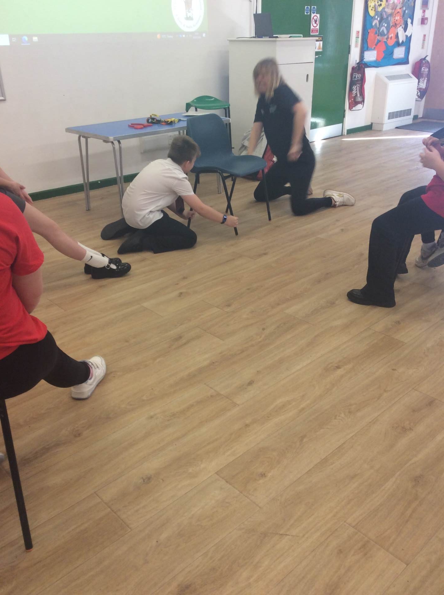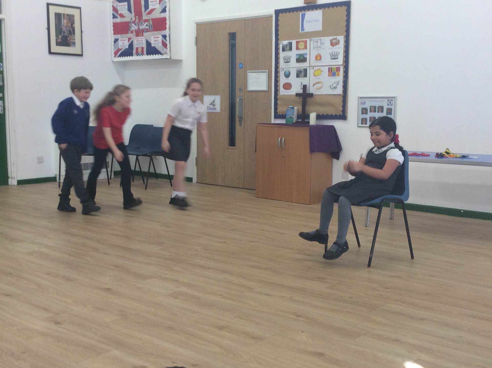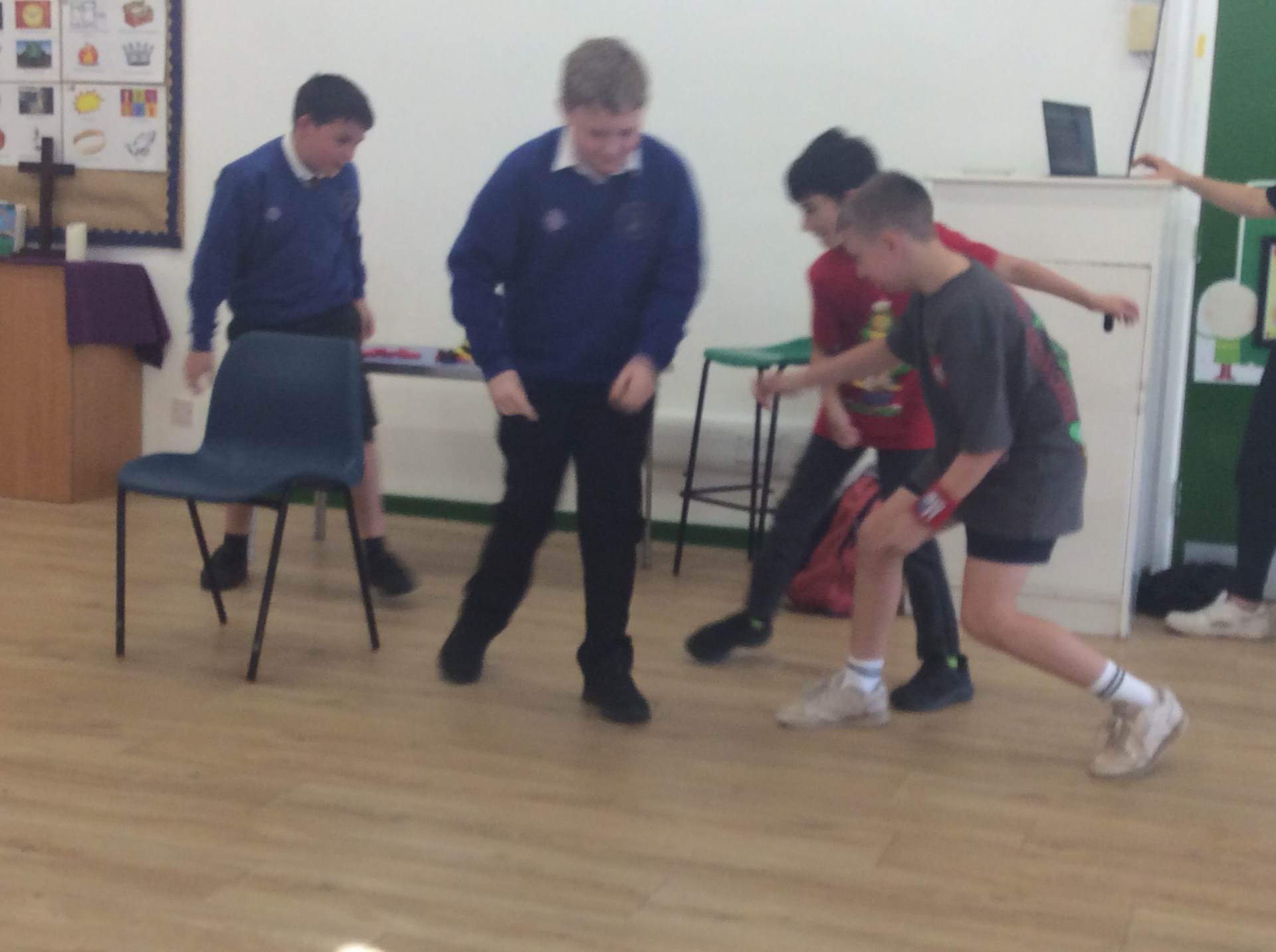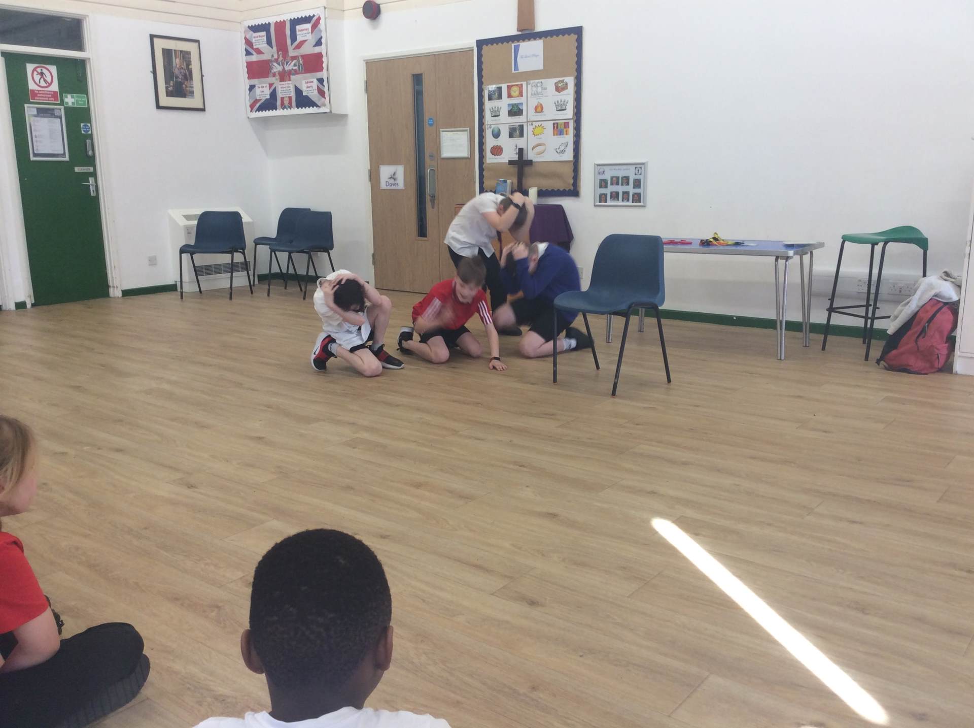 Another activity involved pretending to pick up a chair that was stuck to the ground This helped us develop our mime skills further and think carefully about weight, balance, and realism. We built on this by working in pairs, before progressing into groups of four.