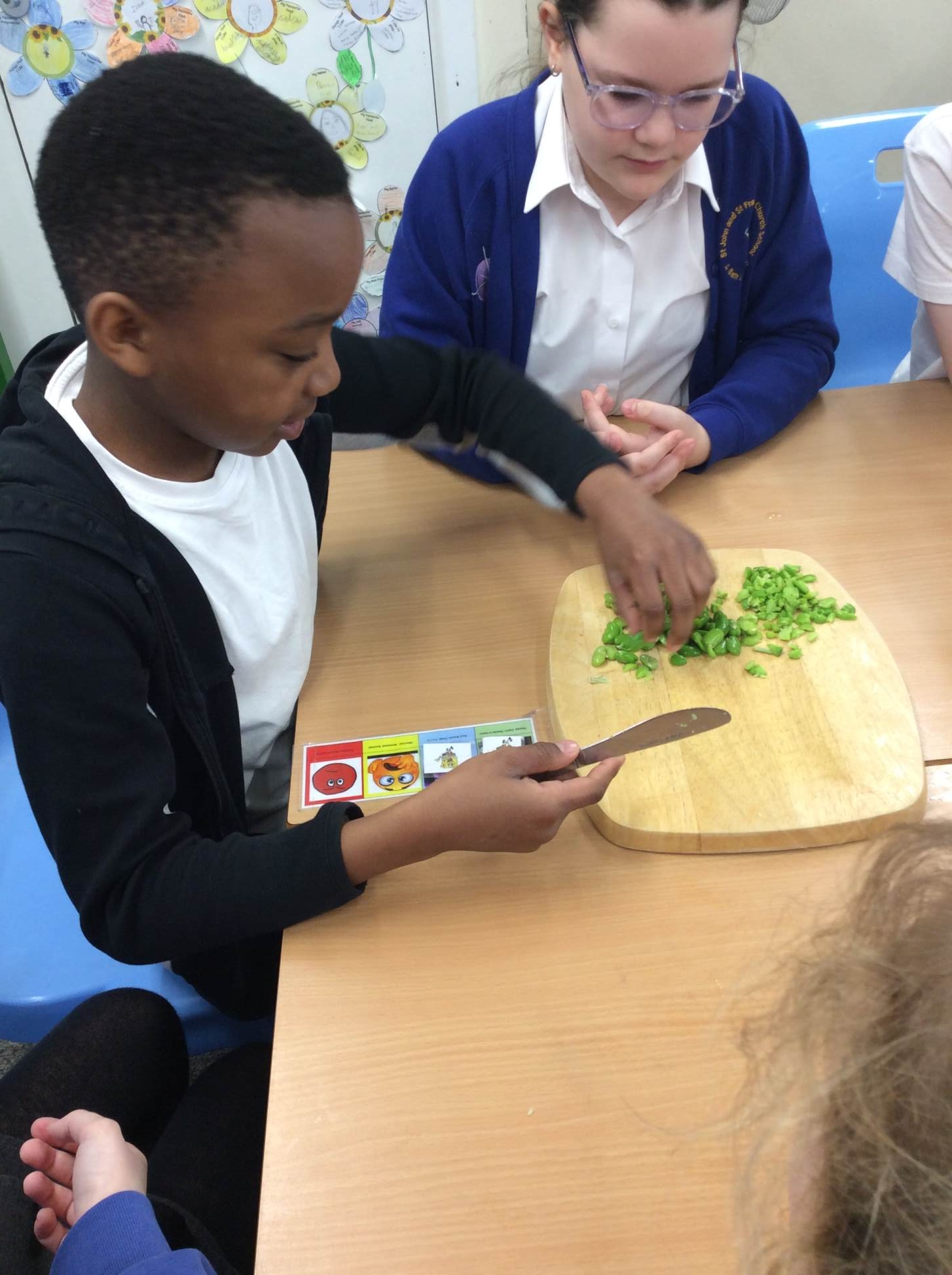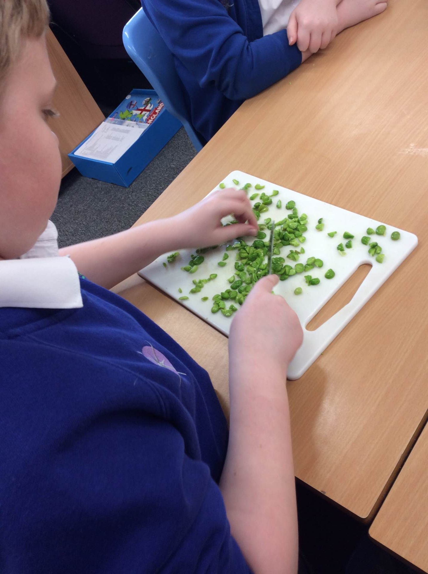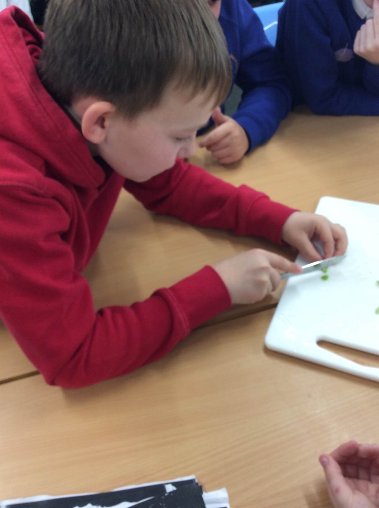Next came the chopping stage, where they practiced safe knife skills and explored textures and shapes.