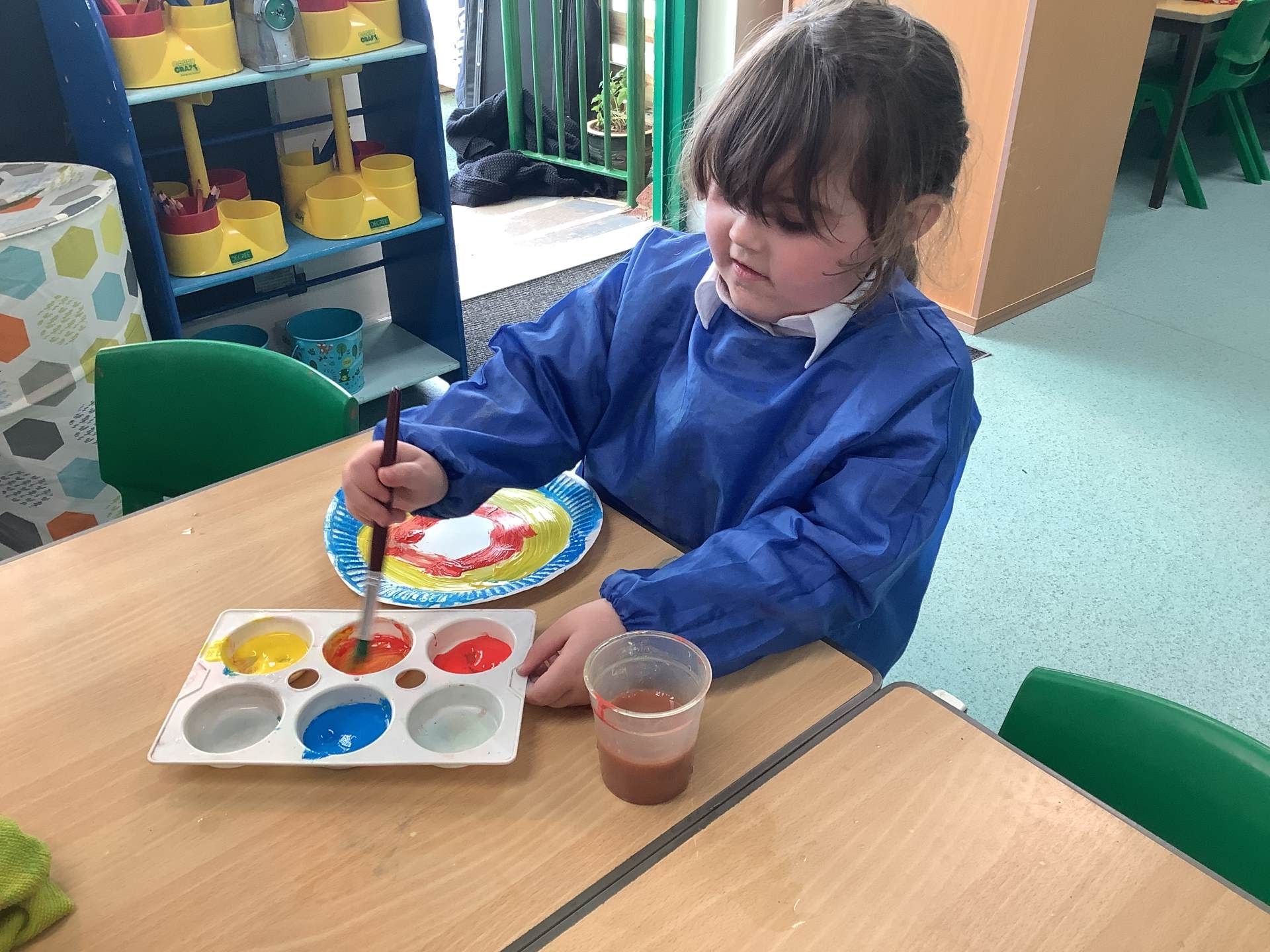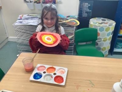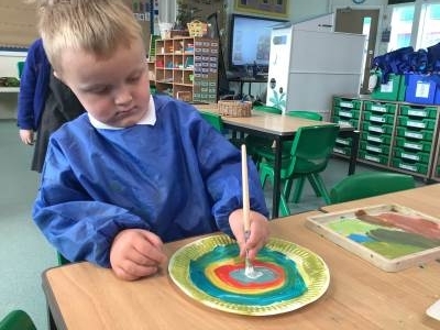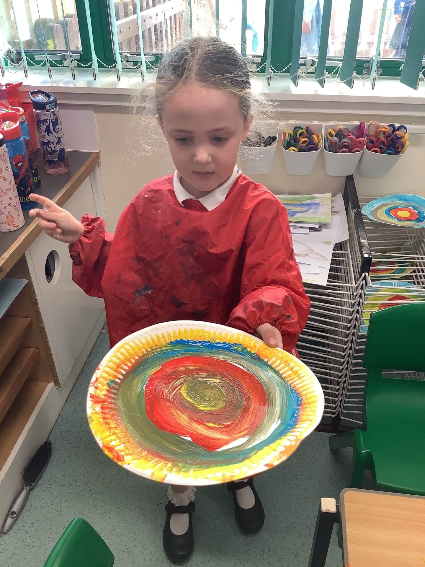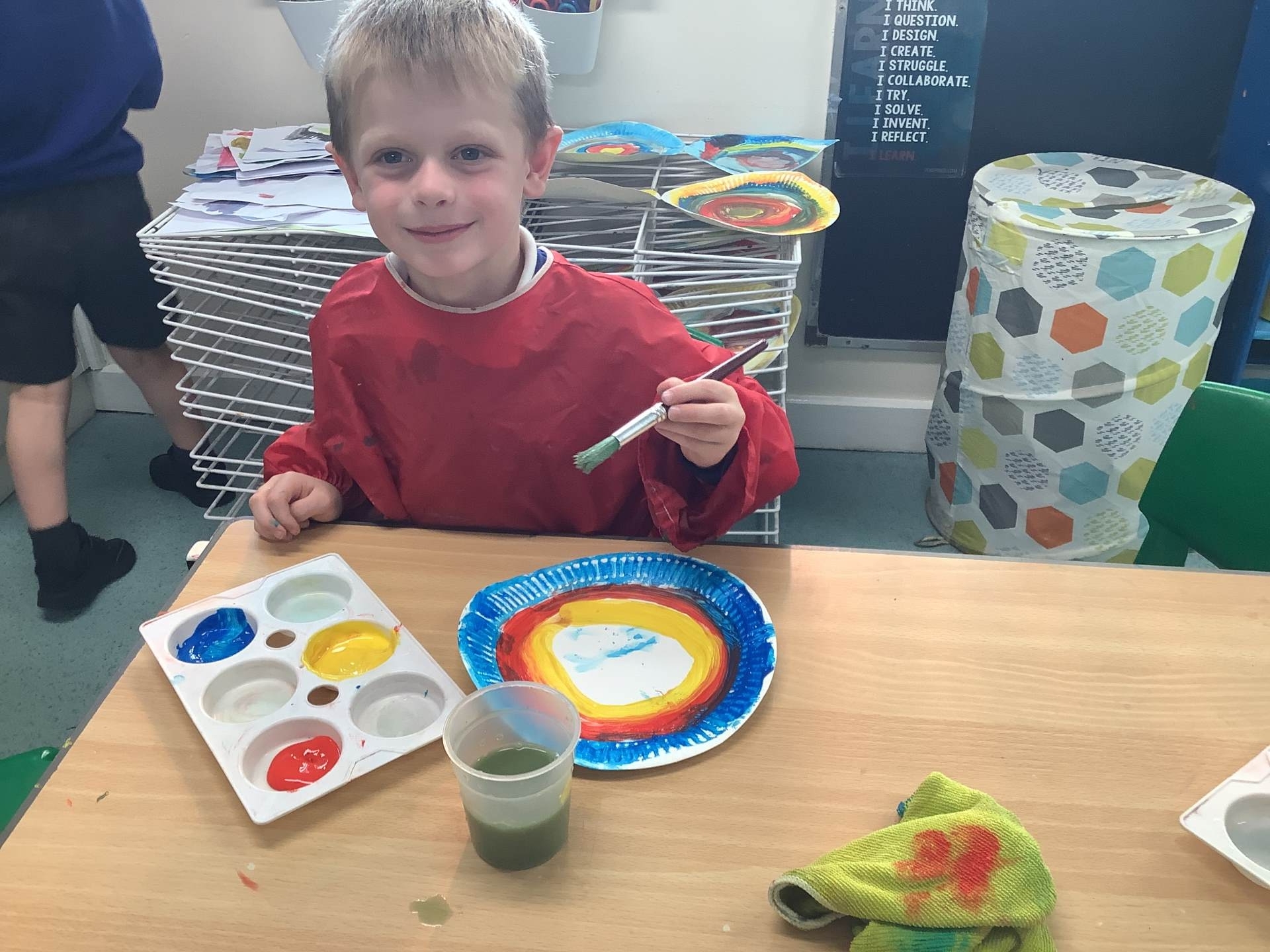 We have been learning a little bit about the famous artist Kandinsky, who lived a long time ago. We looked at some of his paintings and learned the word ‘abstract’. This means that they do not look like ‘things’. We noticed that he liked to use bright colours and different shapes. We had a go at creating our own painting, in the style of Kandinsky’s concentric circles. We mixed our own colours of paint and made circles, starting from the centre and moving outwards. Here are some pictures to show our masterpieces!