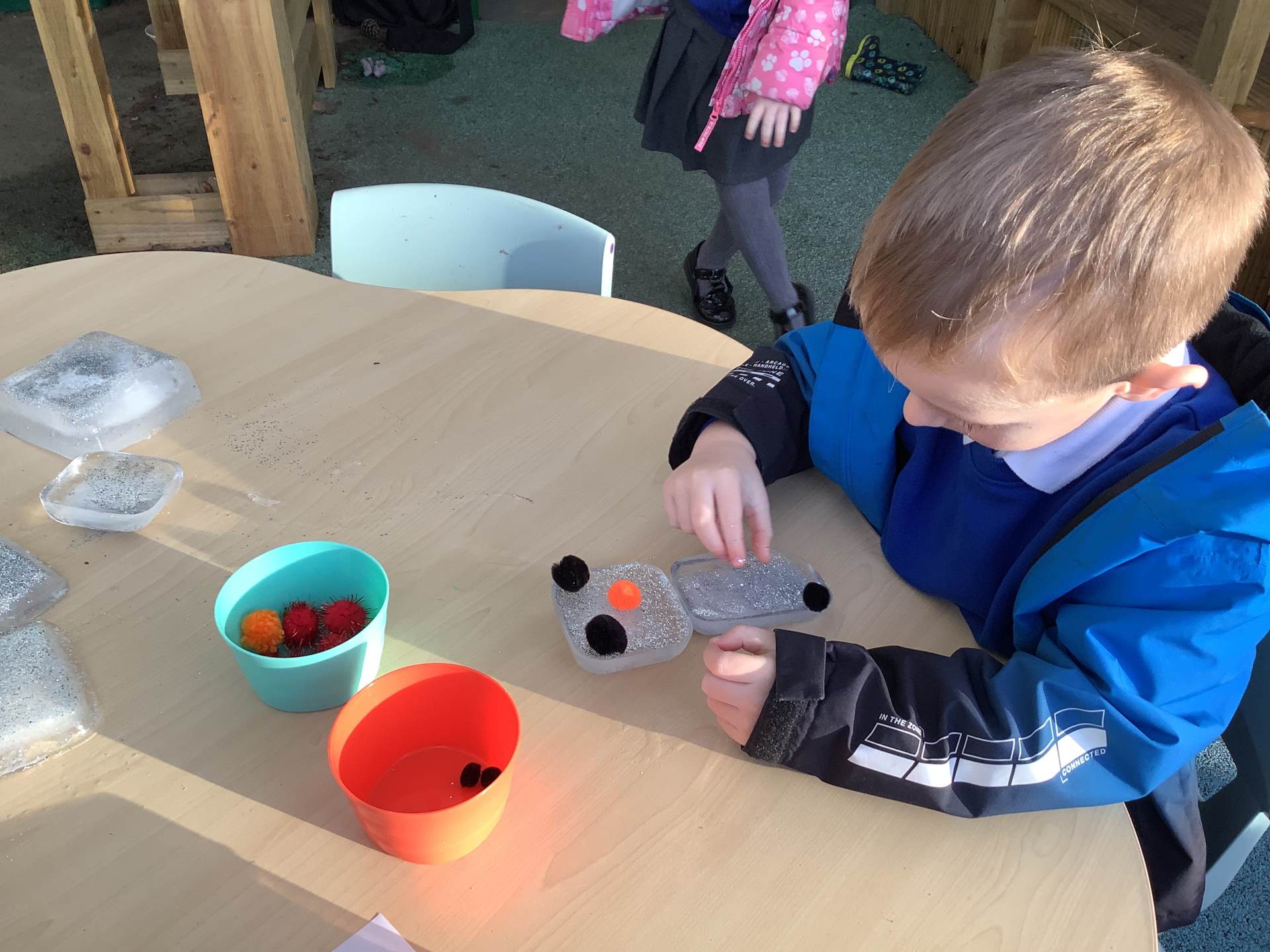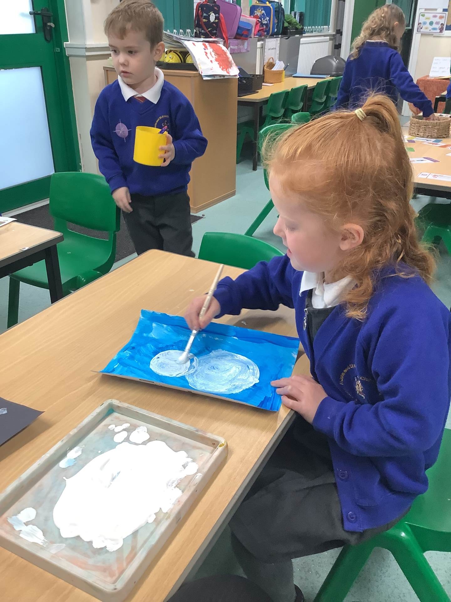 Back in the classroom, Wren Class watched a time-lapse video showing how frost forms, supporting their Understanding of the World learning. We looked at "jewel webs" on the board. They then created their own frosty-inspired artwork, exploring texture and pattern.