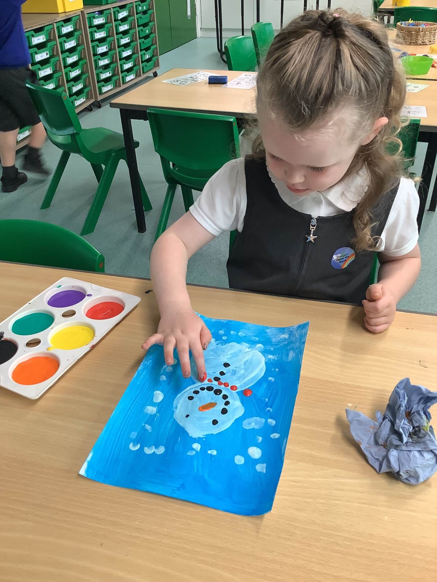As part of a special festive art activity, Children across the school have been designing their own Christmas cards. Our children designed their very own Christmas cards featuring a charming snowman they used their fine motor skills to paint the snowman and made it unique by using our finger prints.