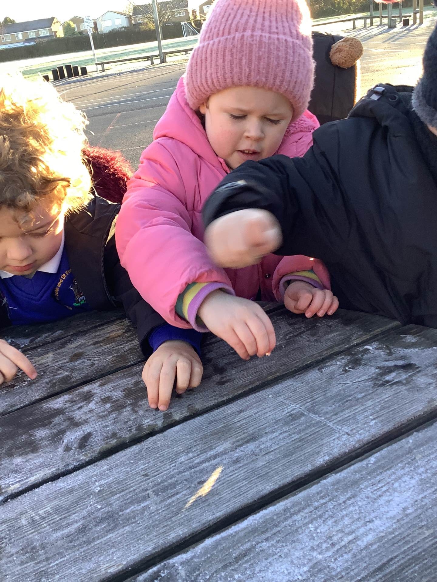 This morning, Wren Class headed outside with Mrs Curtis and Miss Weatherby to explore the frost. The children immediately noticed how cold it felt and enjoyed making marks in the frost, drawing patterns and leaving handprints—great opportunities for Early Years mark-making and creative expression.