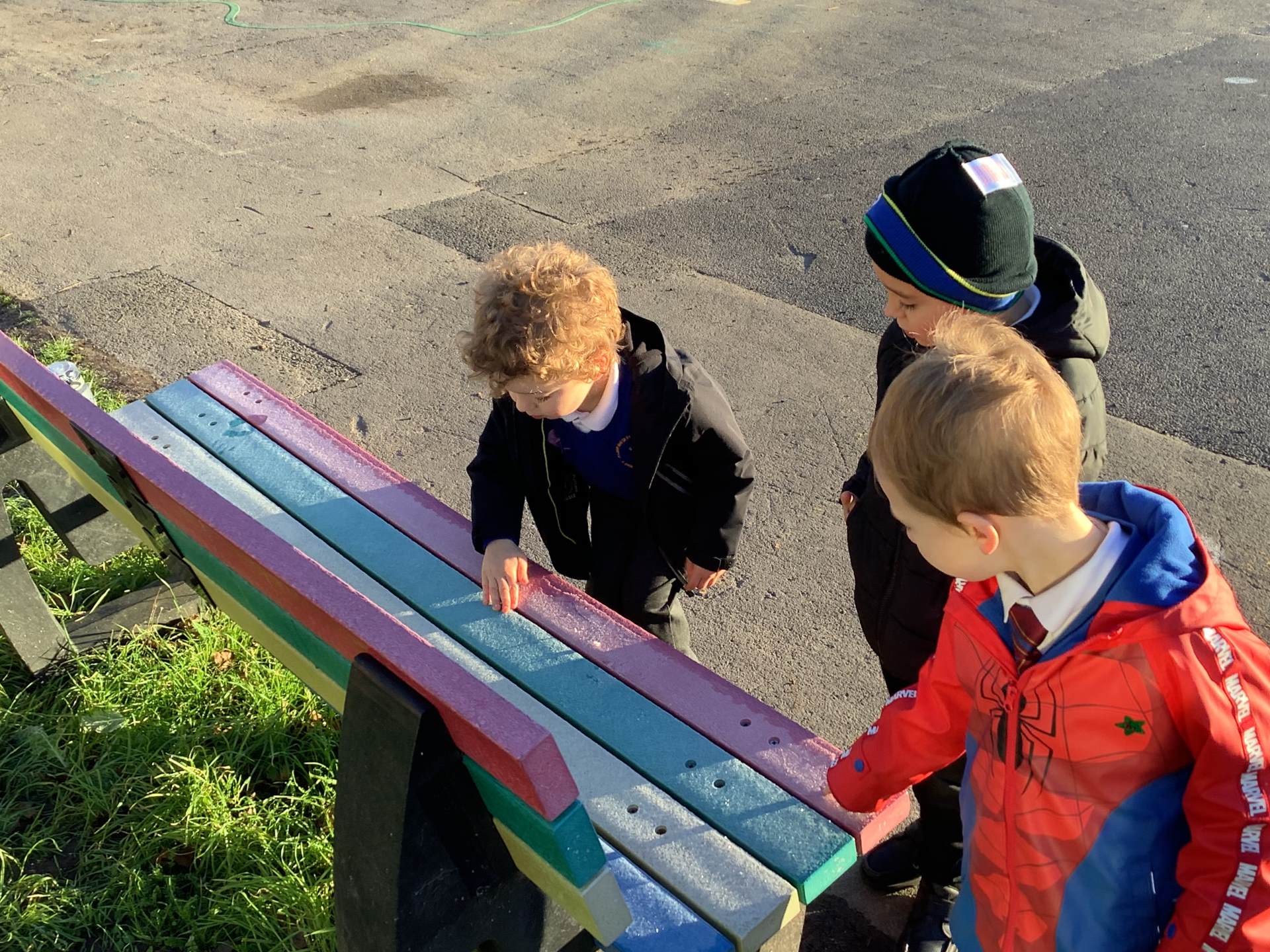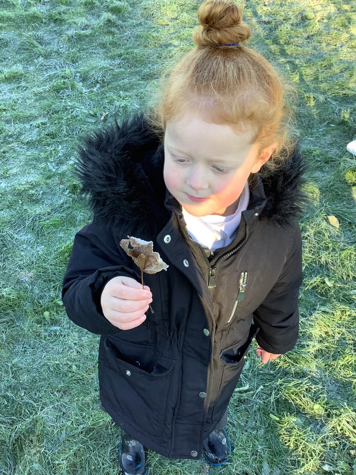 As we walked across the grass, the children heard the “crunchy” sound under their feet. When we reached the trim-trail area, they observed how slippery it was, helping them understand how we keep ourselves safe in different weather conditions, linking to Personal, social and emotional development.
