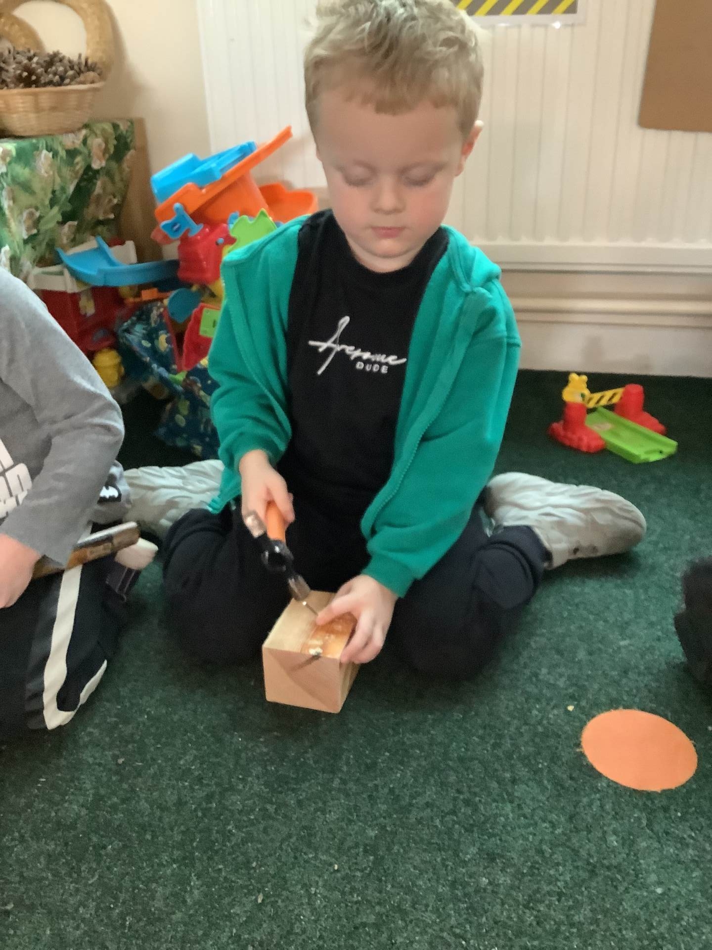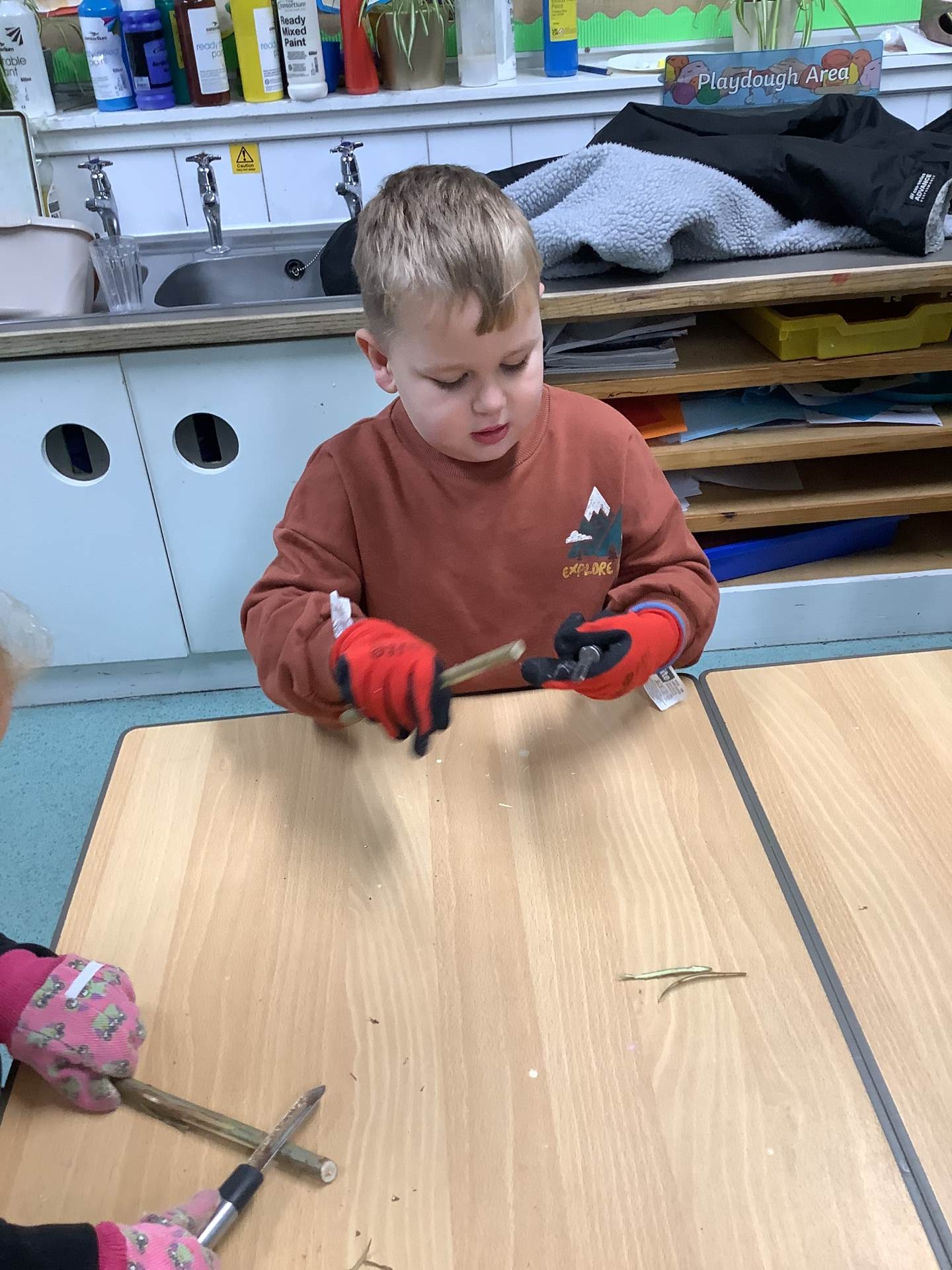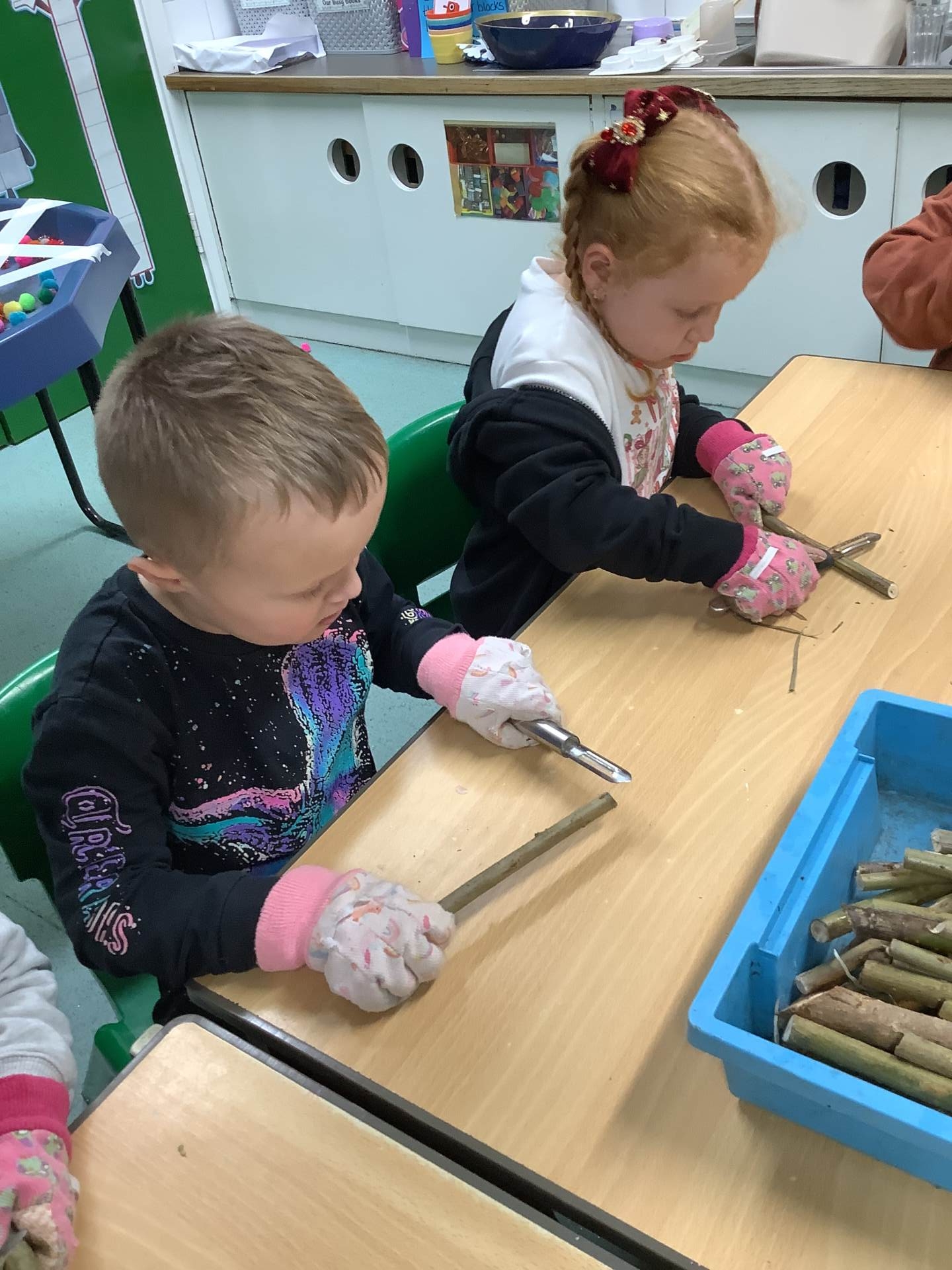 This week we learnt how to manipulate and use tools safely. We had to use our fine motor skills to whittle our sticks using potato peelers and we used hammers and nails safely! We all had great fun and learnt some new skills along the way.