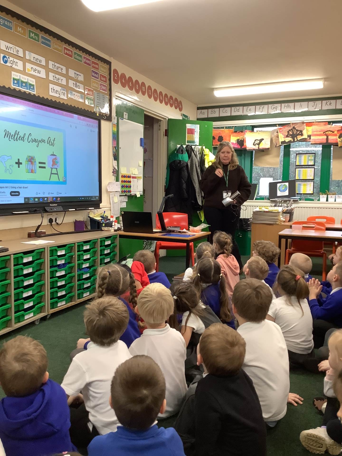 Then the children worked with Mrs Hart. In this science activity, the children explored what happens when heat is applied to crayons. A hairdryer was used (with adult help) to gently heat a crayon placed in the center of their flower picture. As warm air blew on the crayon, the wax began to melt and spread, creating colorful patterns in the middle of the flower. This activity helped the children observe how heat can change a solid crayon into melted wax, while also encouraging creativity and curiosity about how things change.