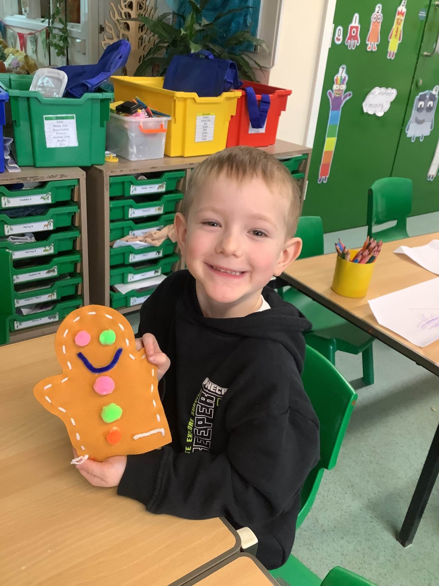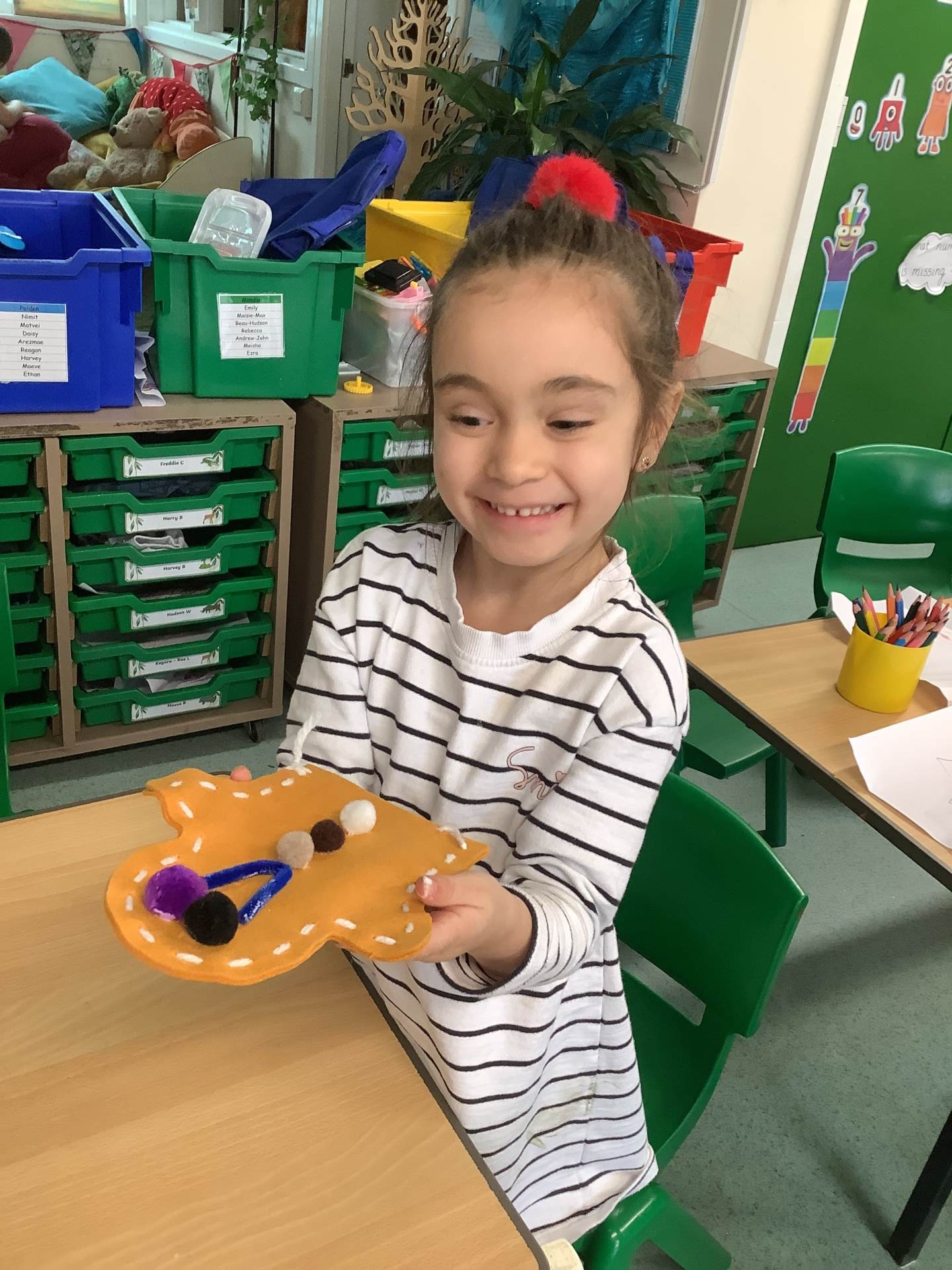 We have been making gingerbread man hand puppets. First we had to sew two pieces of felt together, threading in and out of the holes, leaving the bottom open so that our hand can fit inside. Once joined, we decorated our puppet using buttons, sequins and felt. They all look so unique! We will be able to retell the story using our puppet and toys from home.