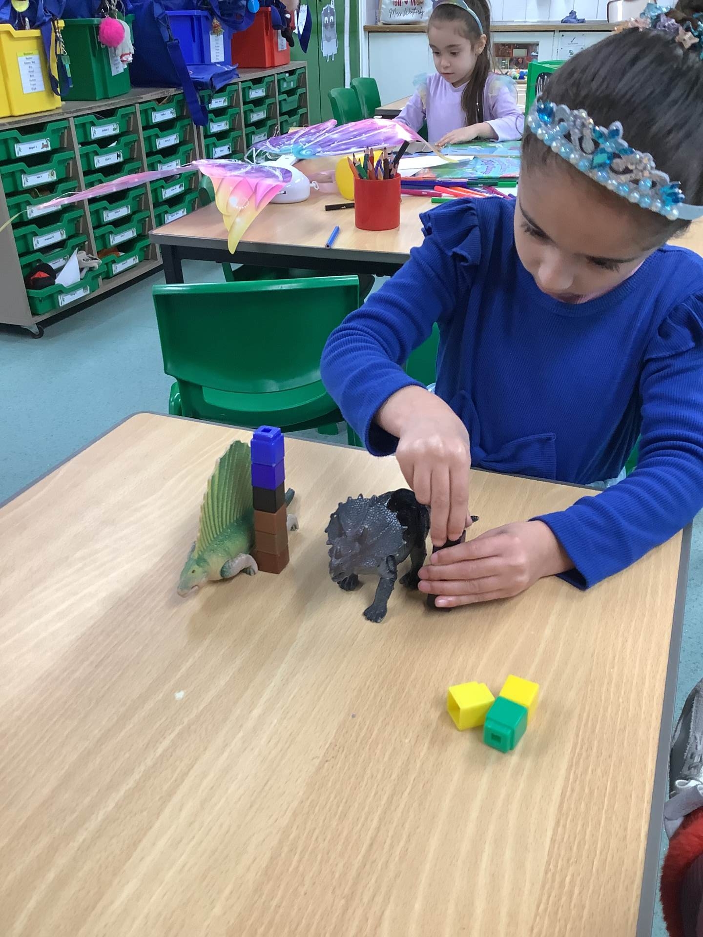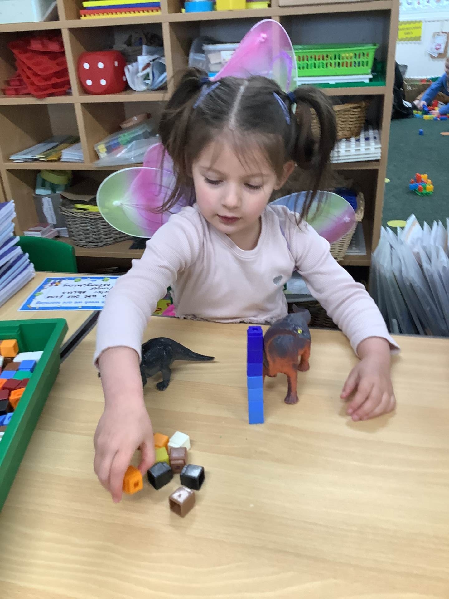 As part of our learning about Dinosaurs we enjoyed measuring them as a cross-curricular approach to our maths. We learnt the names of the dinosaurs and measured them with cubes. We used our mathematical language, such as taller than and shorter than, to describe them. Here we are measuring them.