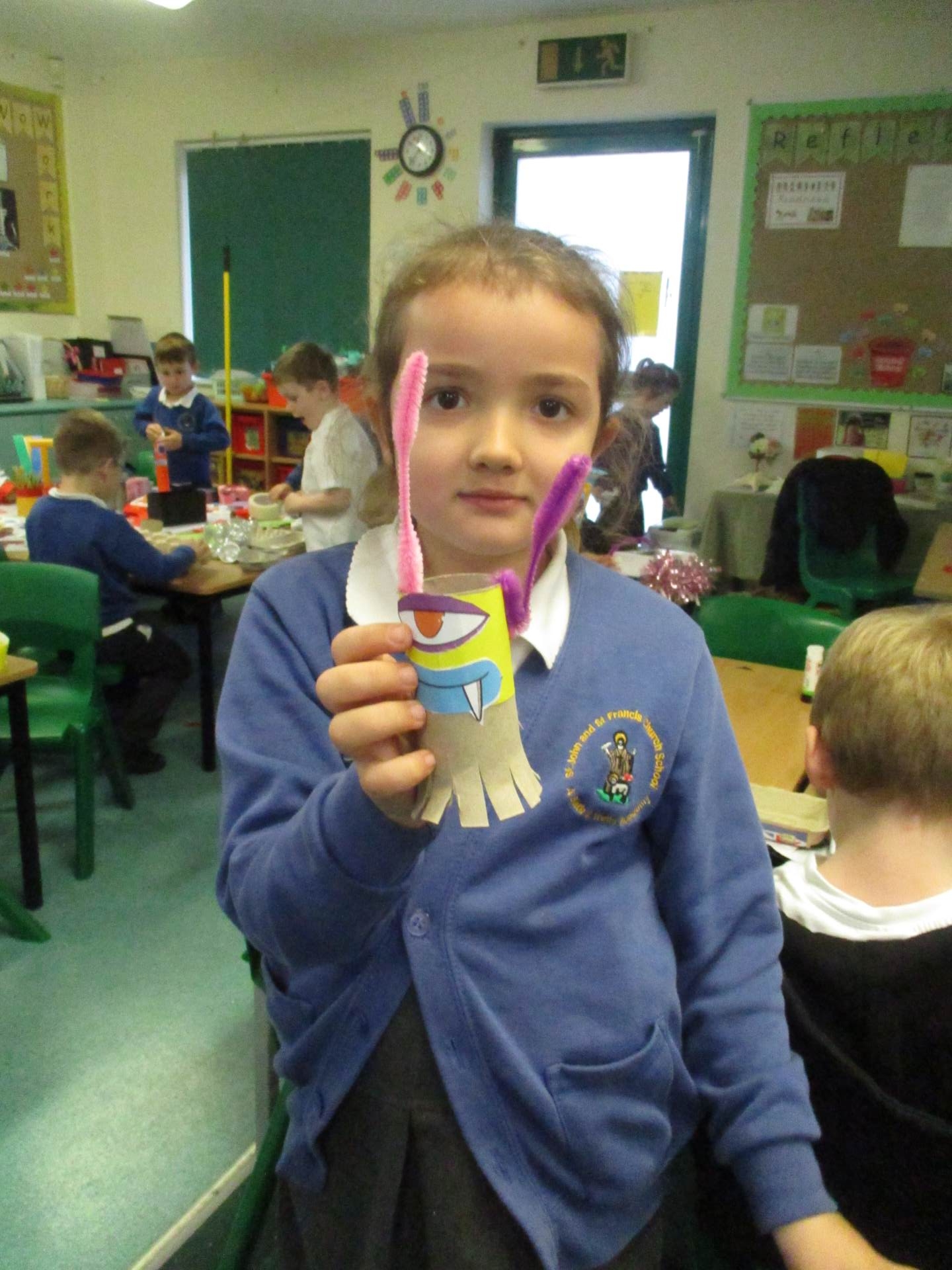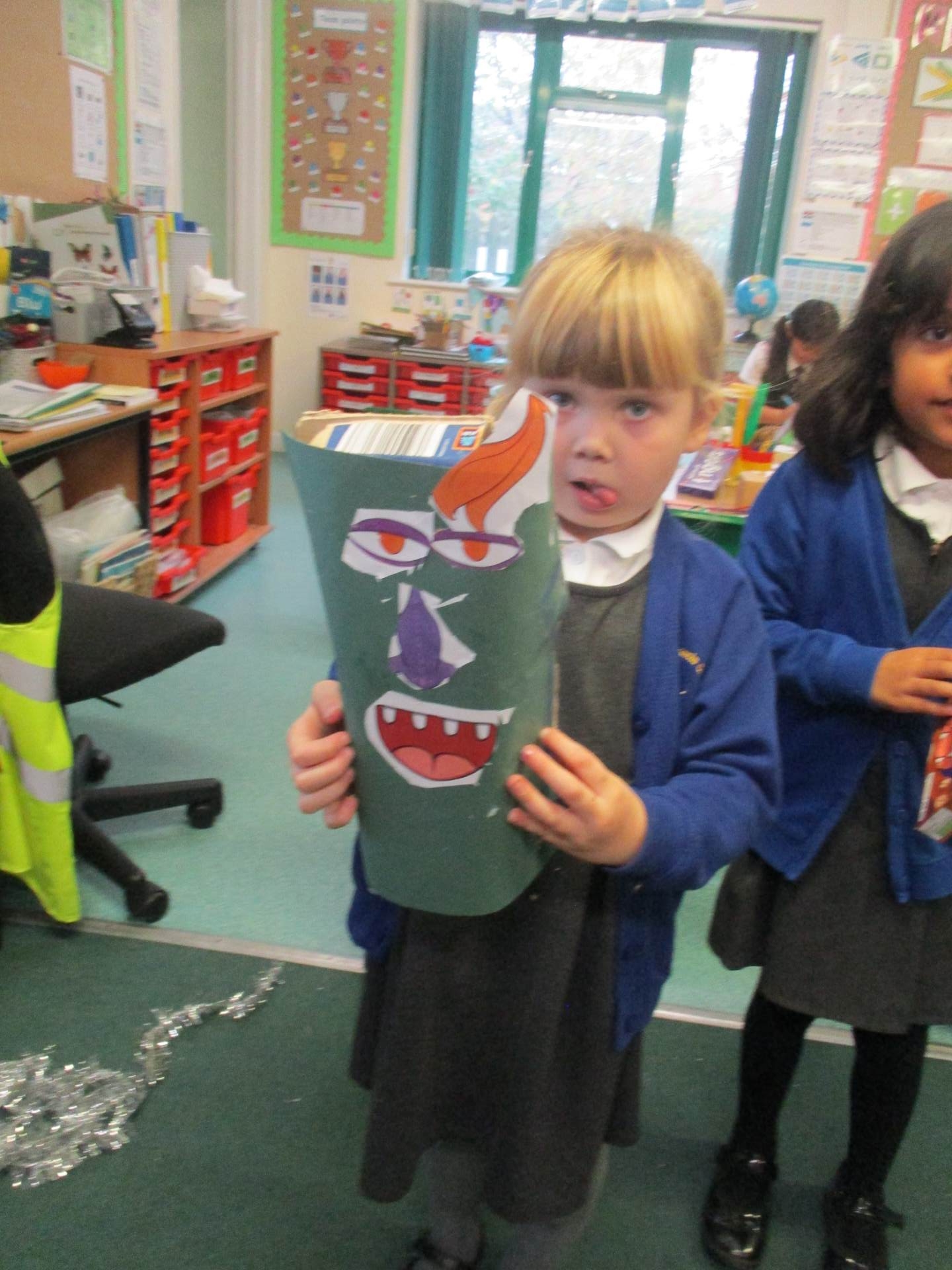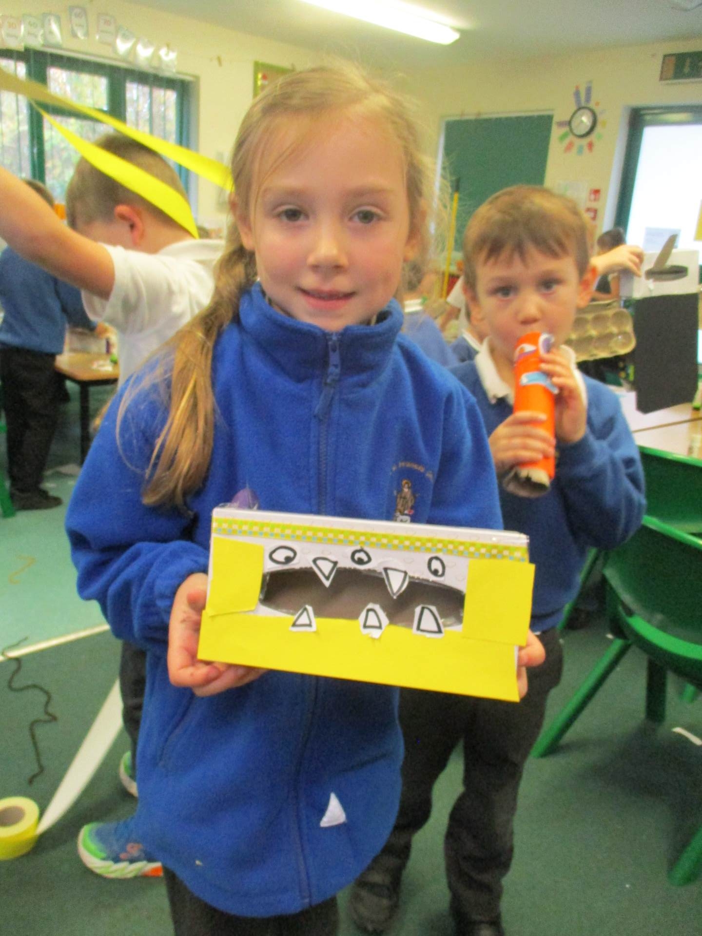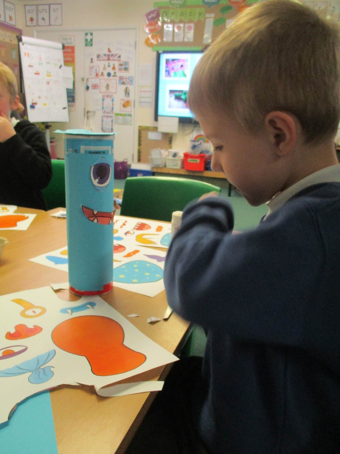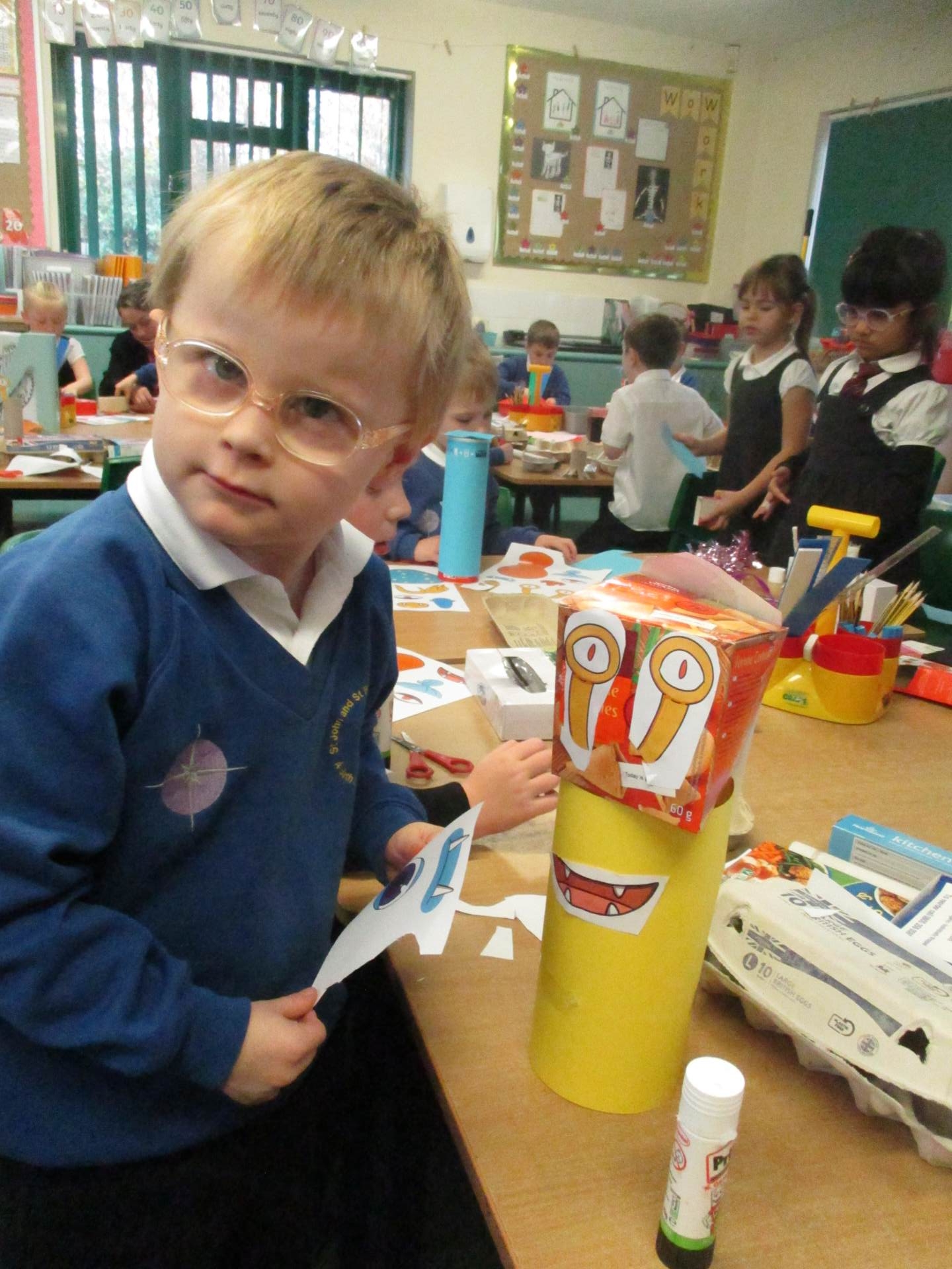 Today we listened to the story of Where the Wild Things Are. We then looked at some pictures of different cartoon monsters and agreed that a monster was quite unique and could have all kinds of different features. look at the fantastic monsters that we have created today using recyclable materials.