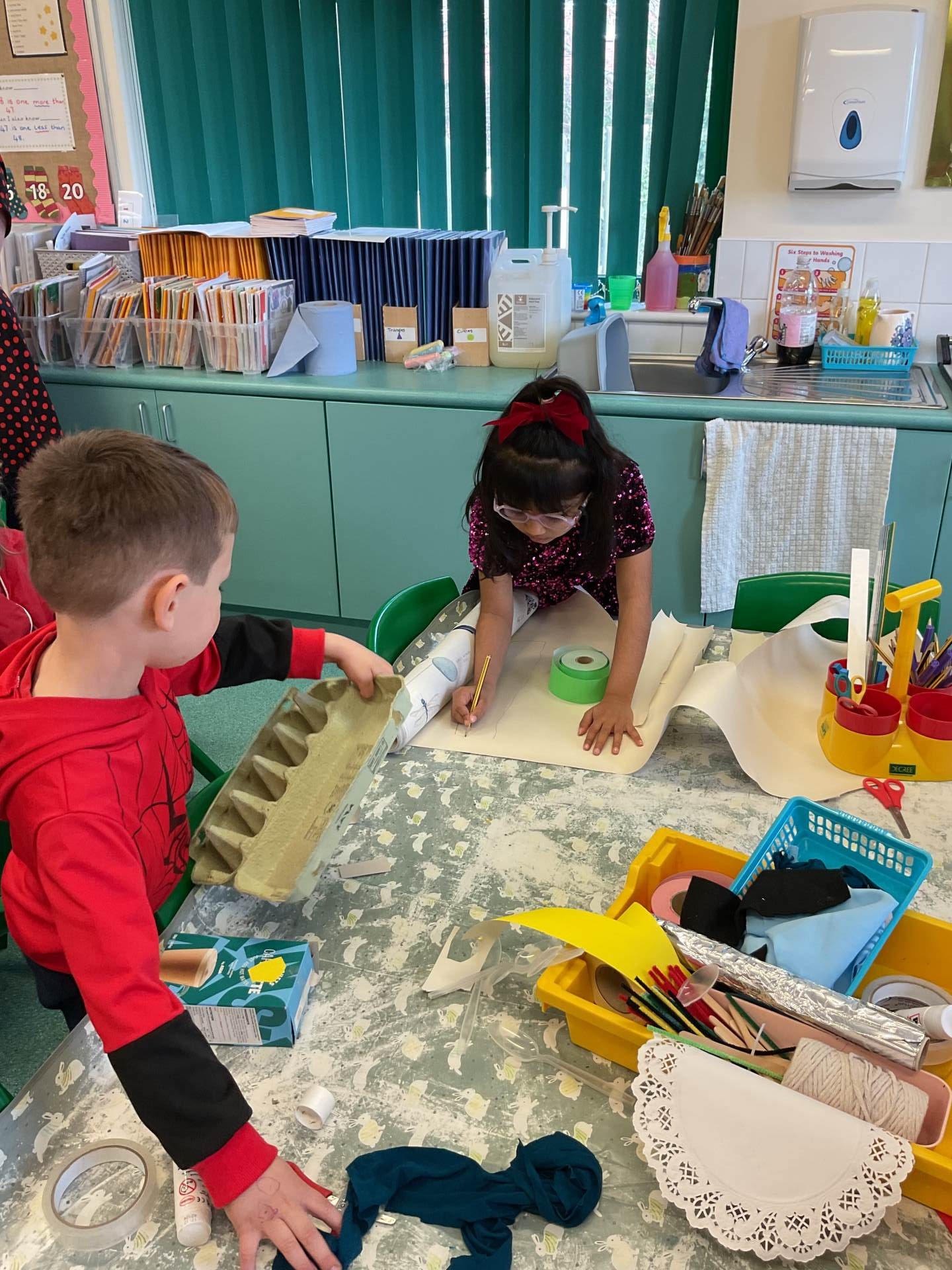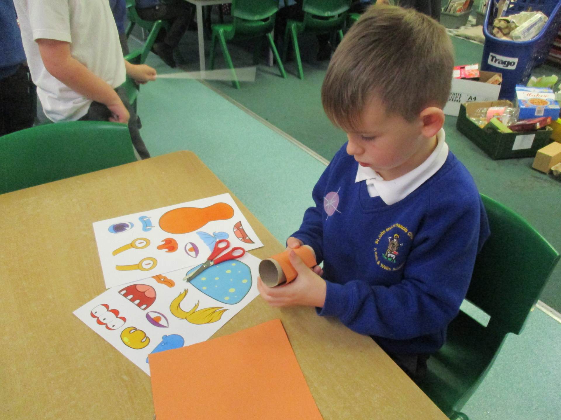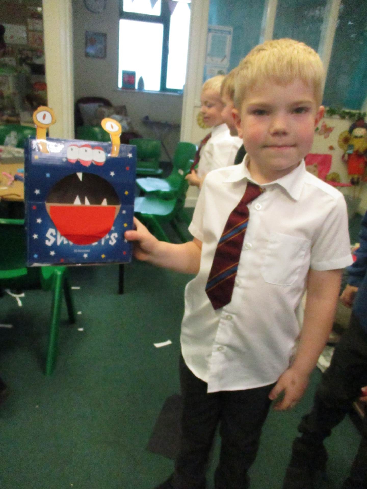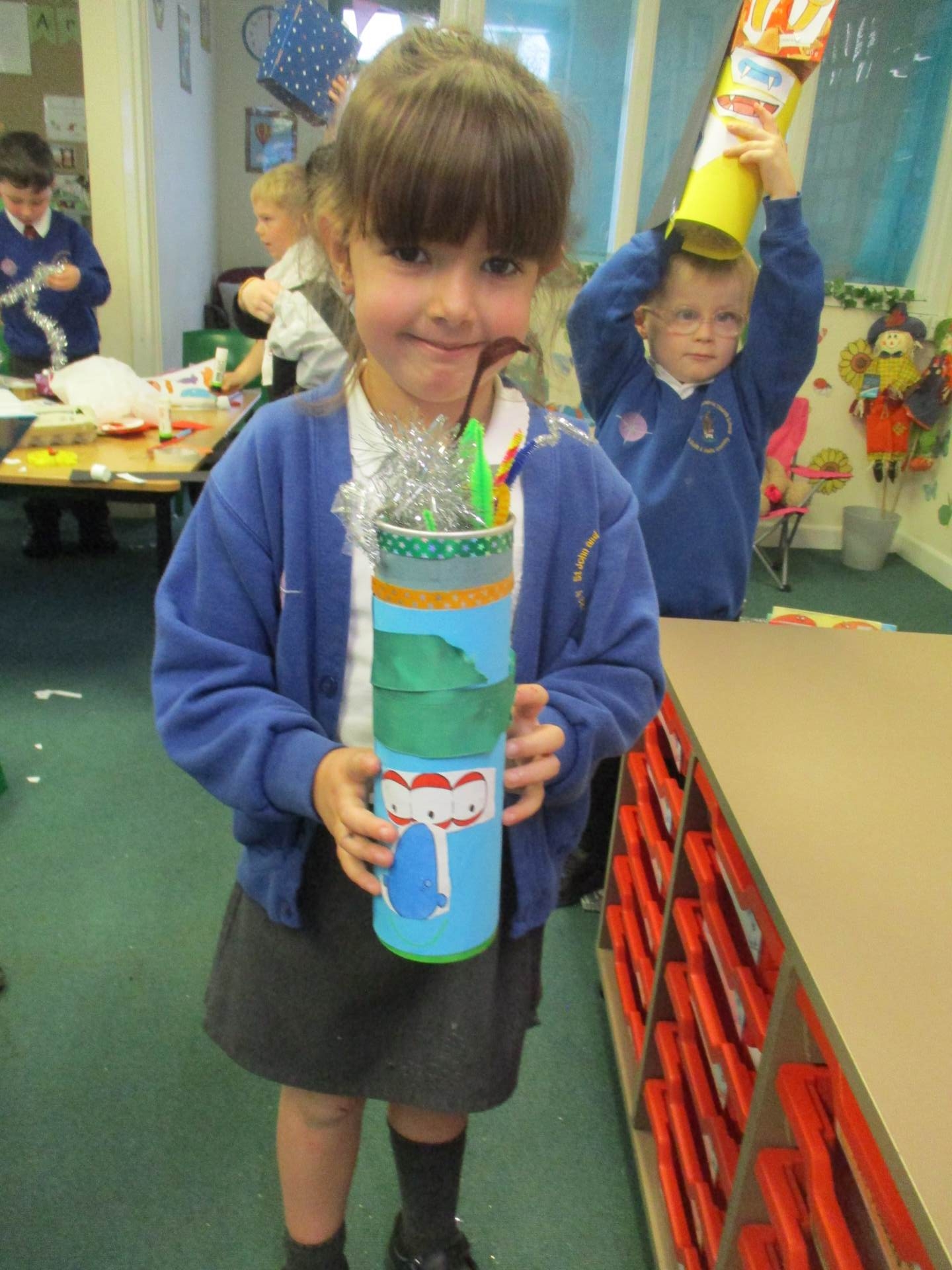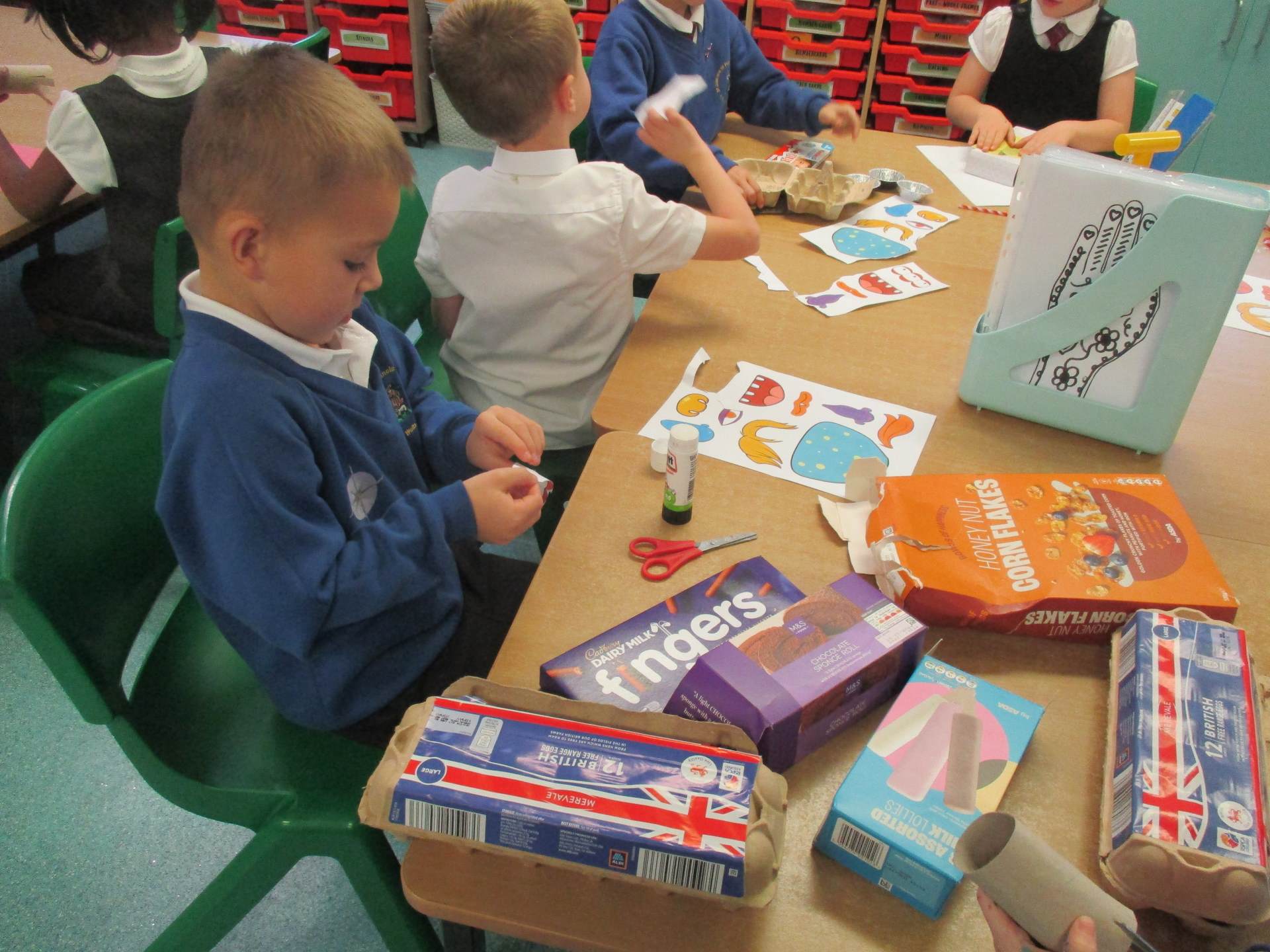 Today we listened to the story of Where the Wild Things Are. We then looked at some pictures of different cartoon monsters and agreed that a monster was quite unique and could have all kinds of different features. look at the fantastic monsters that we have created today using recyclable materials.