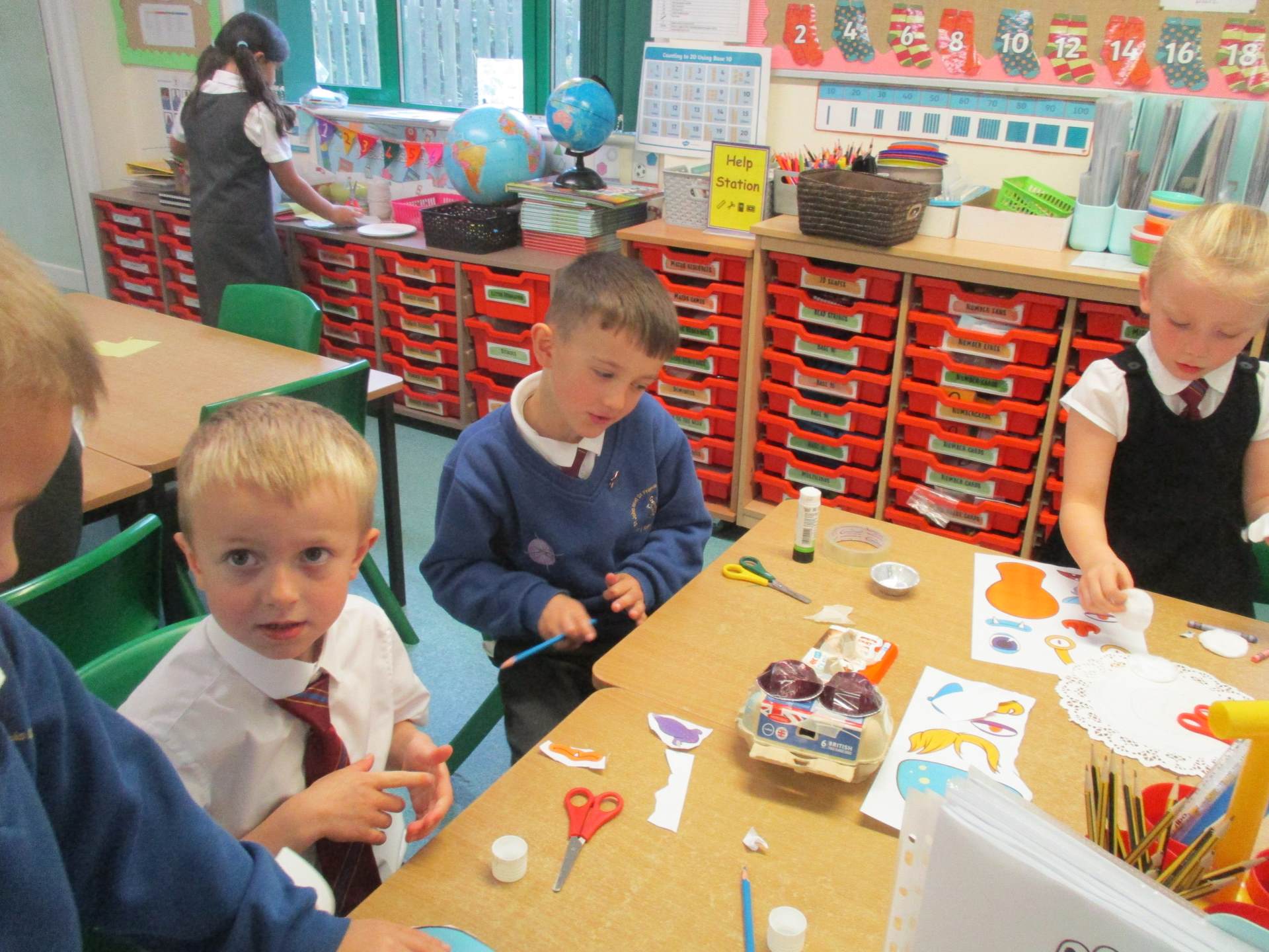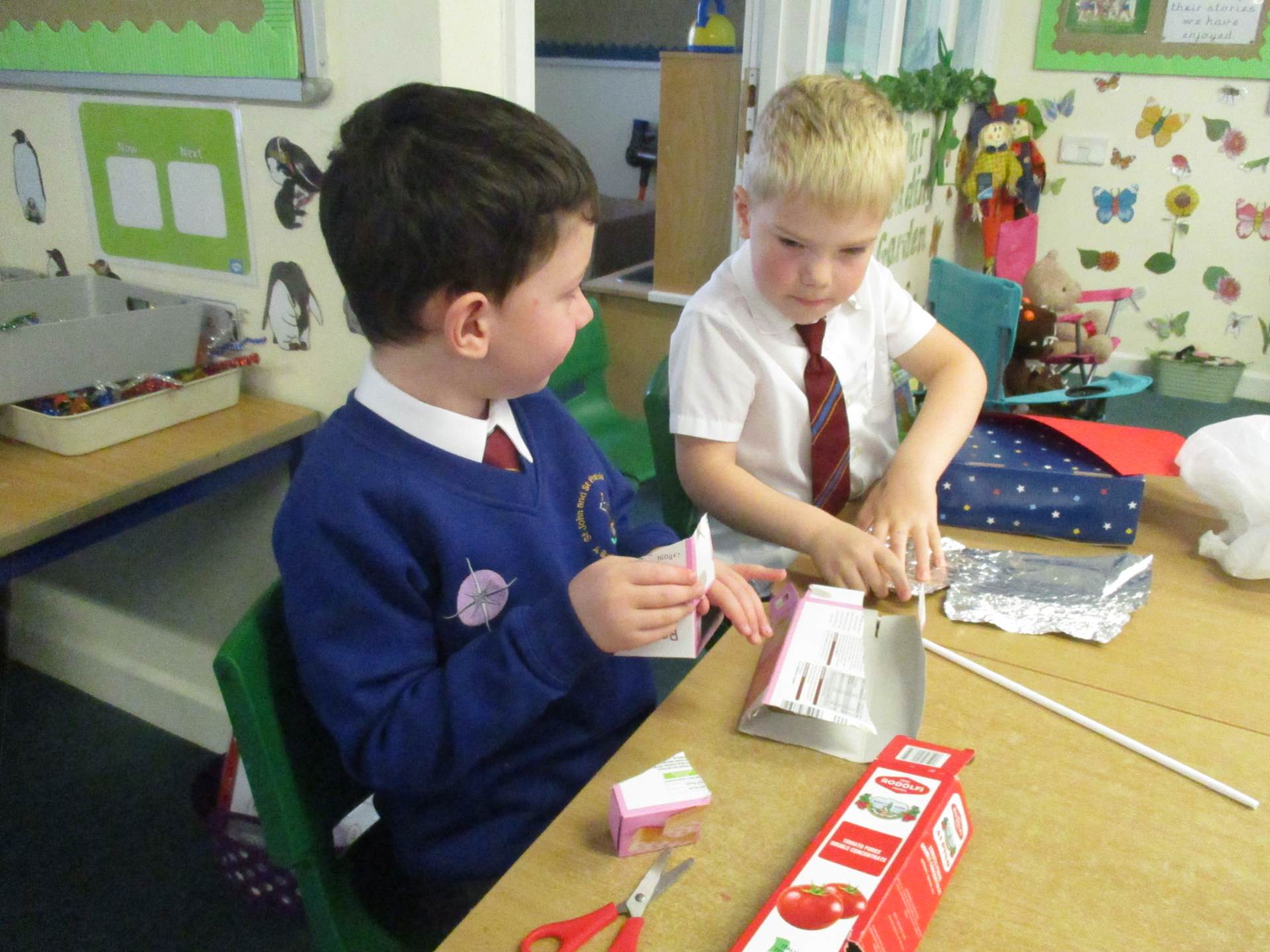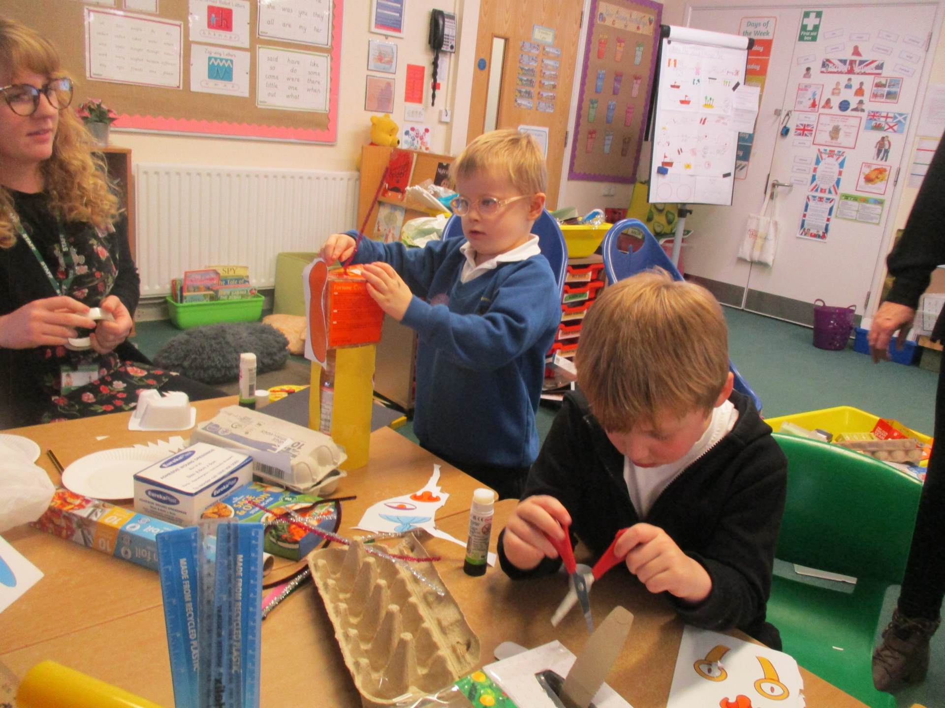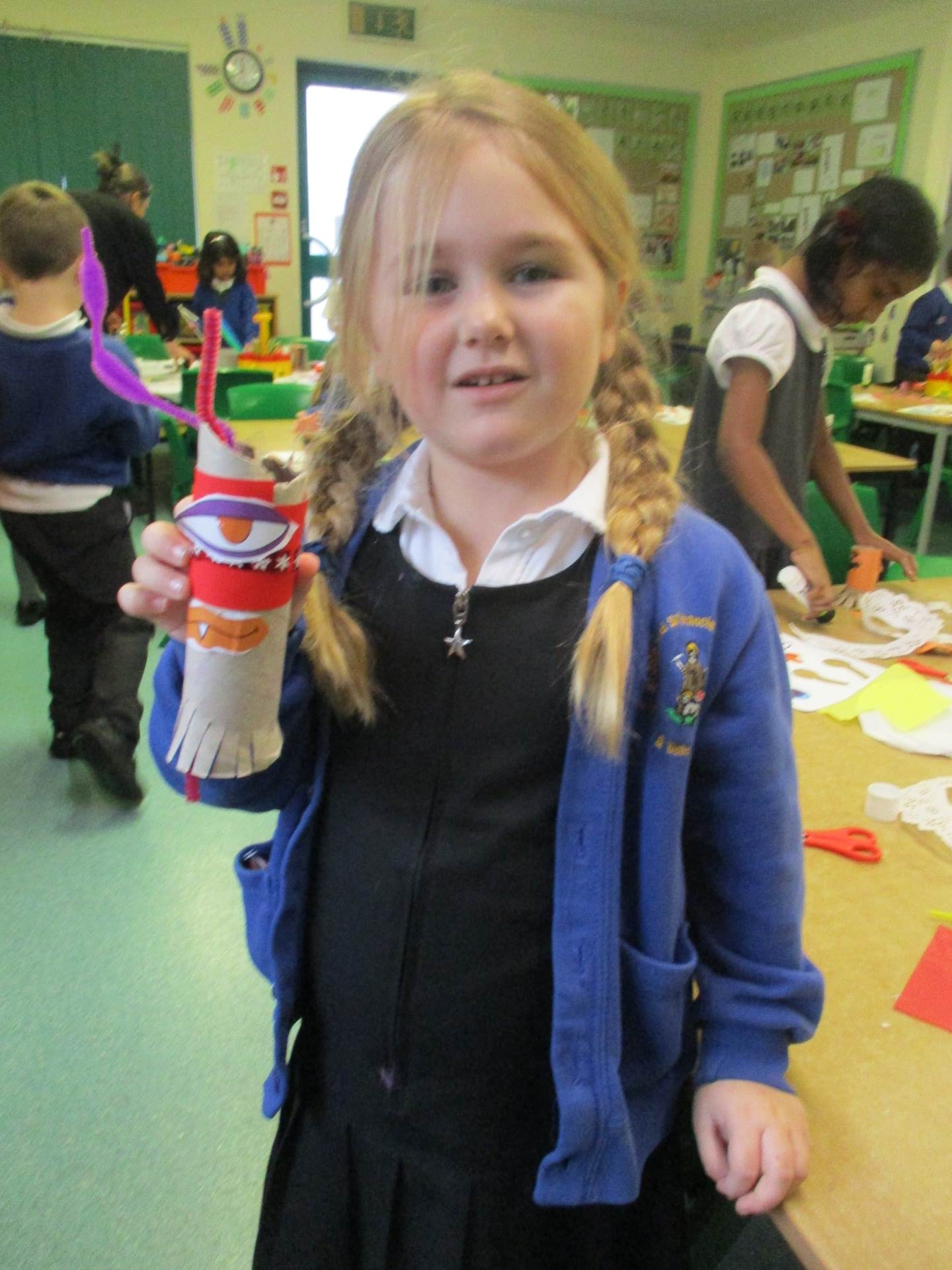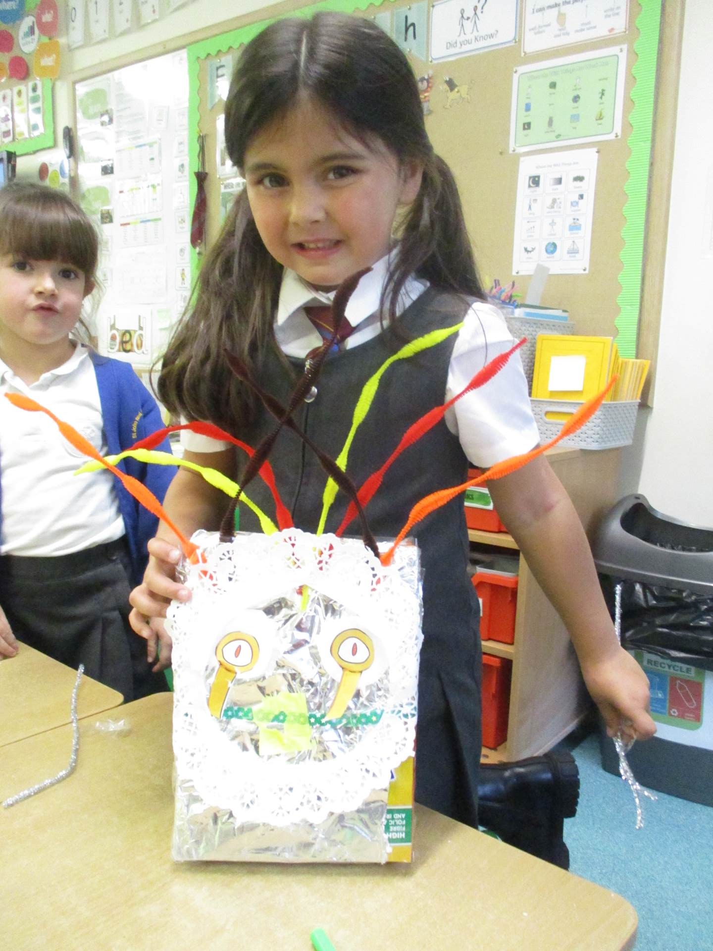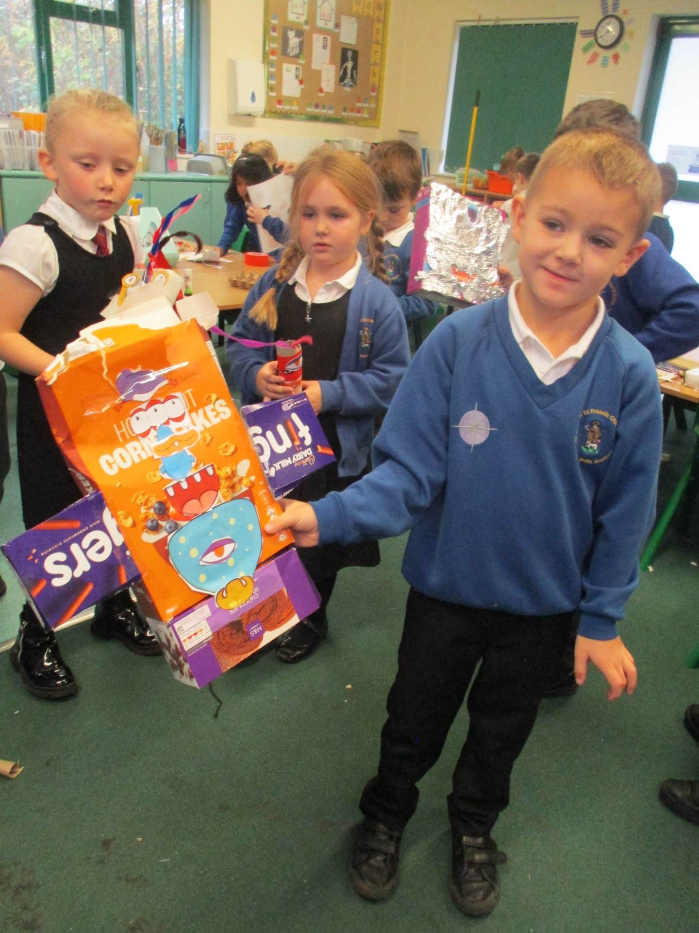 Today we listened to the story of Where the Wild Things Are. We then looked at some pictures of different cartoon monsters and agreed that a monster was quite unique and could have all kinds of different features. look at the fantastic monsters that we have created today using recyclable materials.