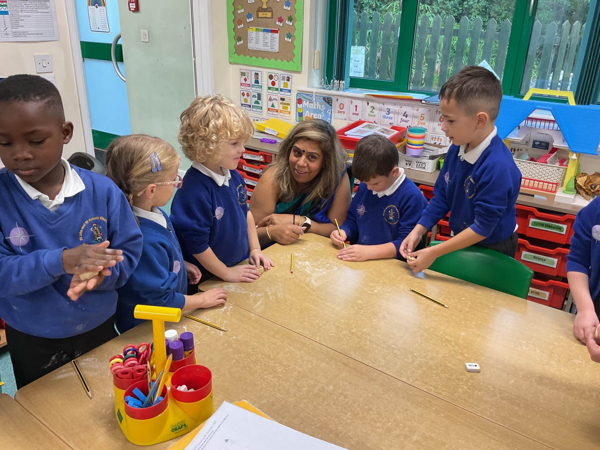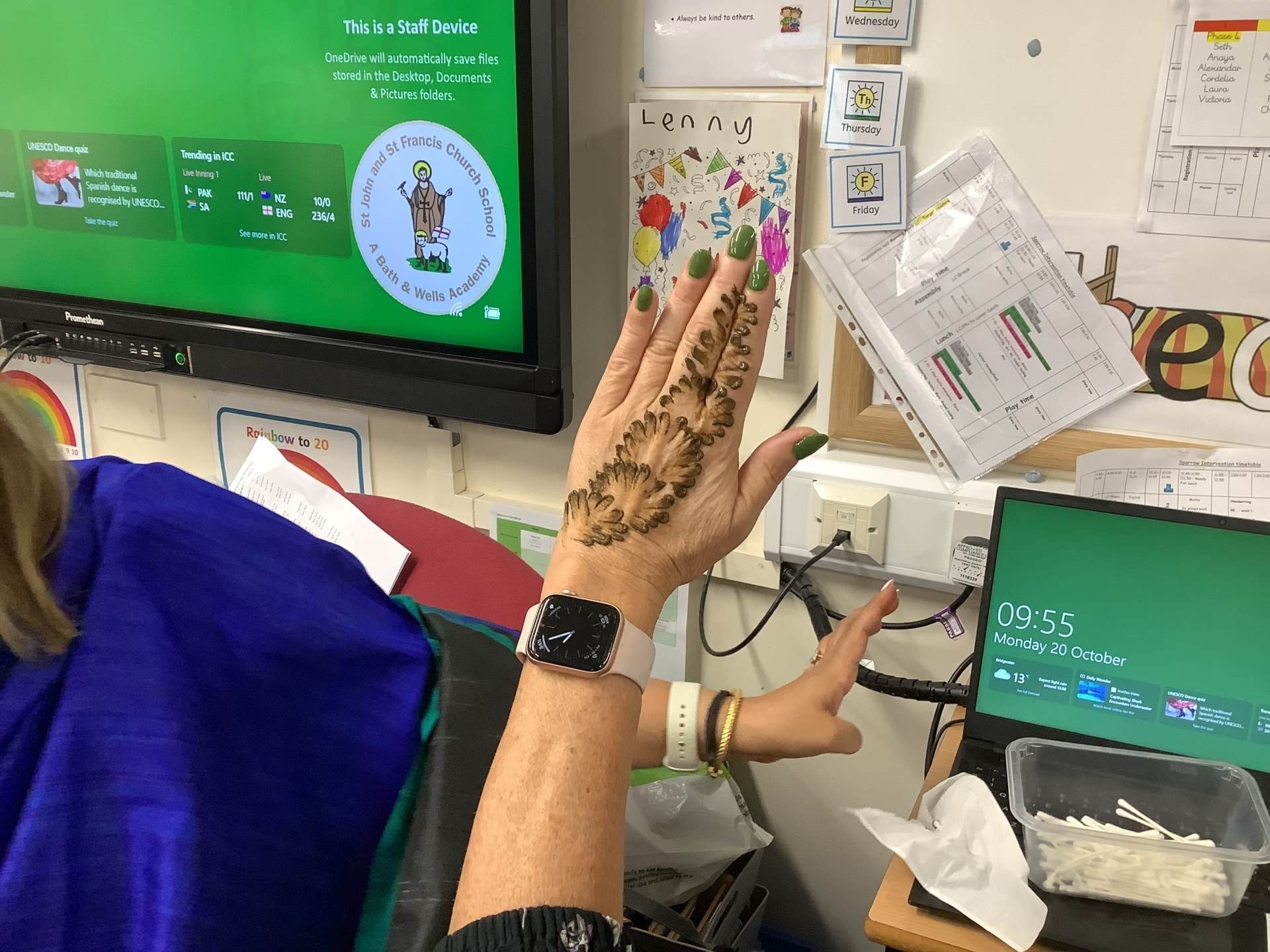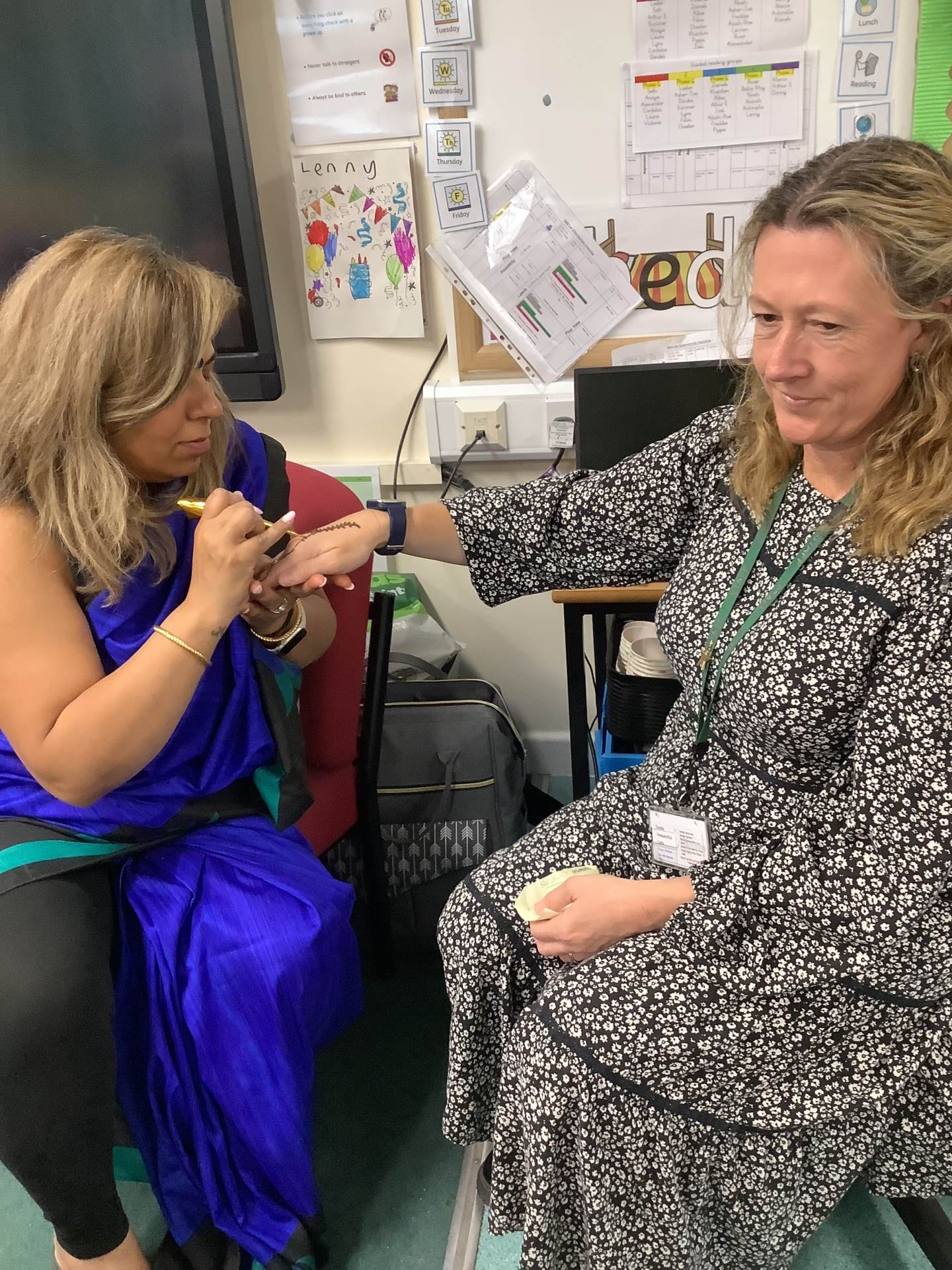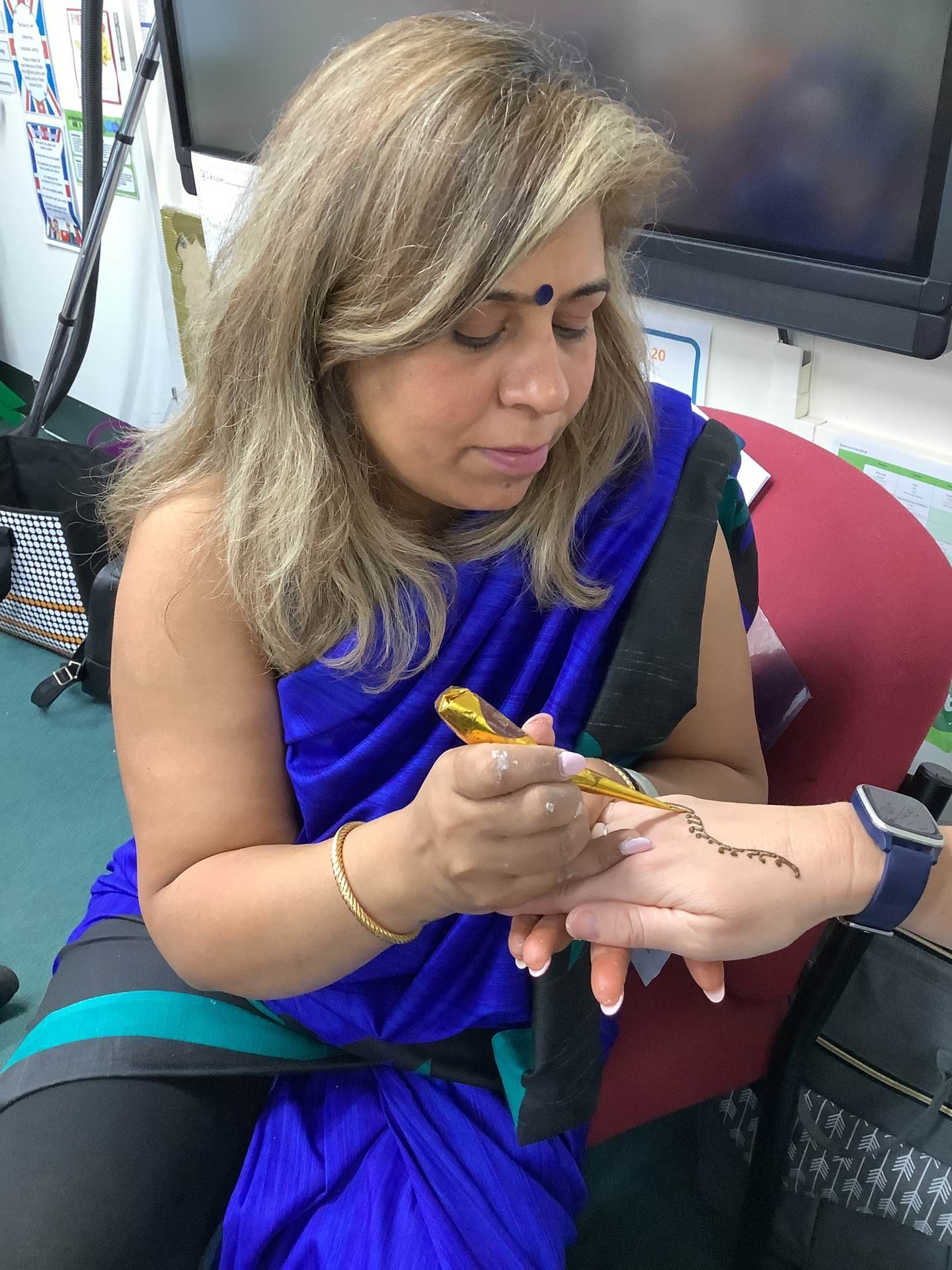 We learnt lots from her fantastic visit. We discovered that it is celebrated a little bit like Christmas where they have a lovely family meal, dress in their best clothes ( Mrs Malhi's dress looked very different to the clothes that we wear), they share sweets and gifts, they decorate their homes and even have fireworks. We were very lucky as we got to make our own Diva lamps to take home. We then created some of our own pictures and patterns using some Rangoli powder and Mrs Edwards and Mrs Leach even had a Mendi pattern drawn on their hands. Mrs Malhi even gave us some sweet treats and the staff some freshly backed spring rolls and samosas which tasted delicious.