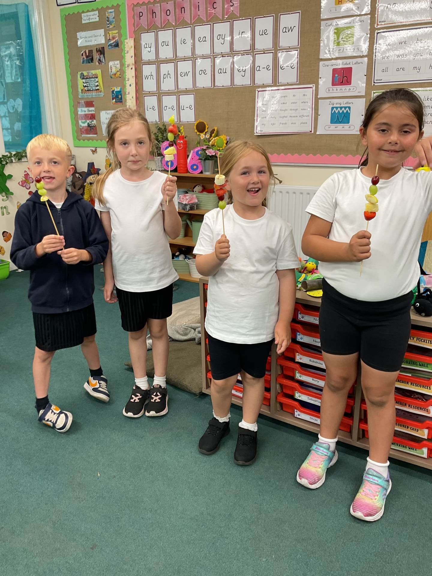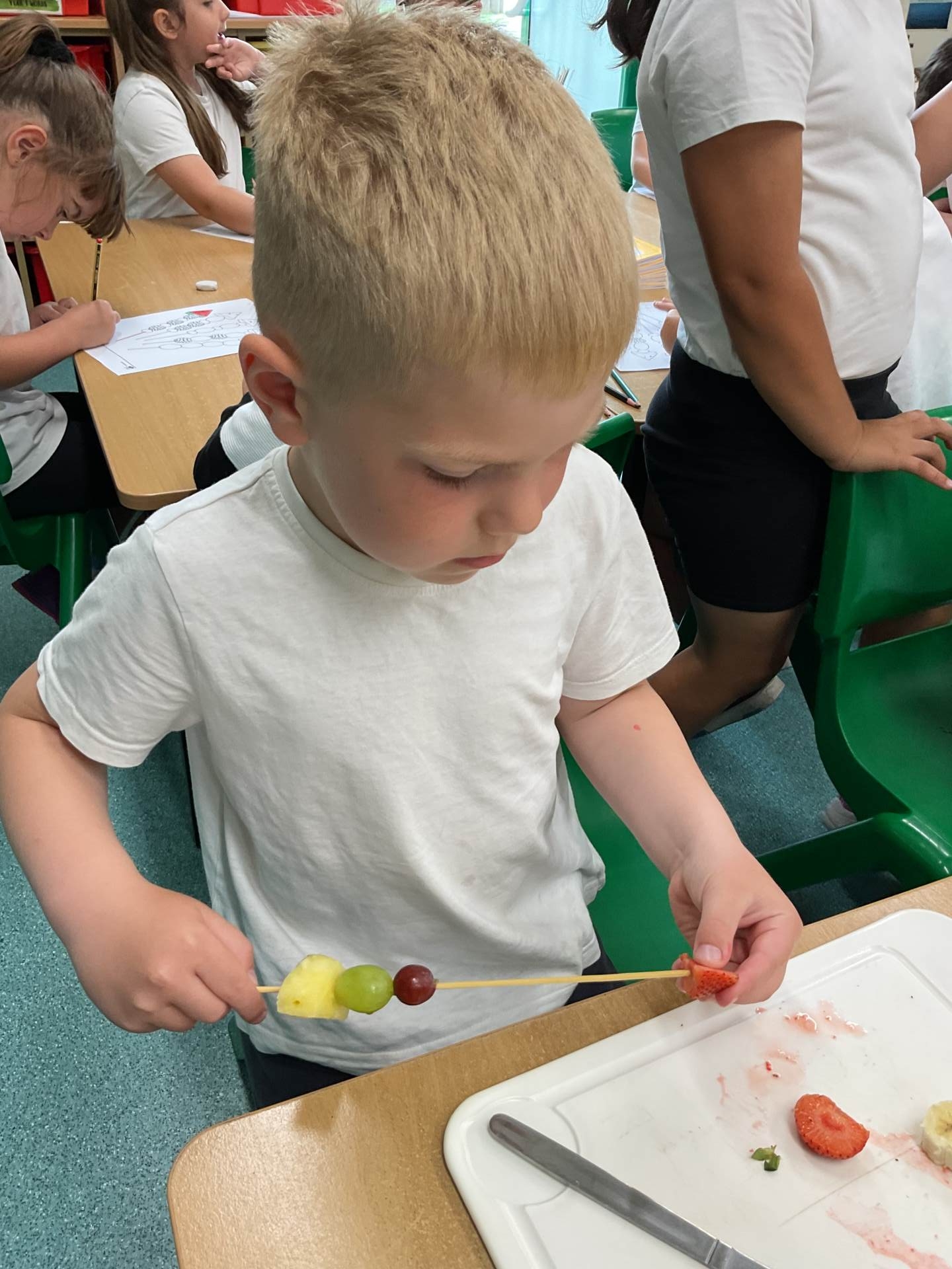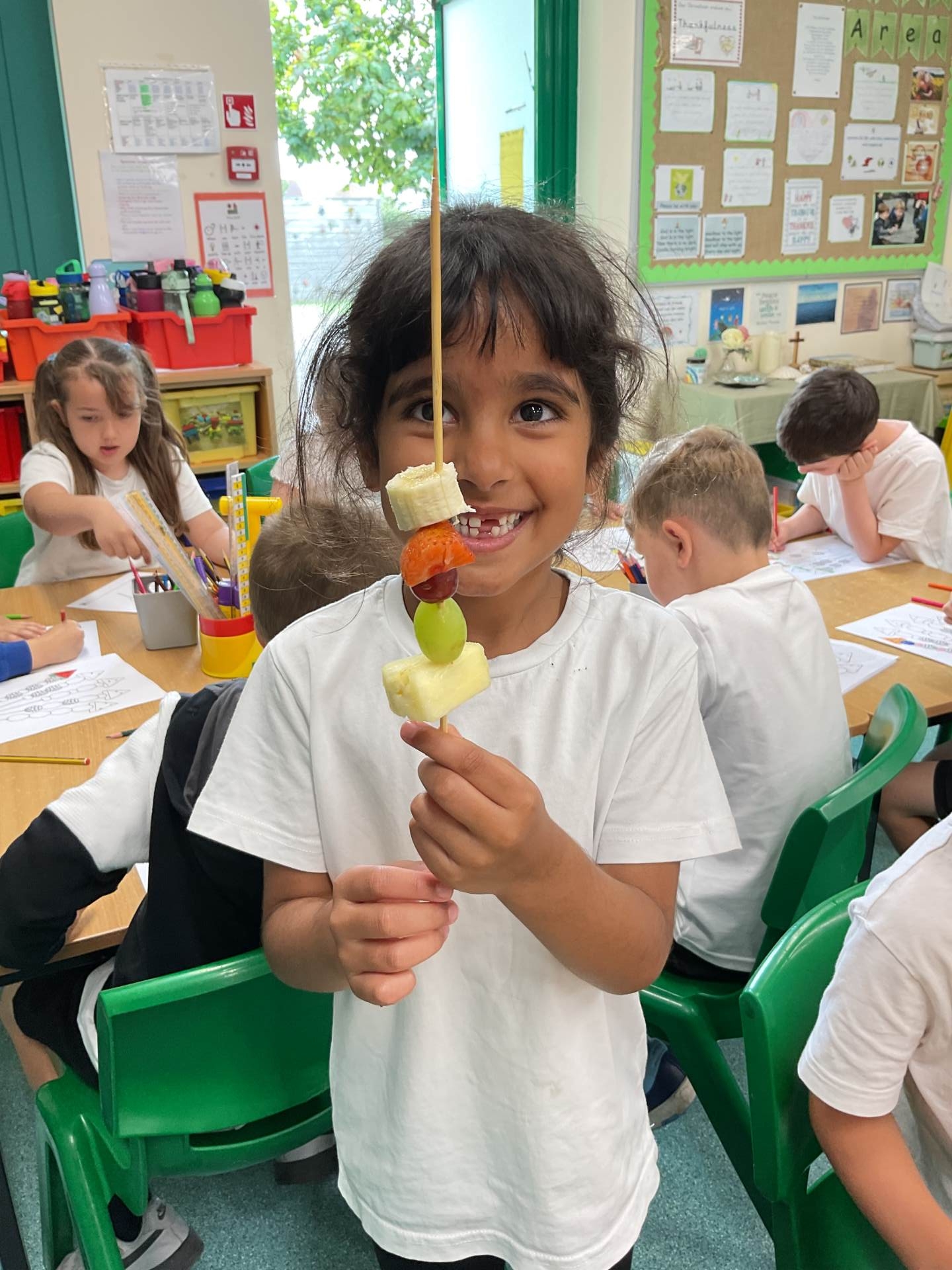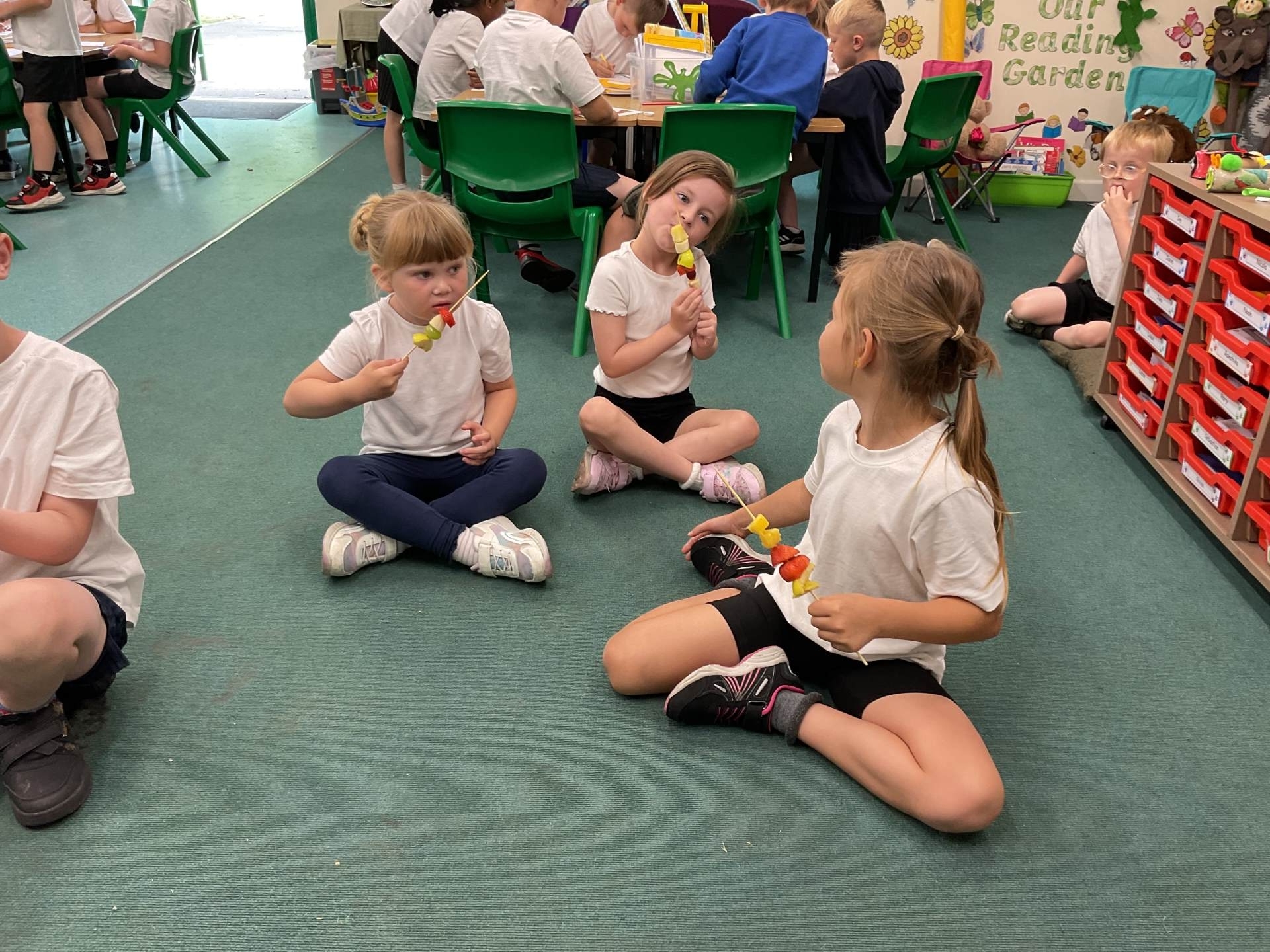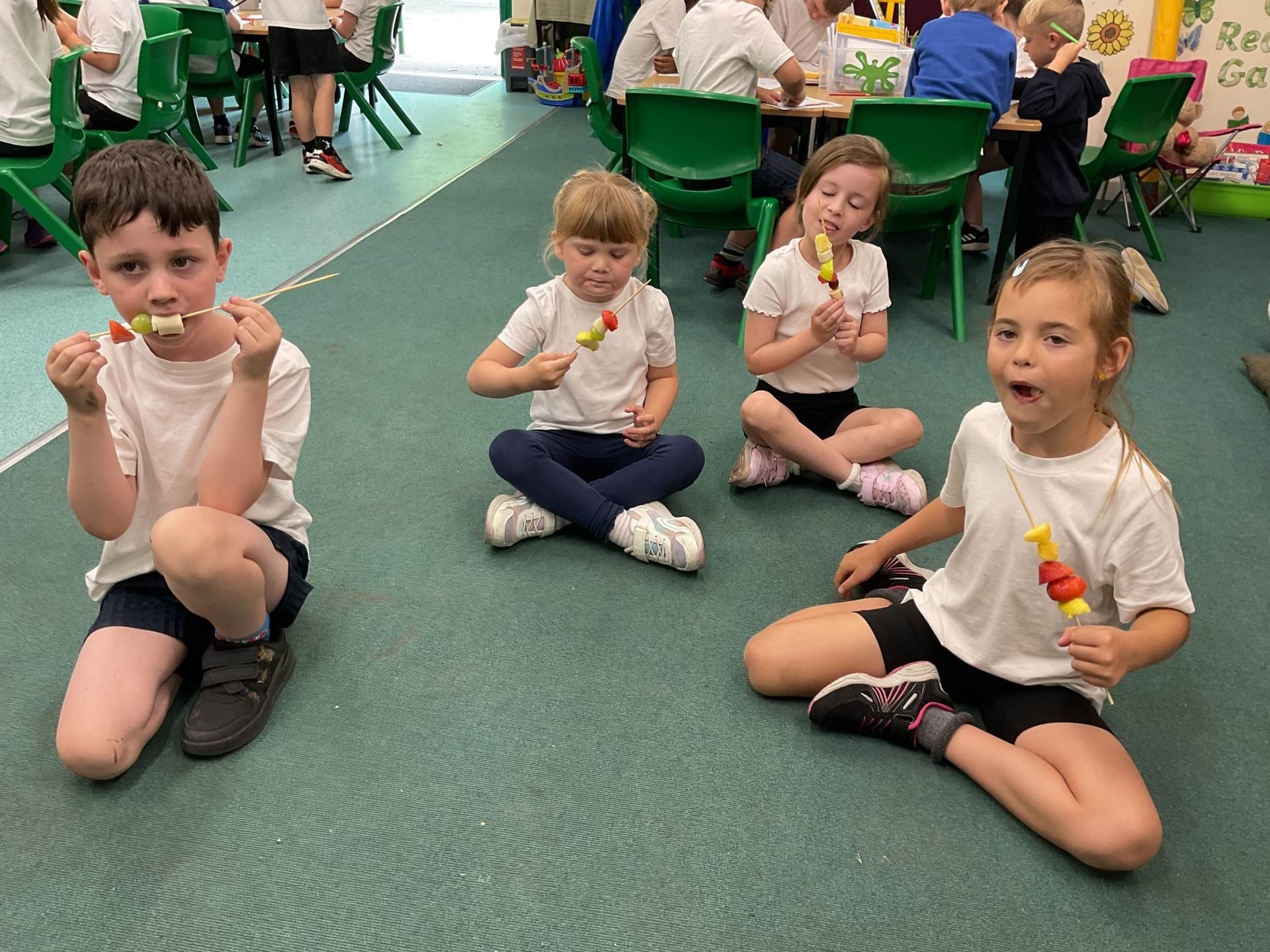 This morning in Sparrow class we have been thinking about healthy eating and how the different food groups support different parts of our bodies. We then made our own fruit kebabs. They tasted delicious. We also engaged in a range of healthy eating activities.