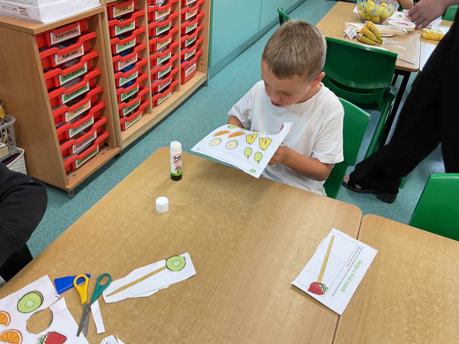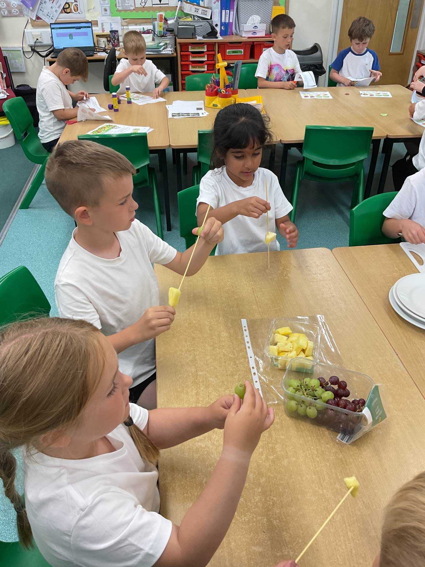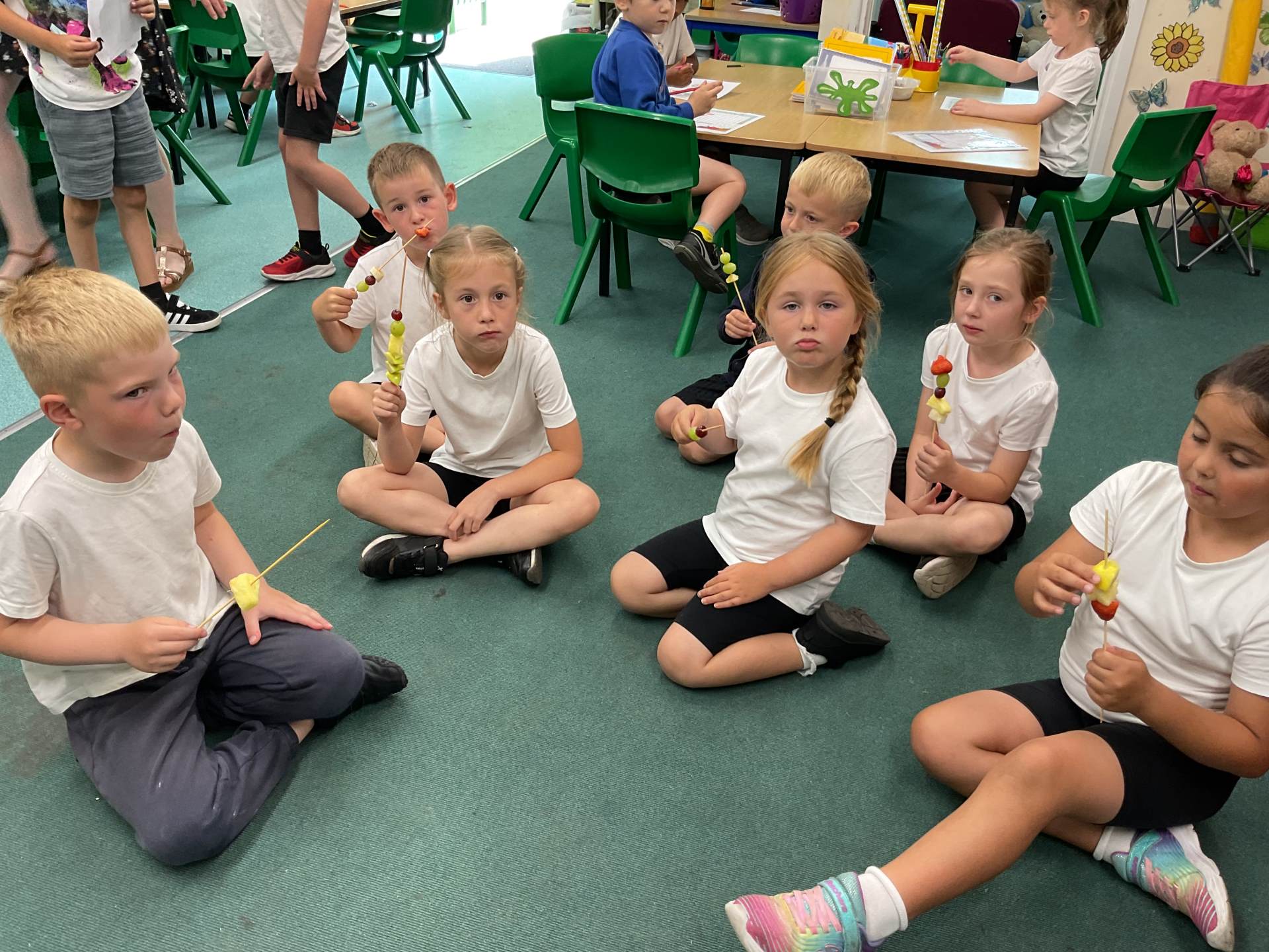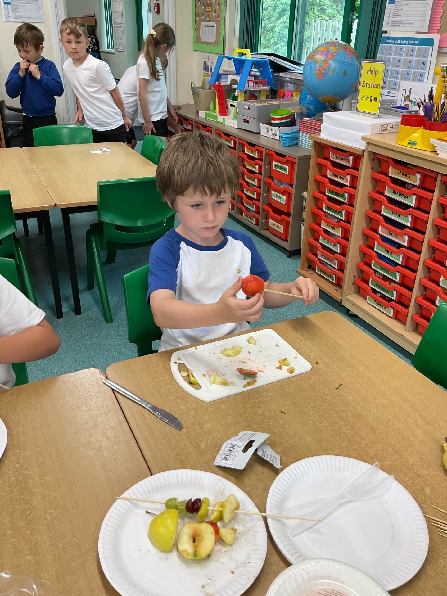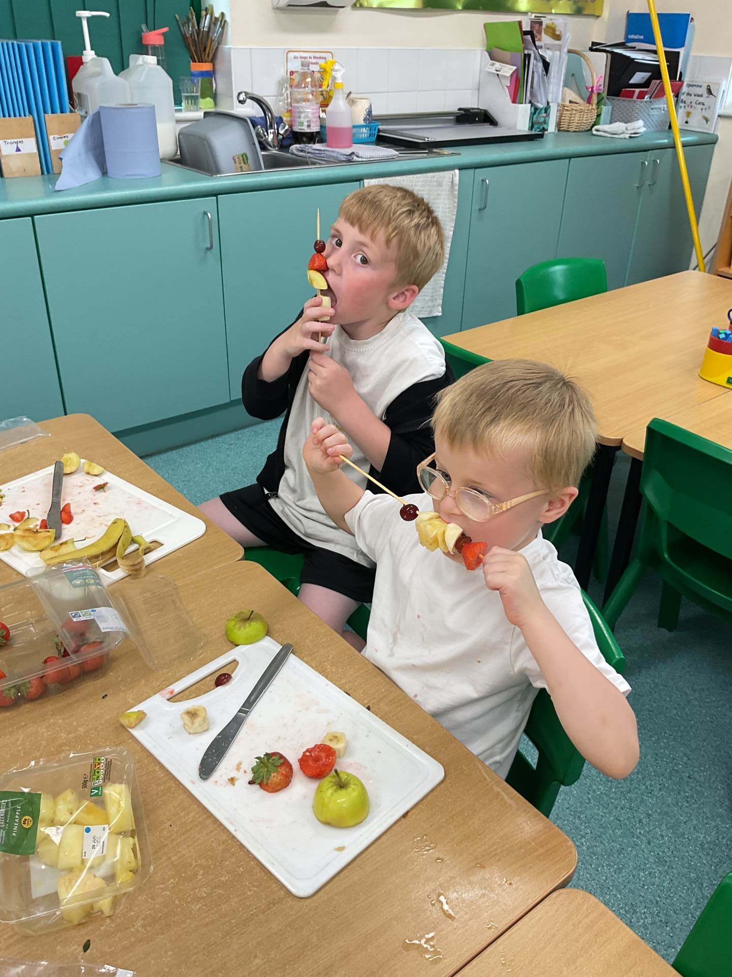 This morning in Sparrow class we have been thinking about healthy eating and how the different food groups support different parts of our bodies. We then made our own fruit kebabs. They tasted delicious. We also engaged in a range of healthy eating activities.