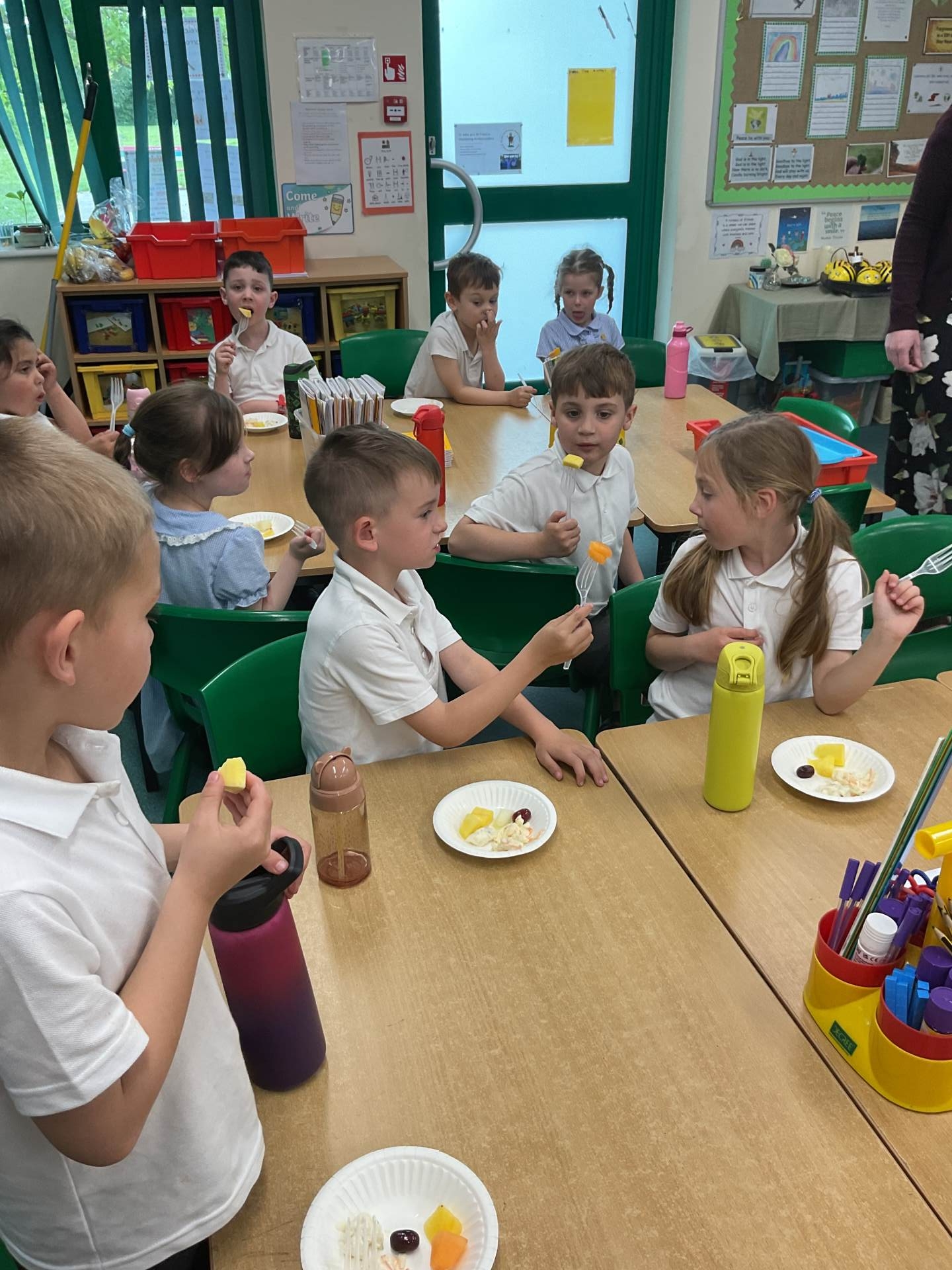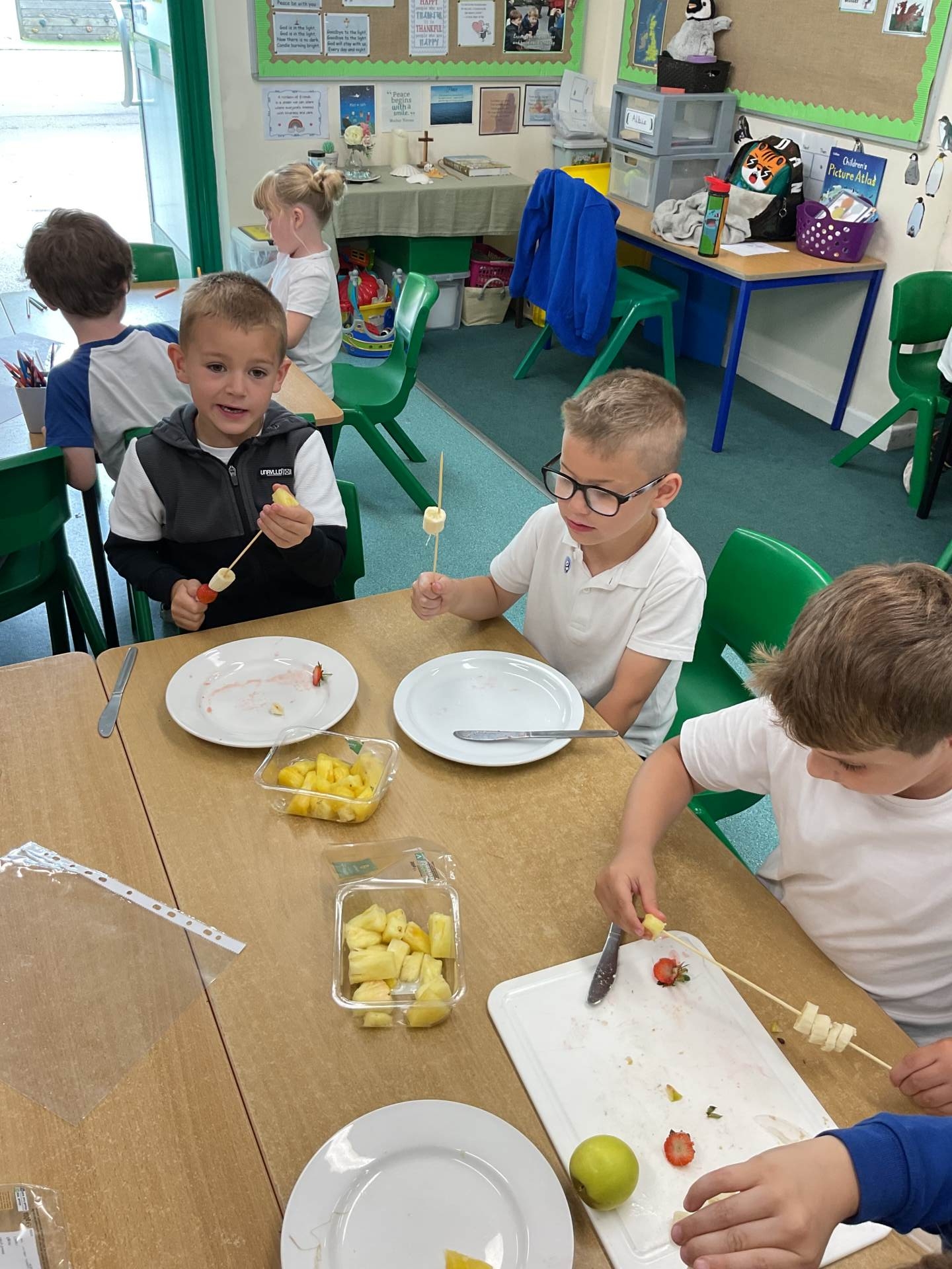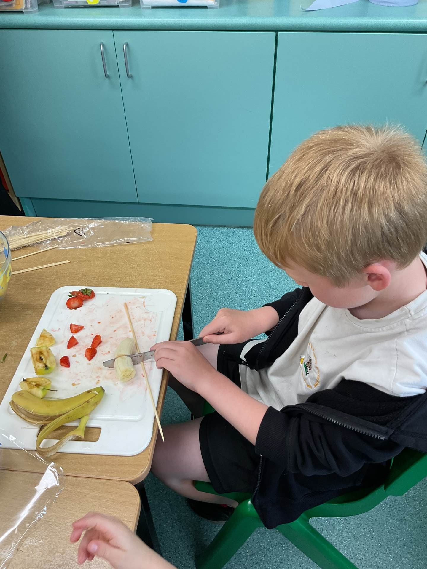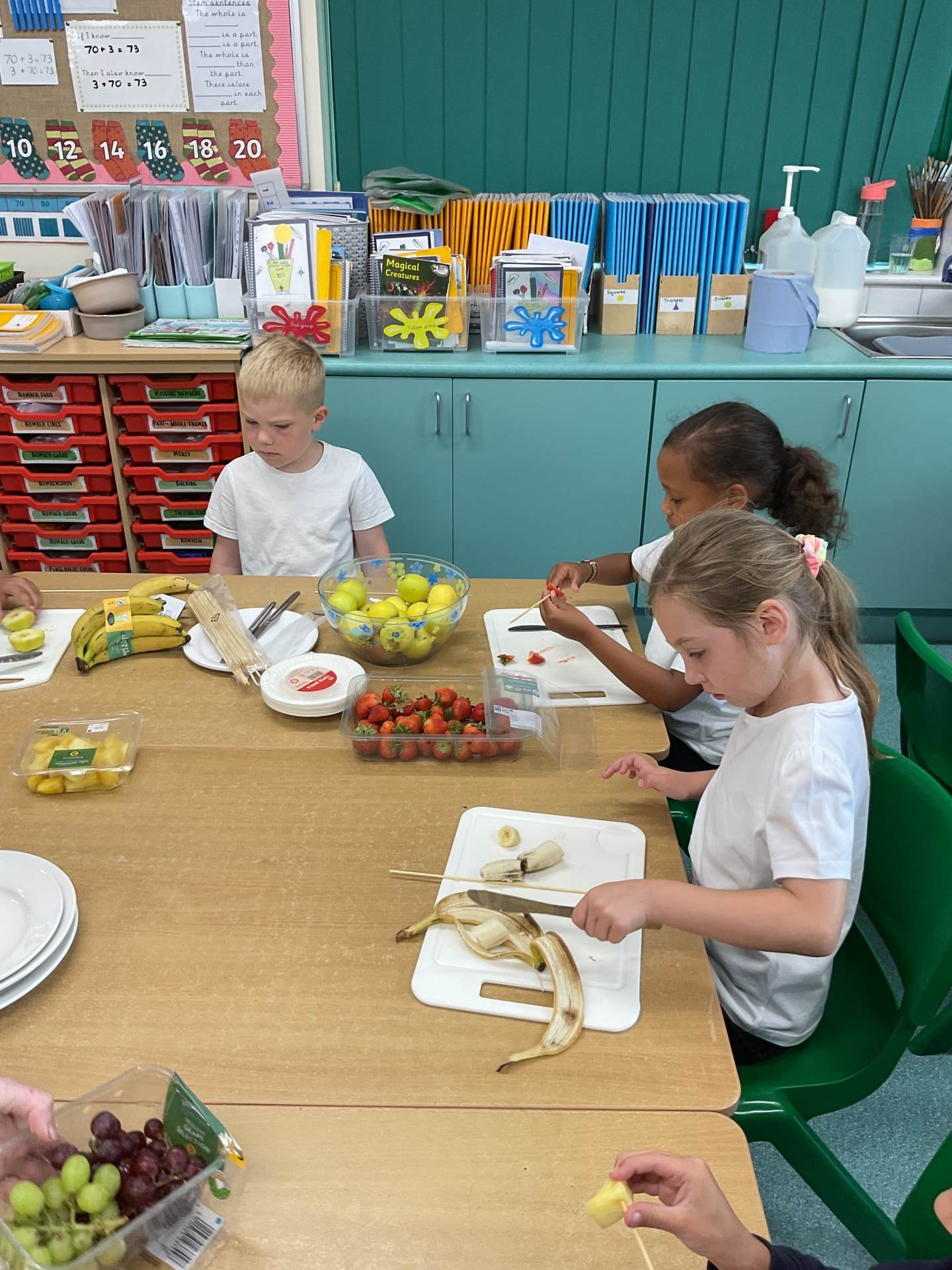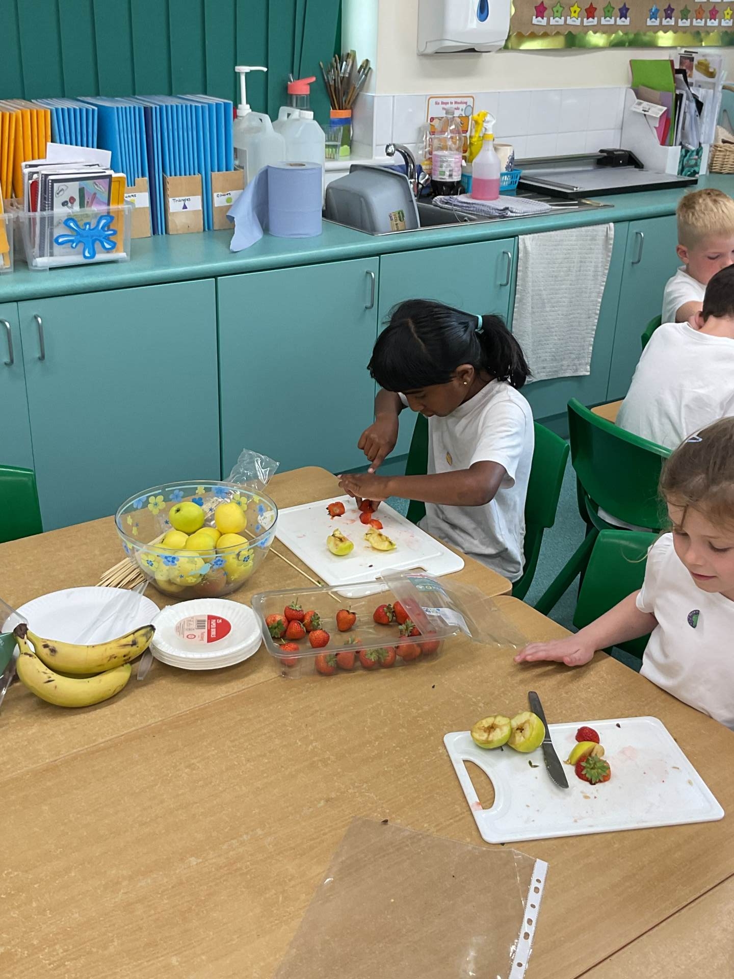 This morning in Sparrow class we have been thinking about healthy eating and how the different food groups support different parts of our bodies. We then made our own fruit kebabs. They tasted delicious. We also engaged in a range of healthy eating activities.