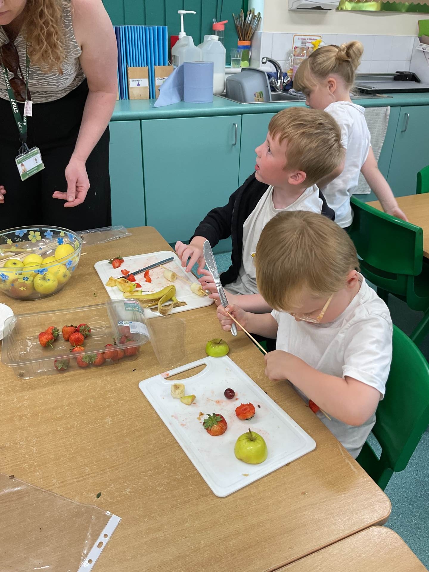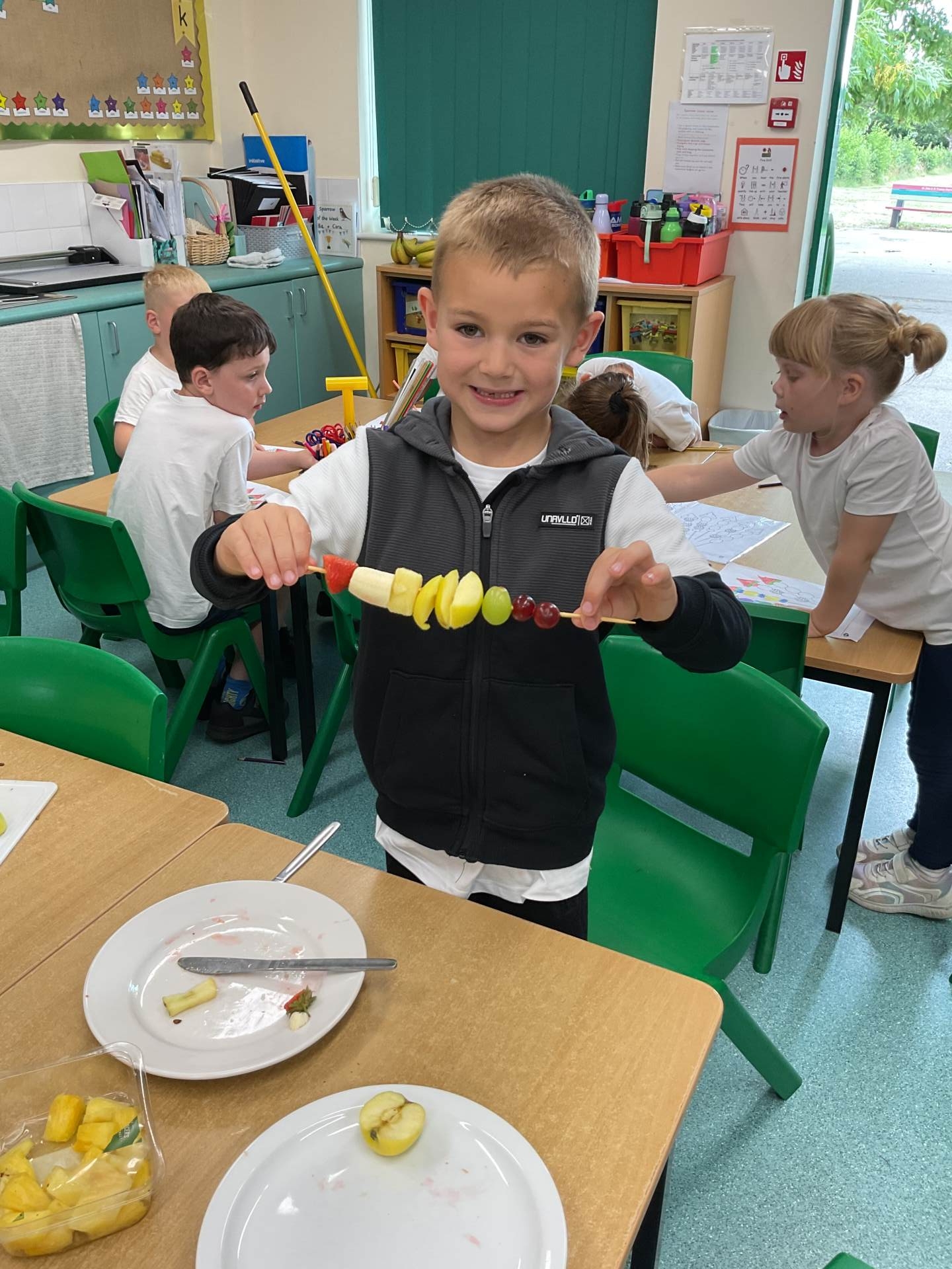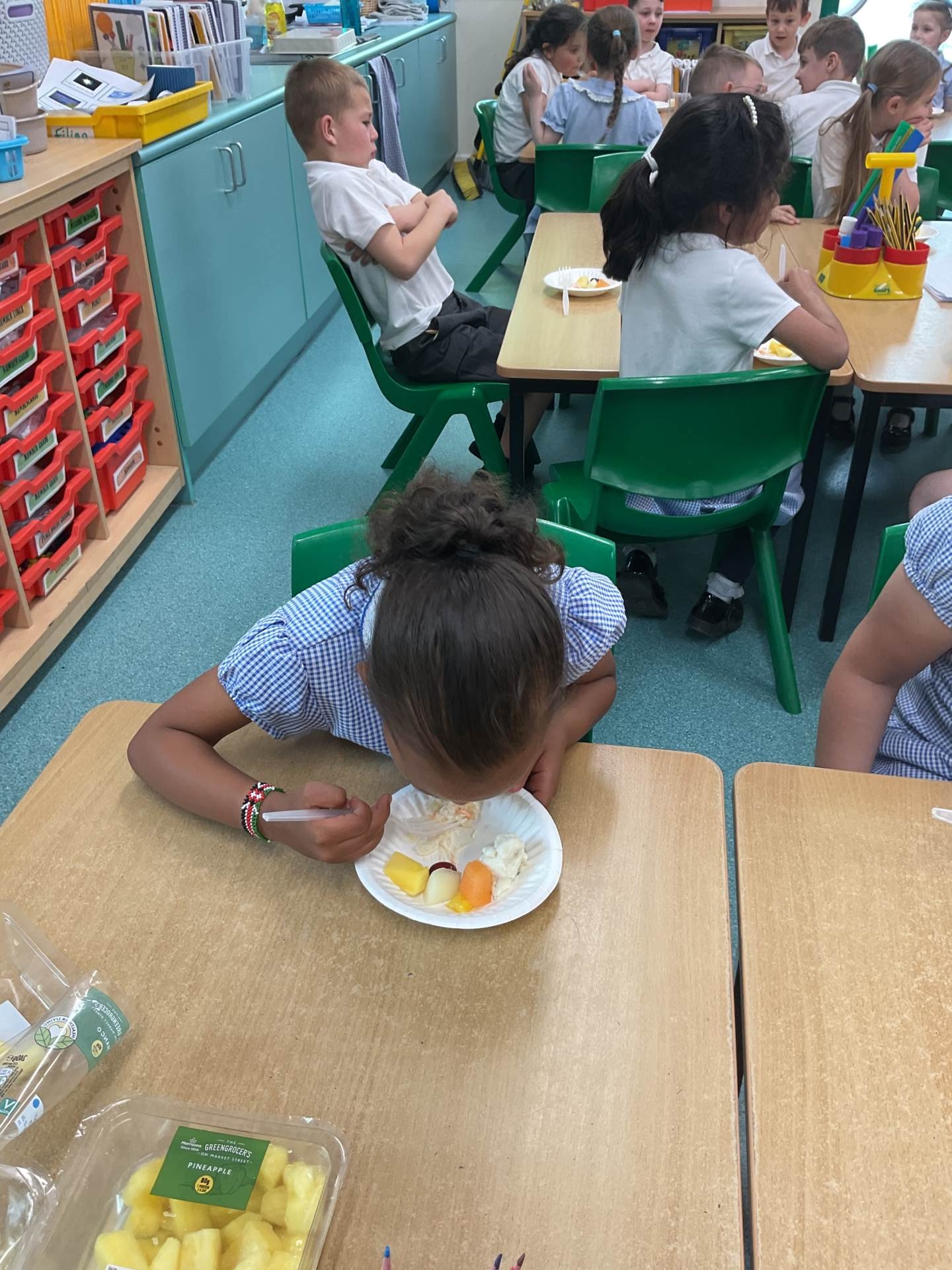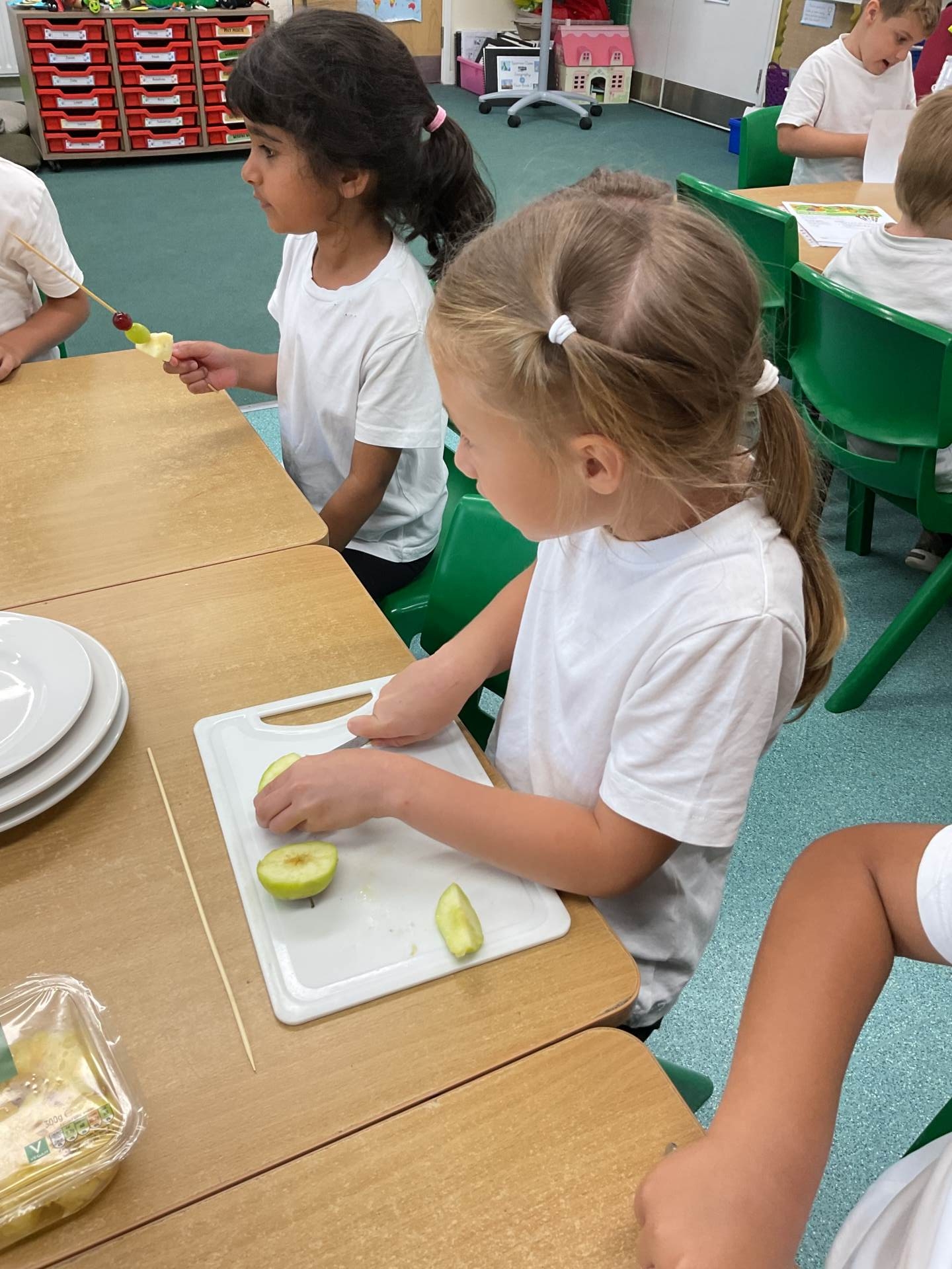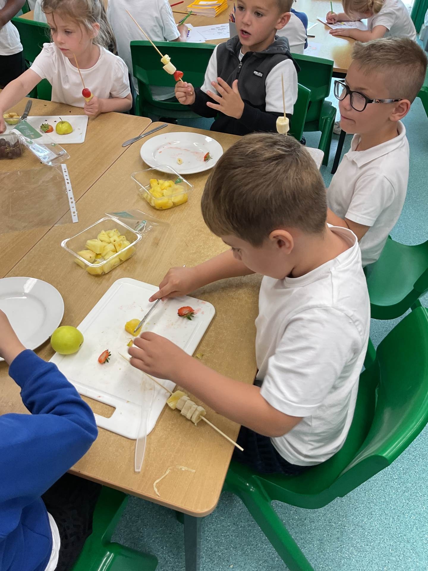 This morning in Sparrow class we have been thinking about healthy eating and how the different food groups support different parts of our bodies. We then made our own fruit kebabs. They tasted delicious. We also engaged in a range of healthy eating activities.