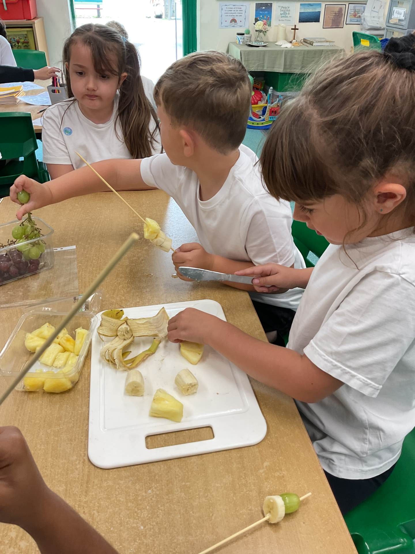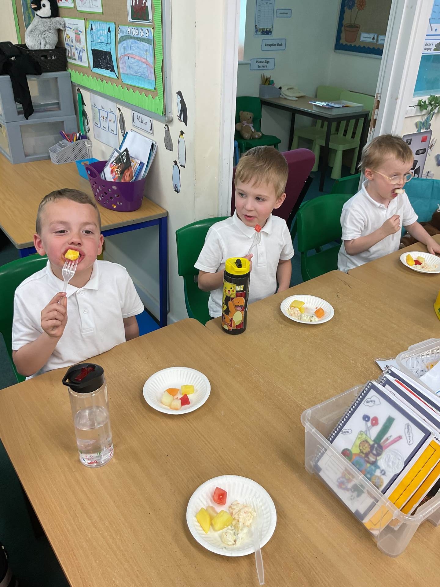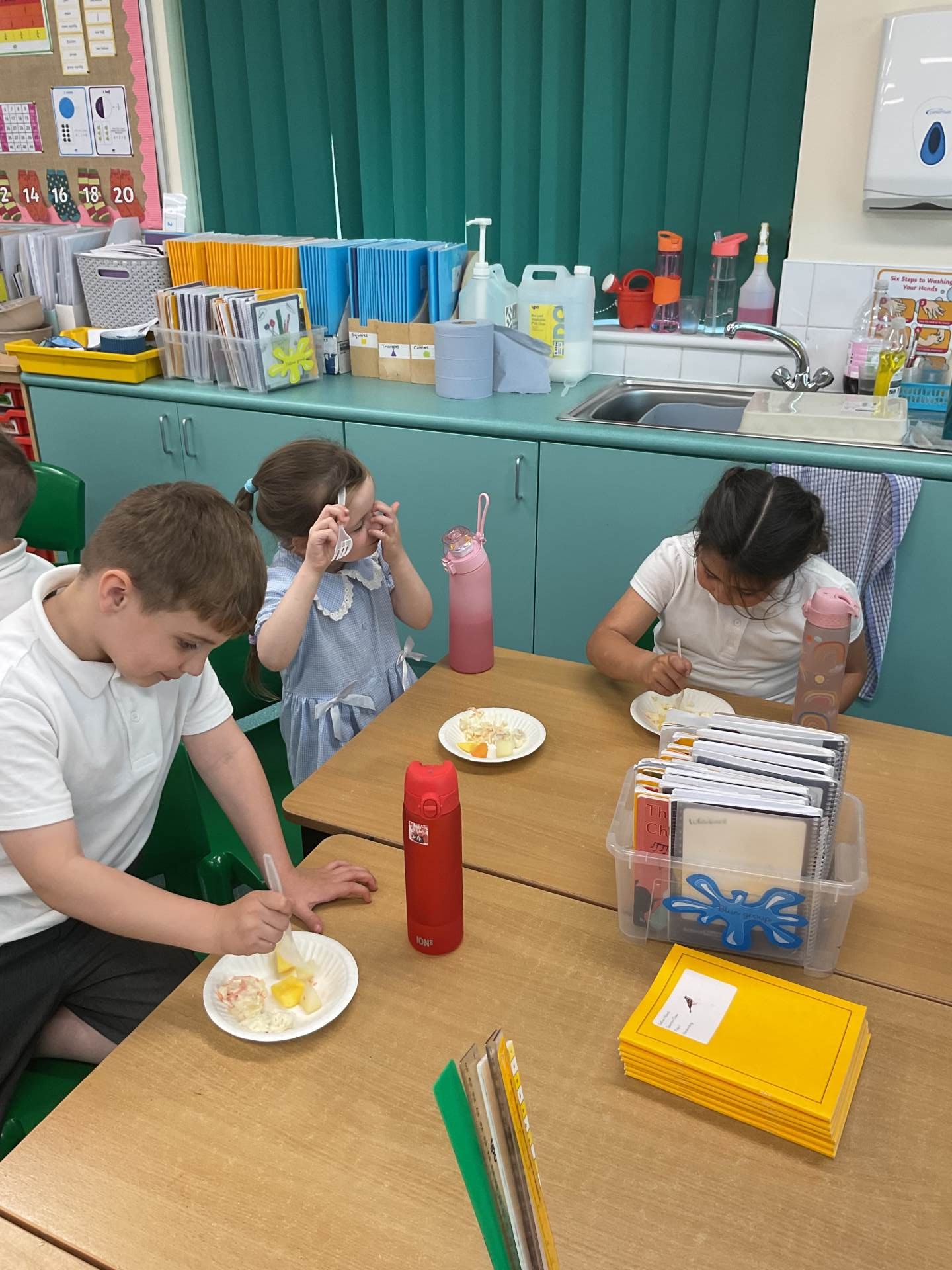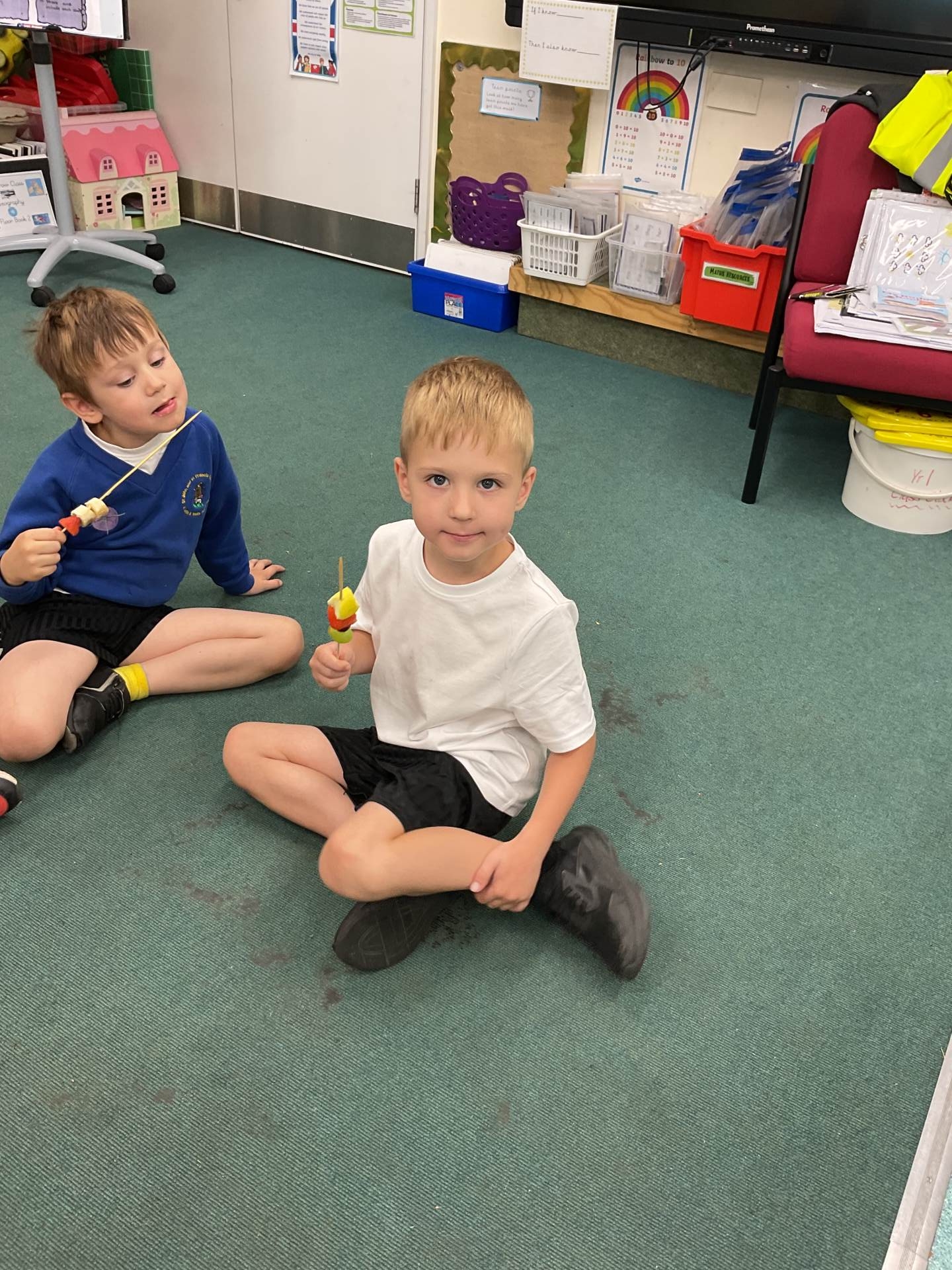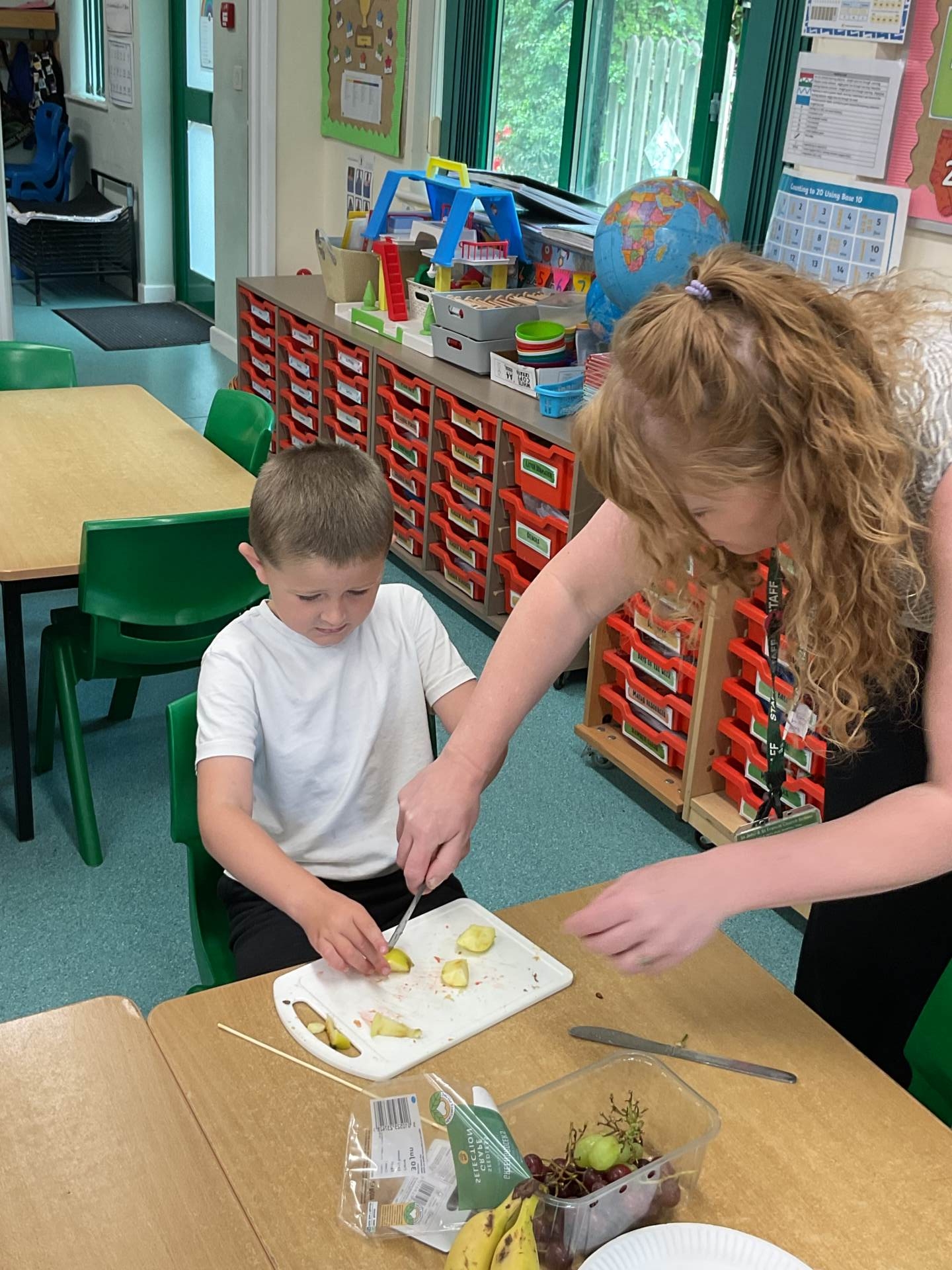 This morning in Sparrow class we have been thinking about healthy eating and how the different food groups support different parts of our bodies. We then made our own fruit kebabs. They tasted delicious. We also engaged in a range of healthy eating activities.