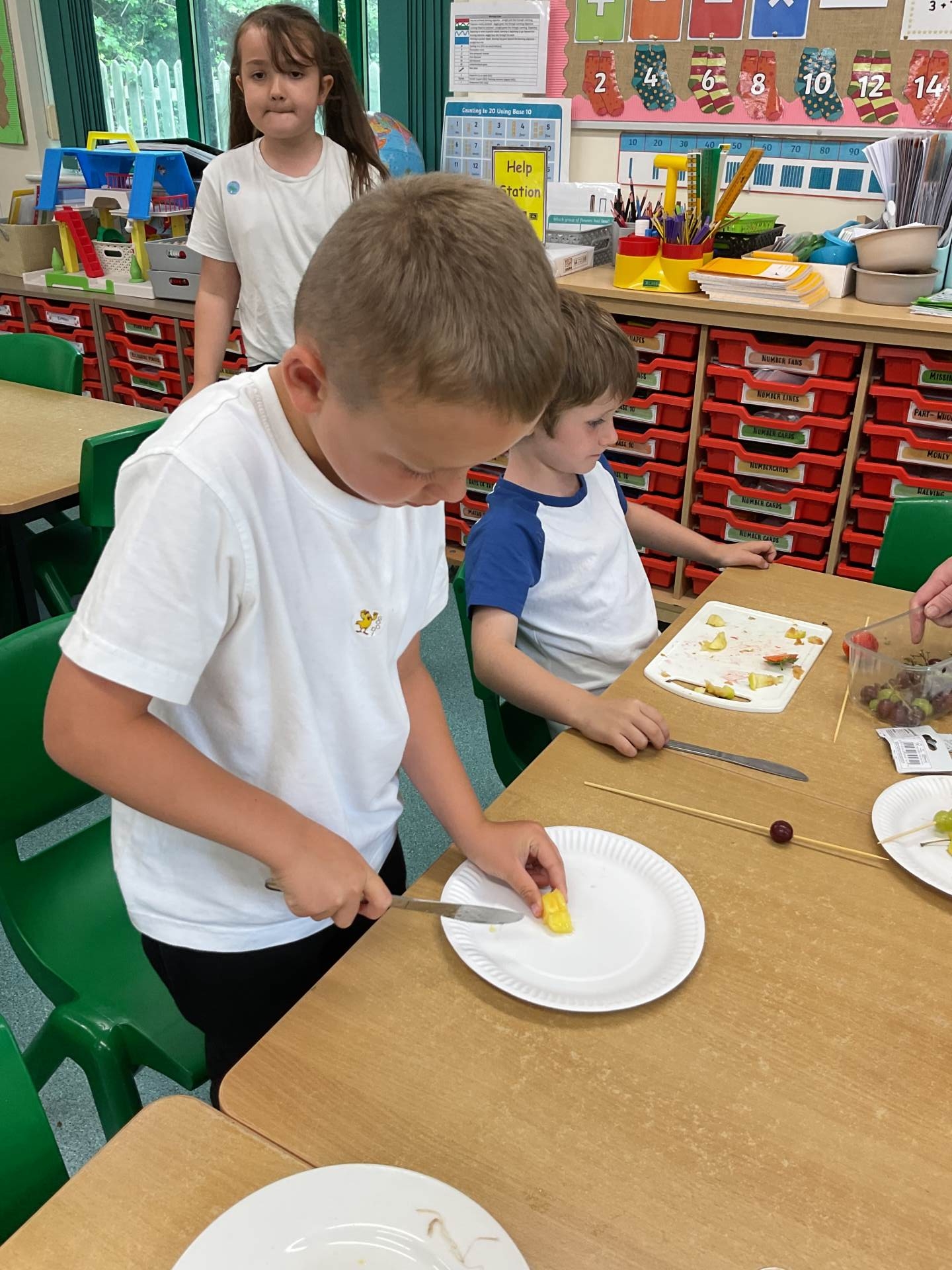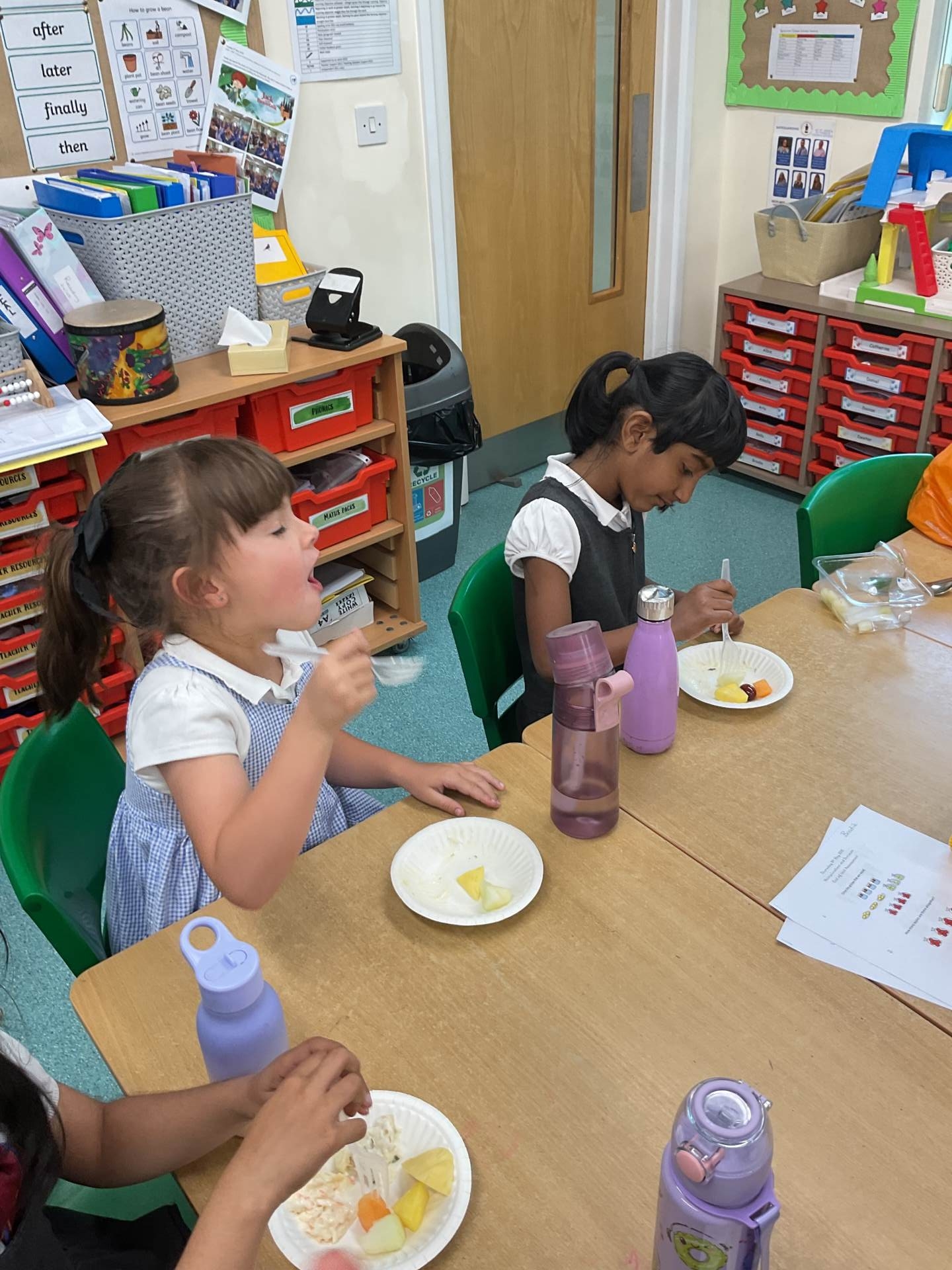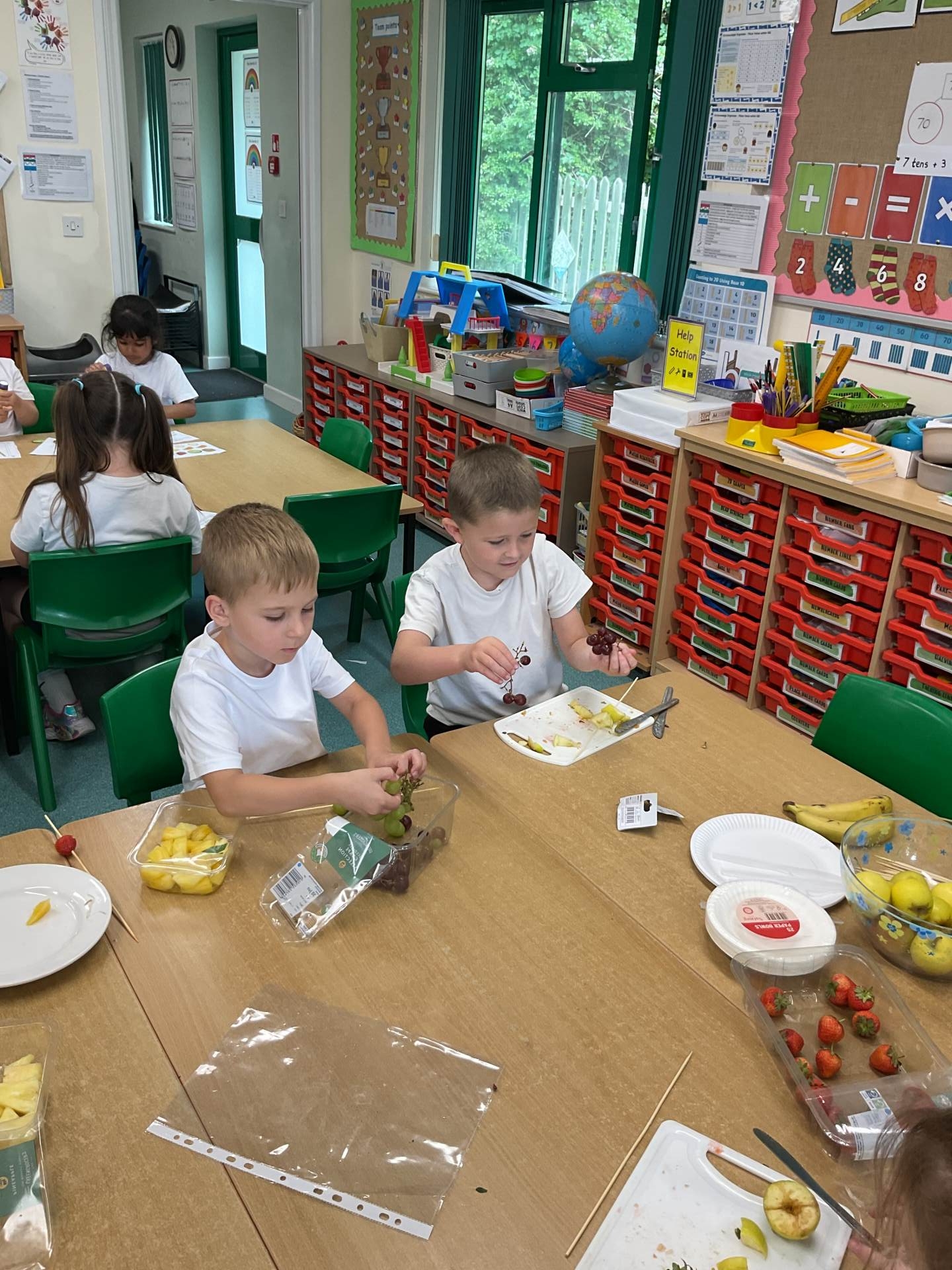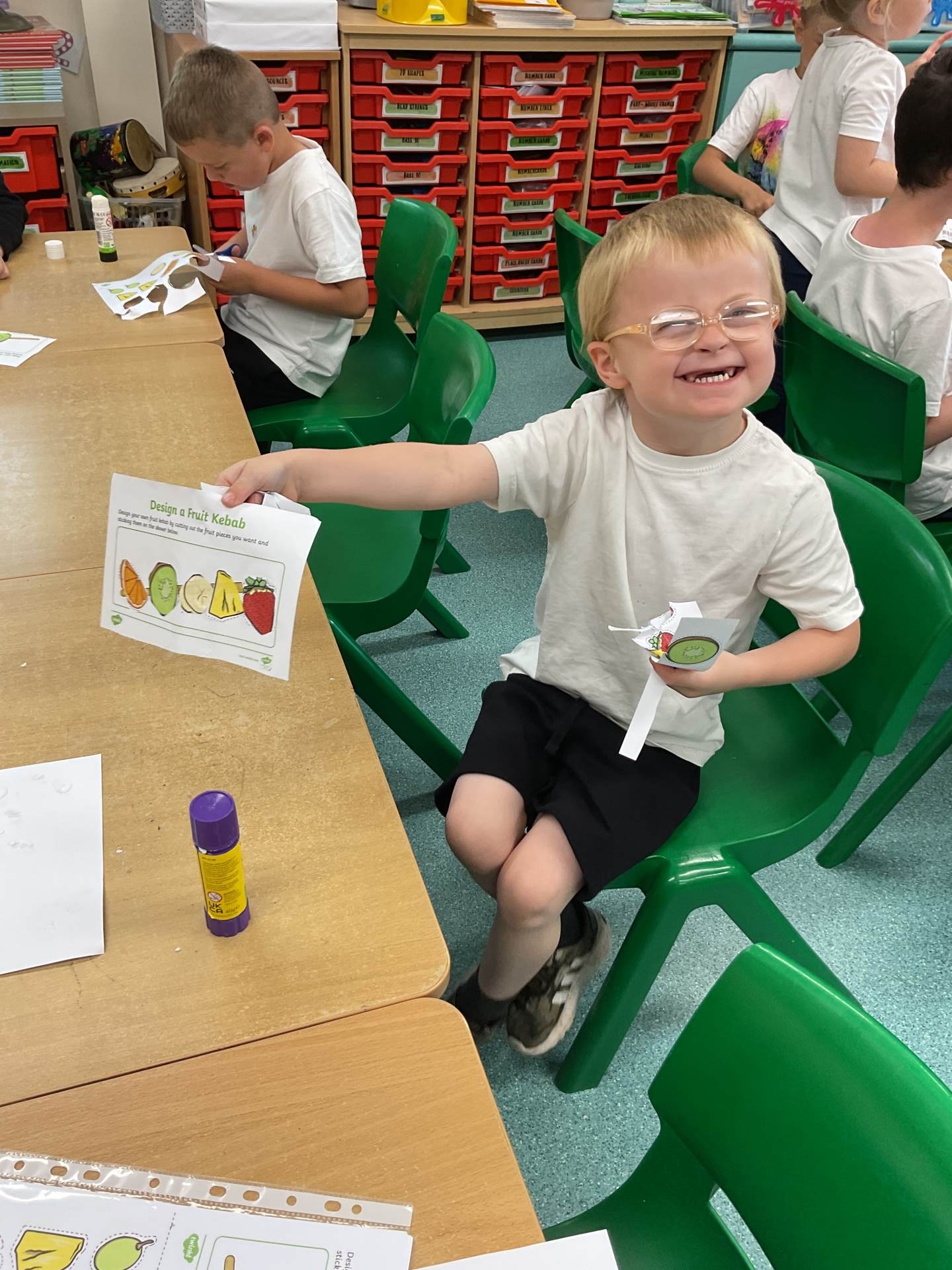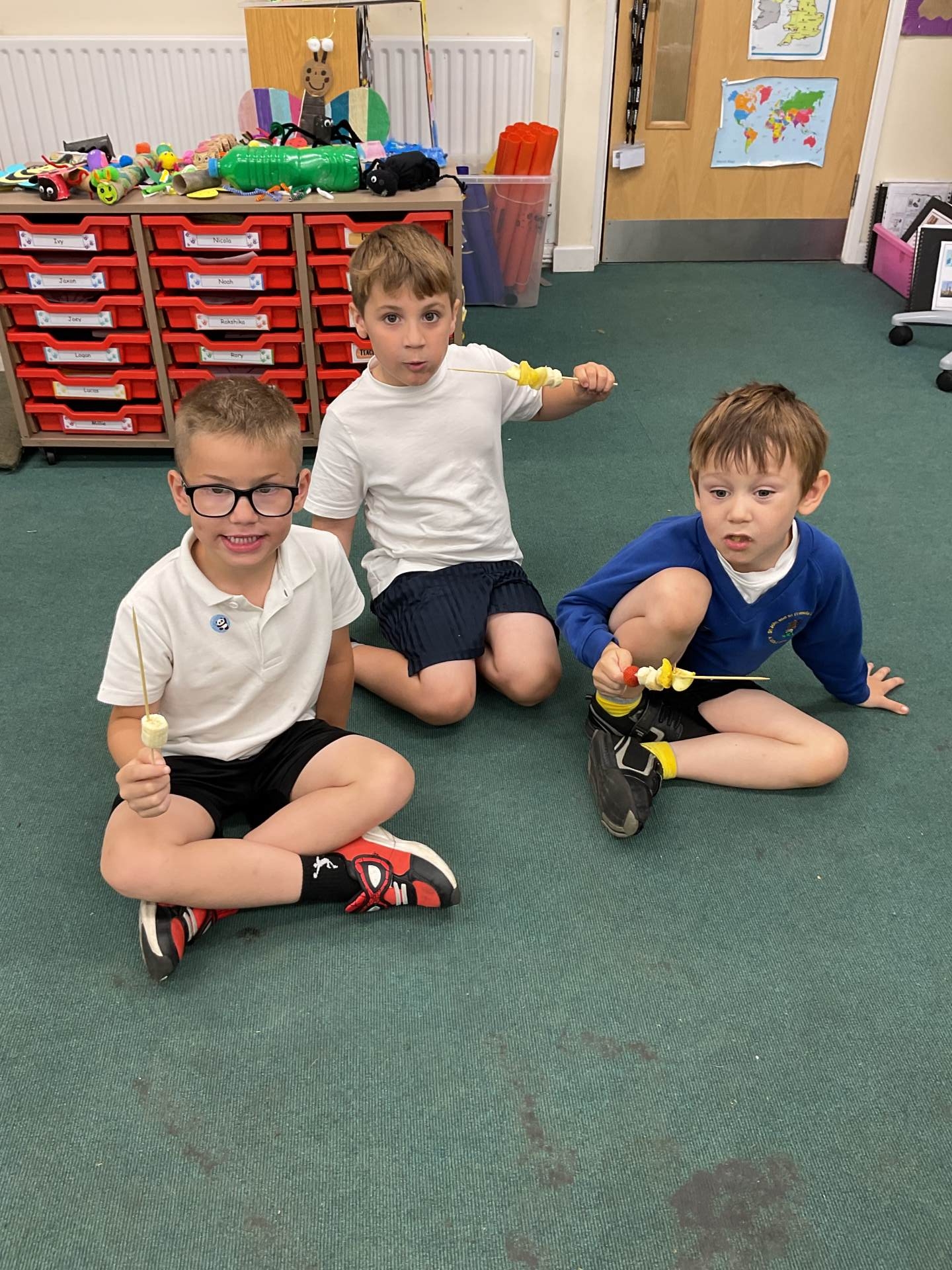 This morning in Sparrow class we have been thinking about healthy eating and how the different food groups support different parts of our bodies. We then made our own fruit kebabs. They tasted delicious. We also engaged in a range of healthy eating activities.