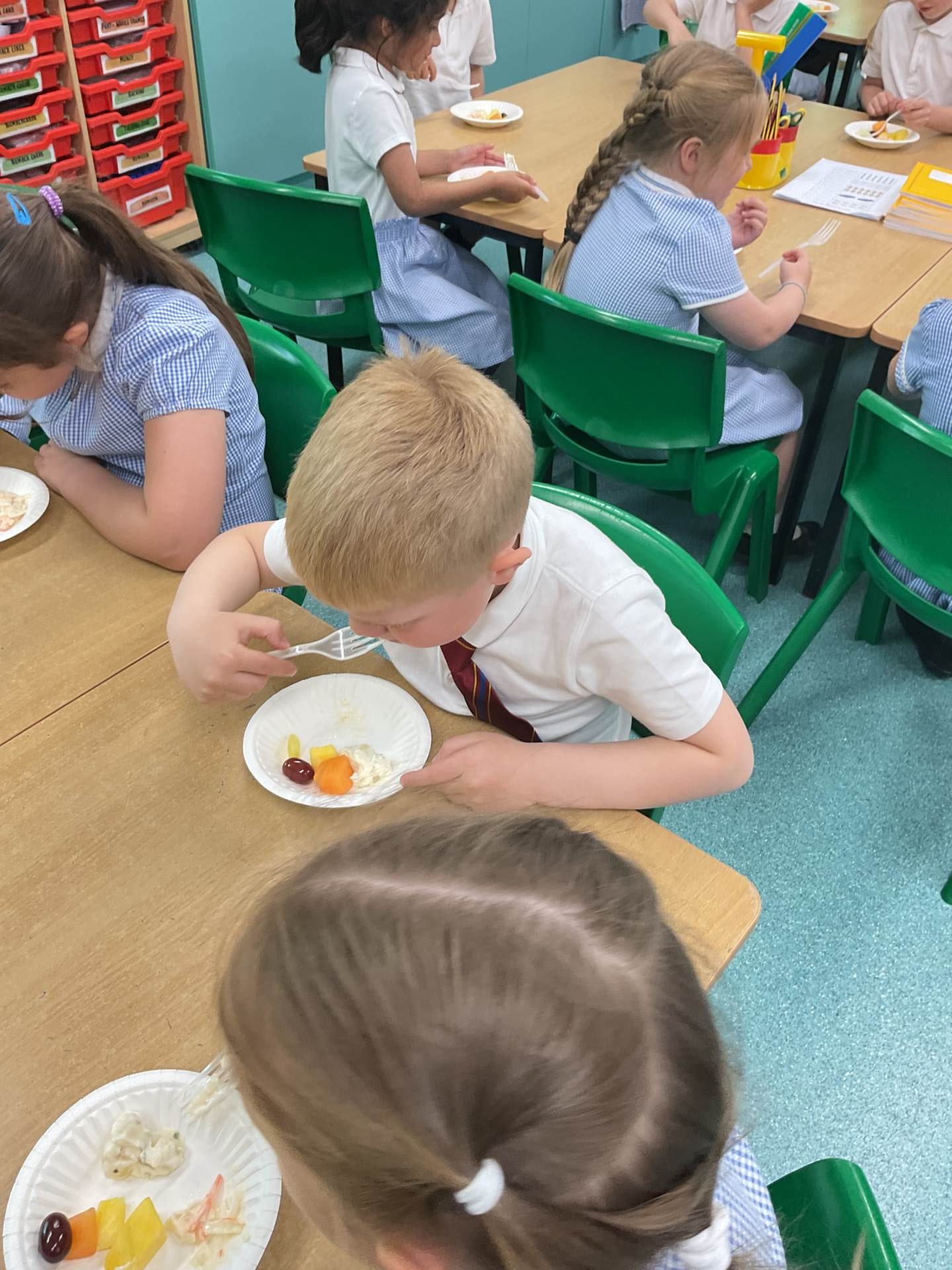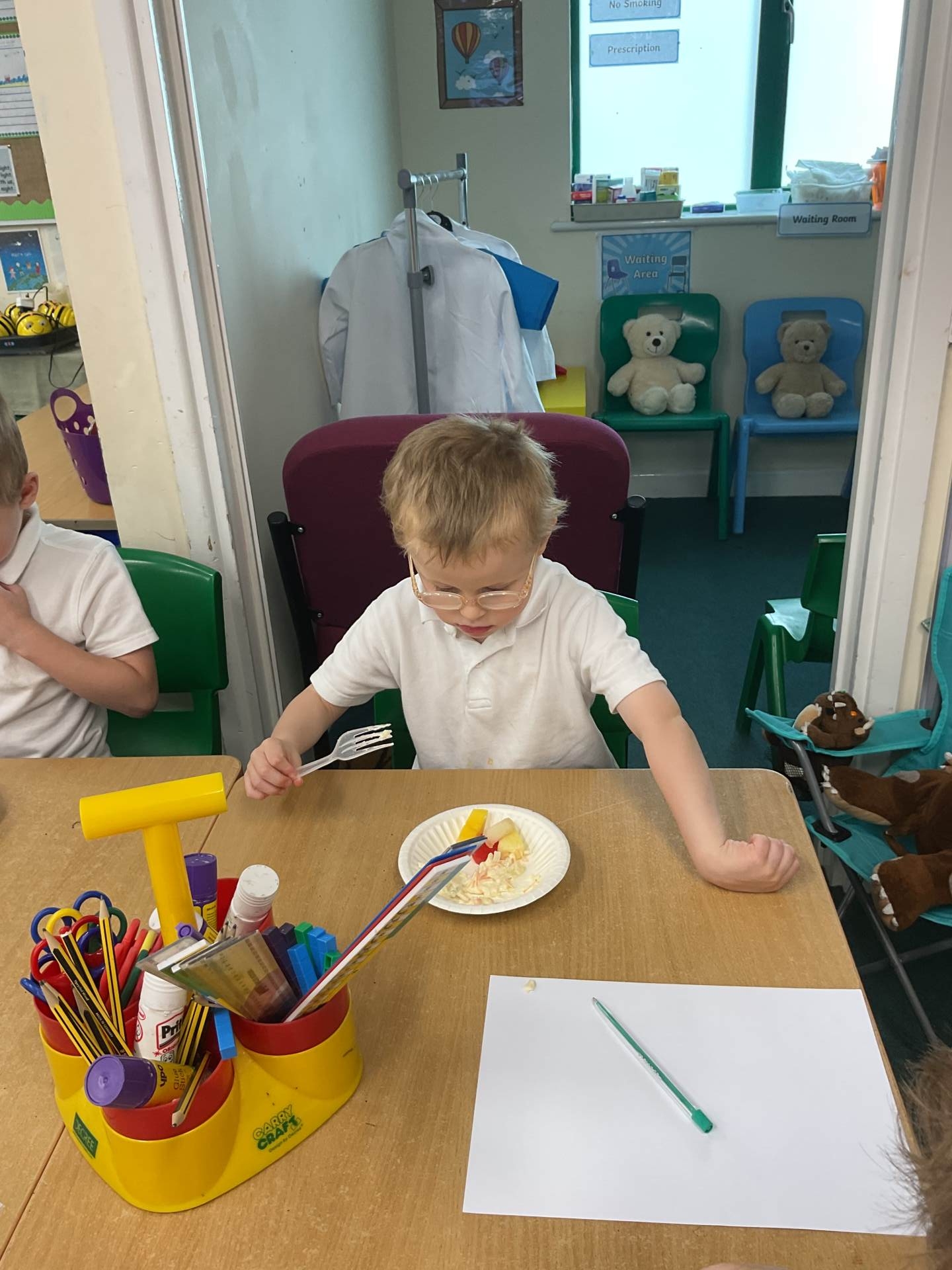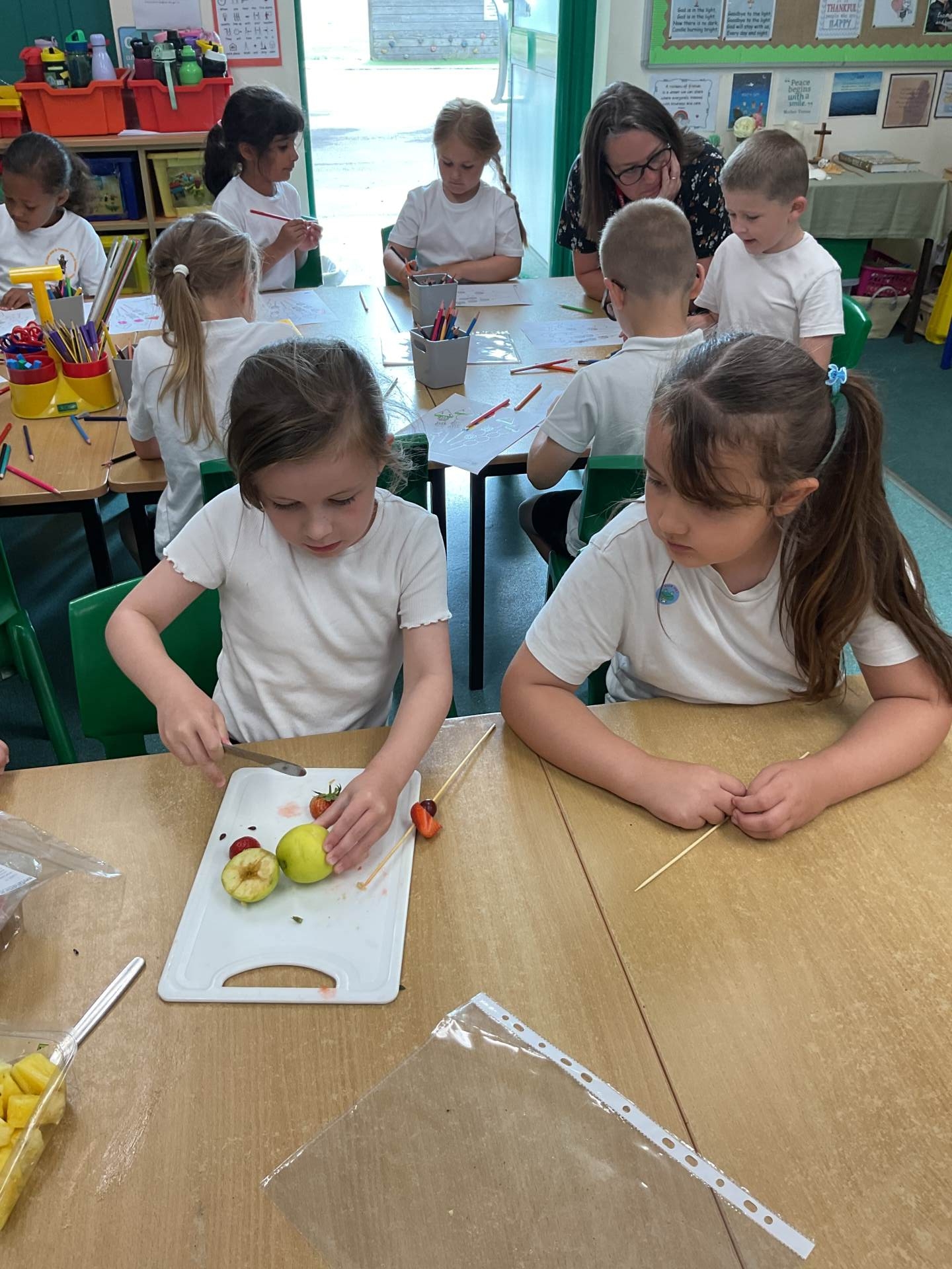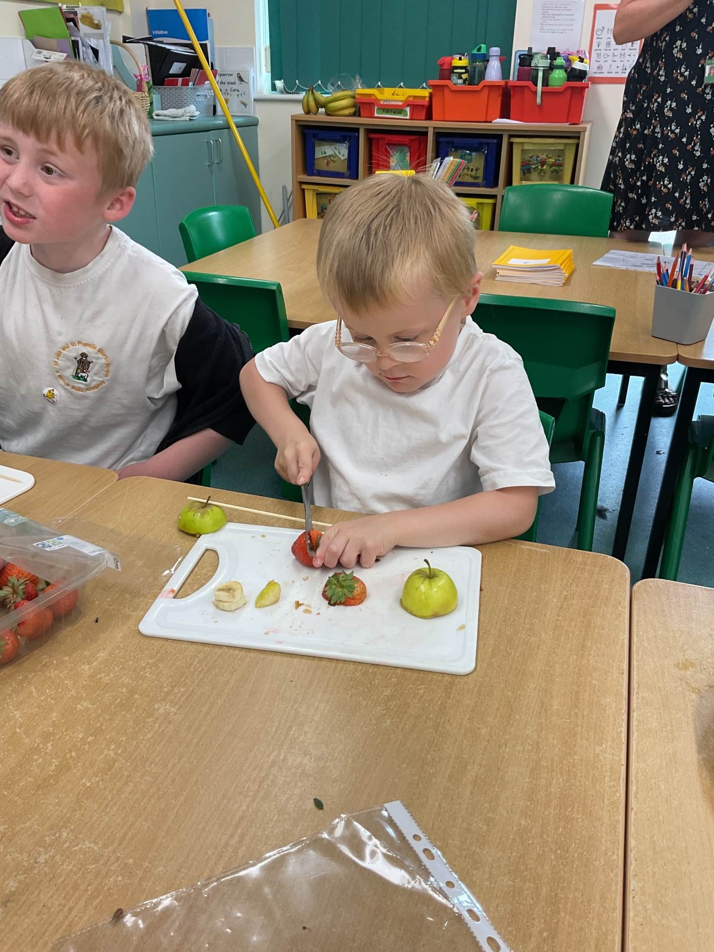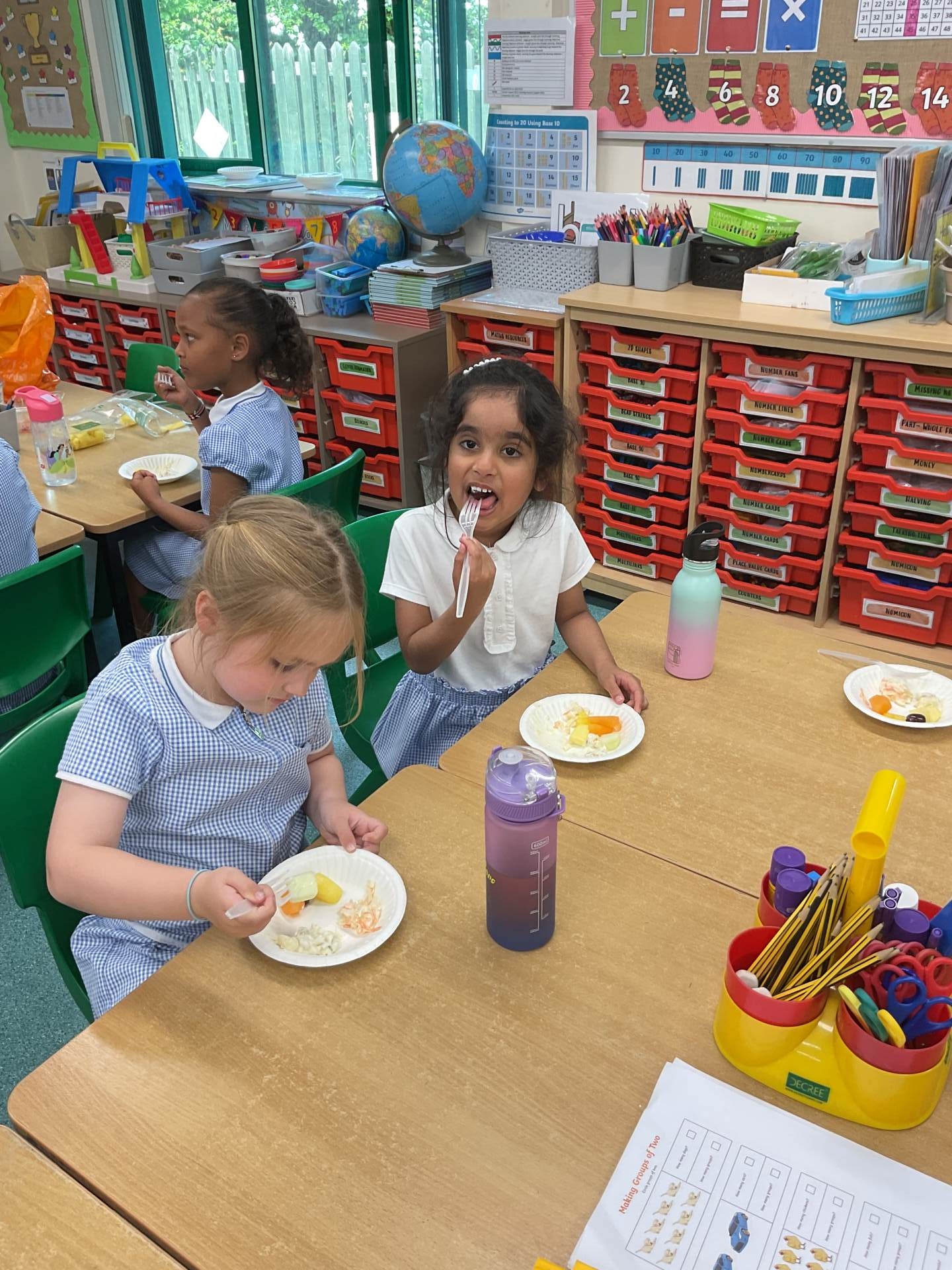 This morning in Sparrow class we have been thinking about healthy eating and how the different food groups support different parts of our bodies. We then made our own fruit kebabs. They tasted delicious. We also engaged in a range of healthy eating activities.