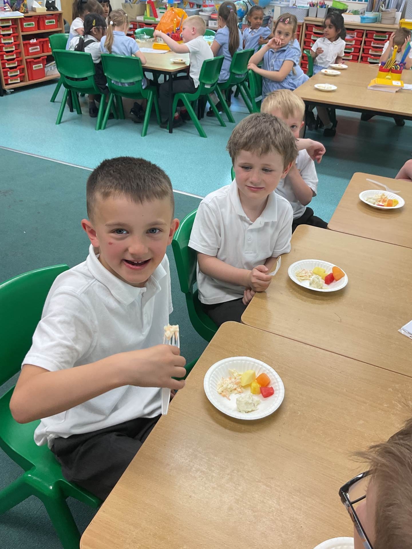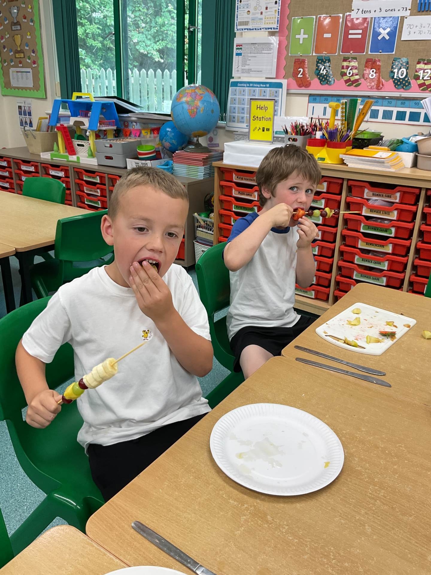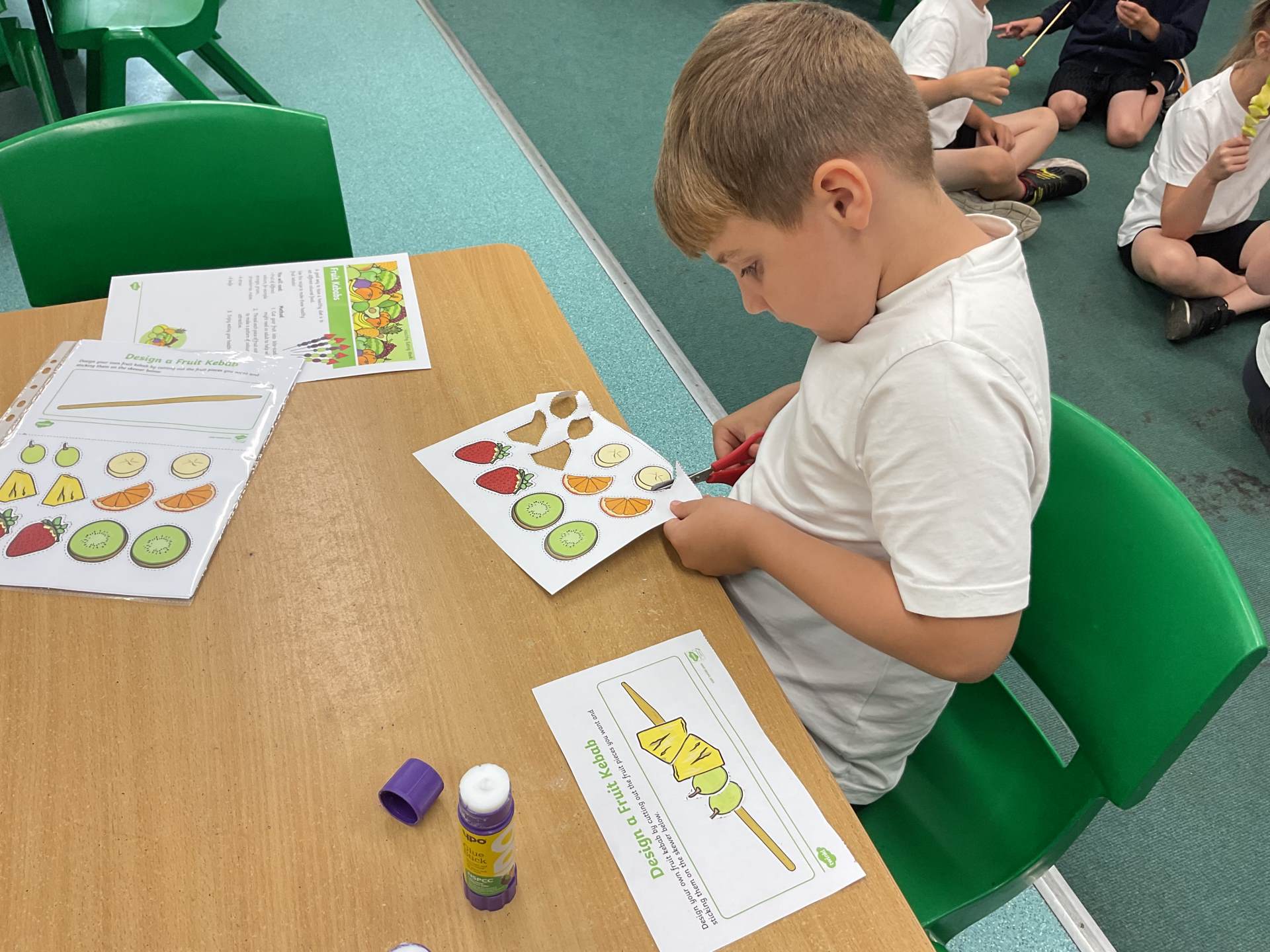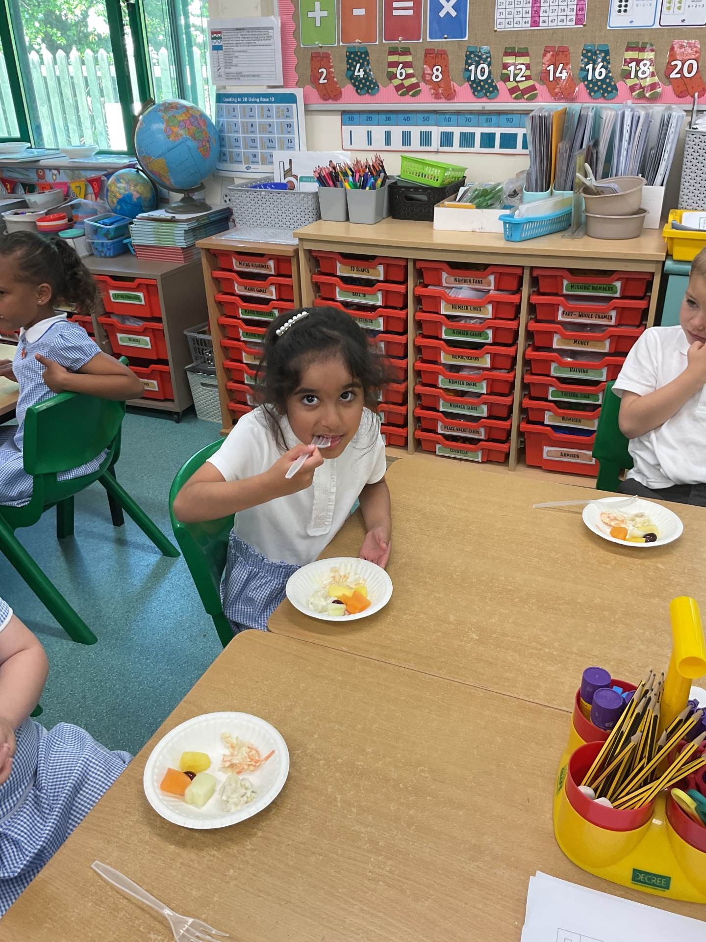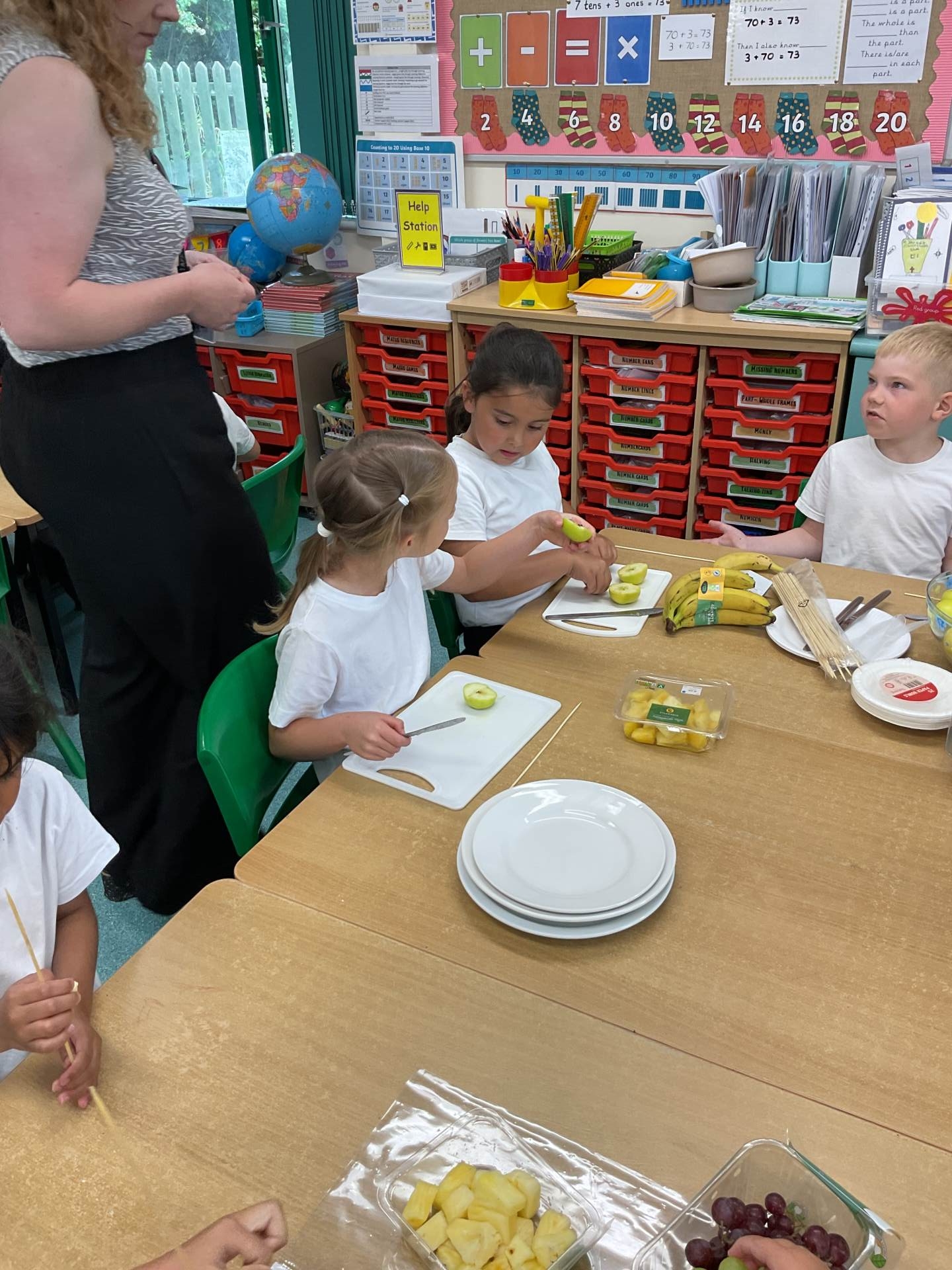 This morning in Sparrow class we have been thinking about healthy eating and how the different food groups support different parts of our bodies. We then made our own fruit kebabs. They tasted delicious. We also engaged in a range of healthy eating activities.