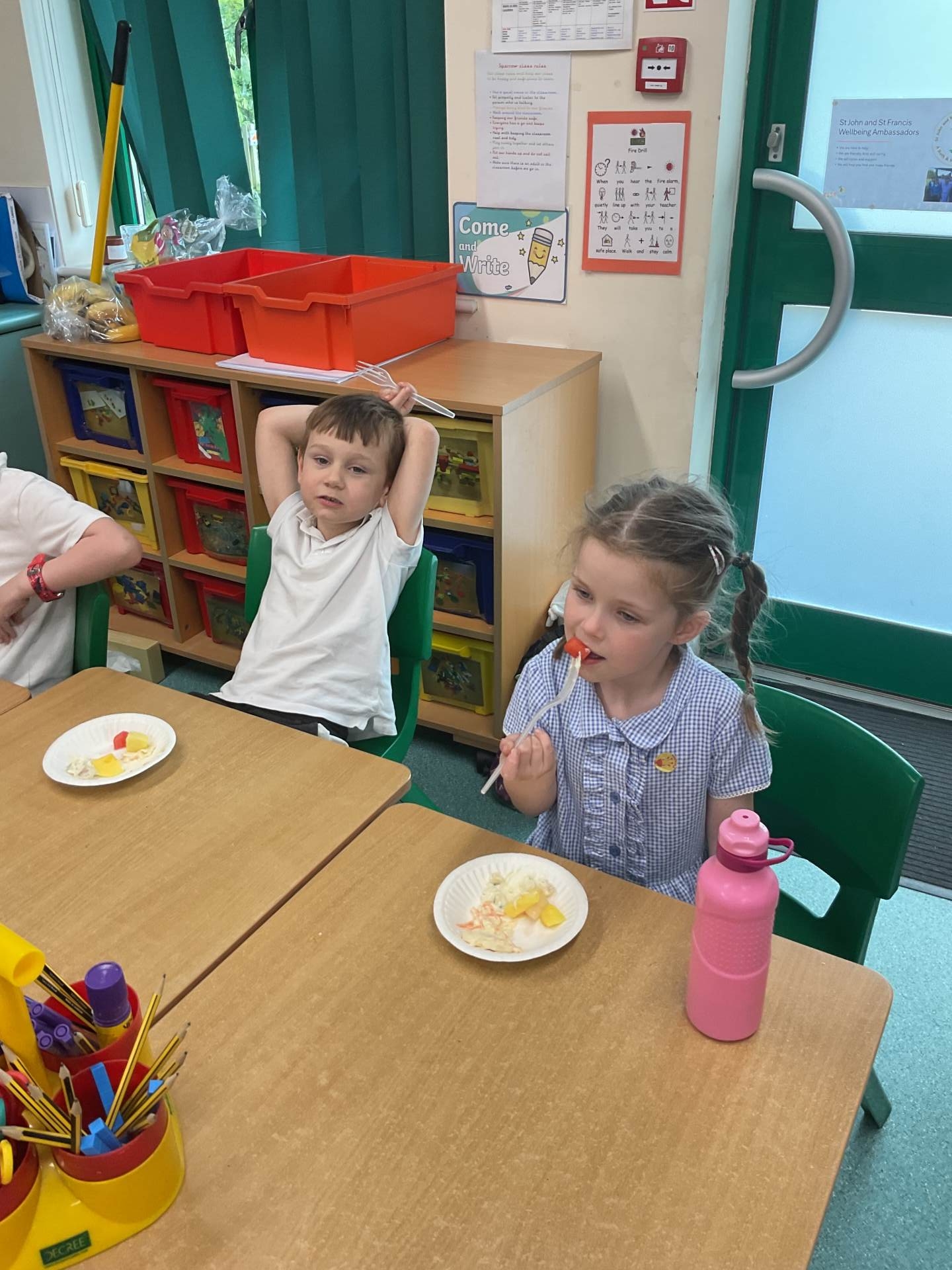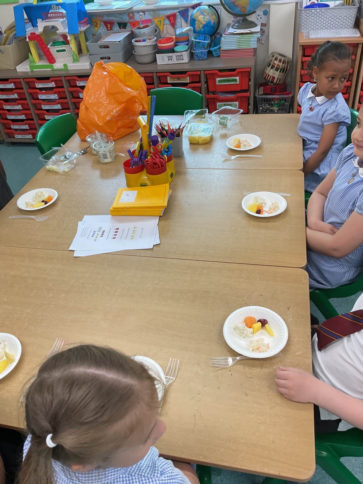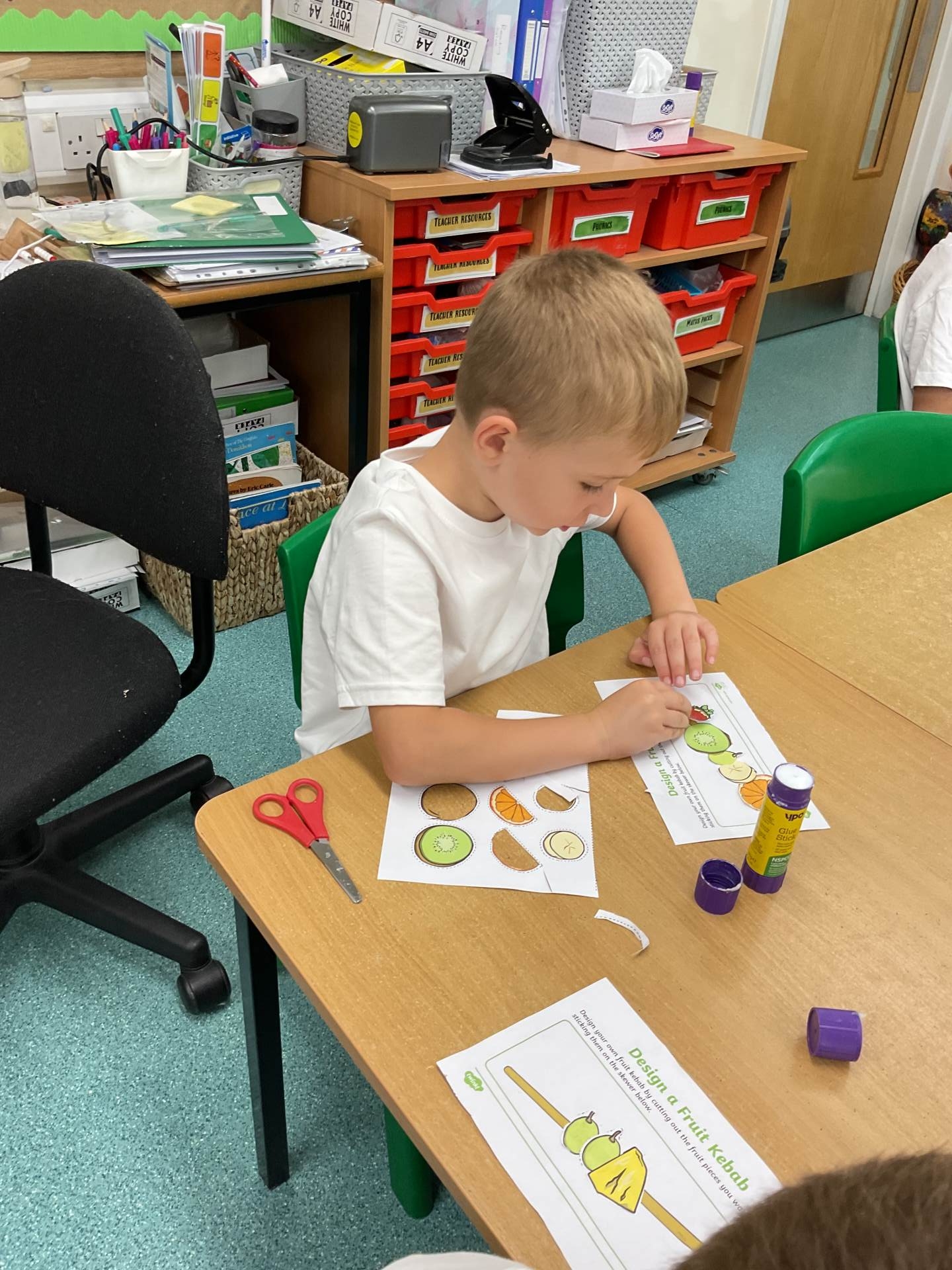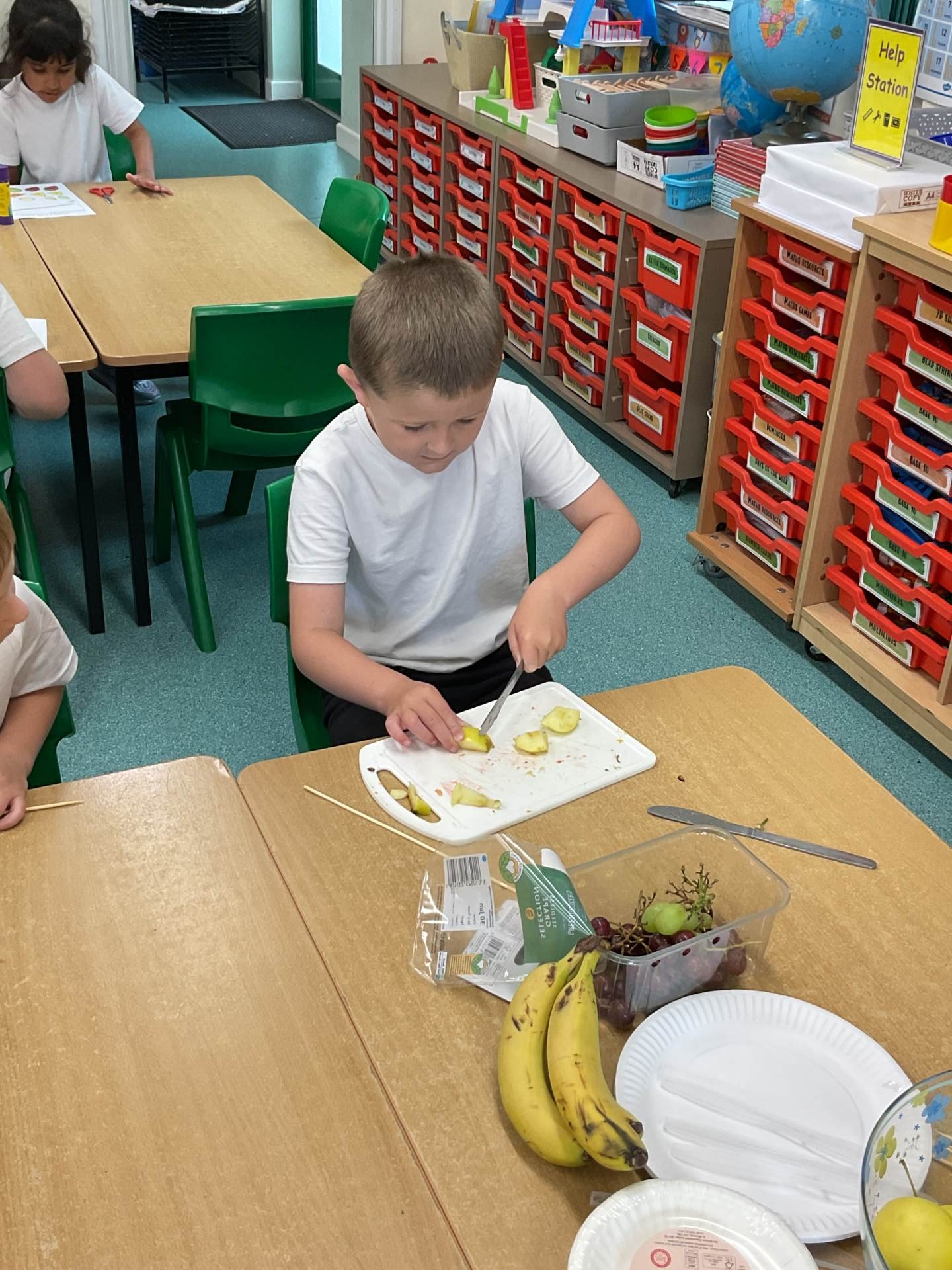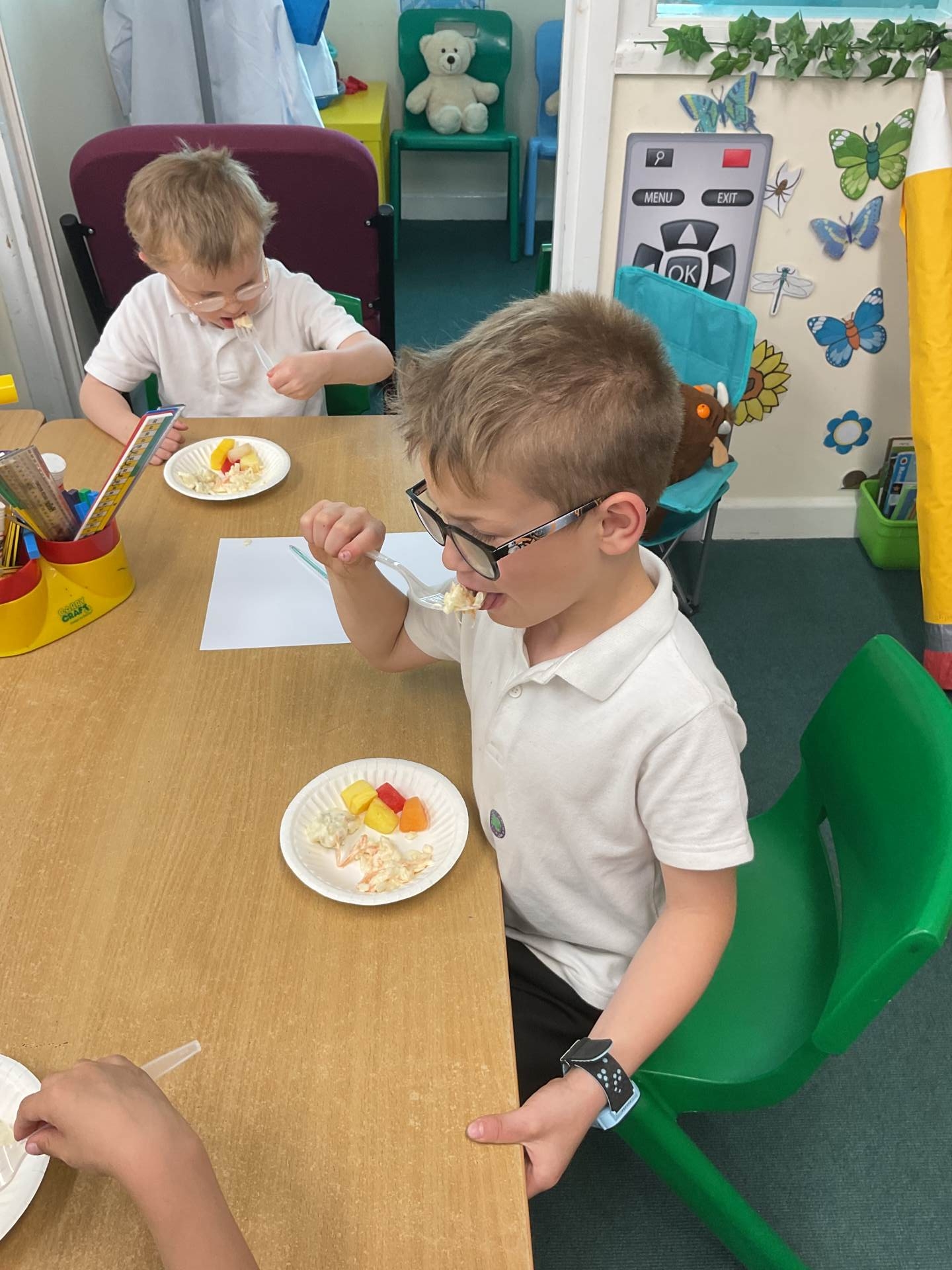 This morning in Sparrow class we have been thinking about healthy eating and how the different food groups support different parts of our bodies. We then made our own fruit kebabs. They tasted delicious. We also engaged in a range of healthy eating activities.