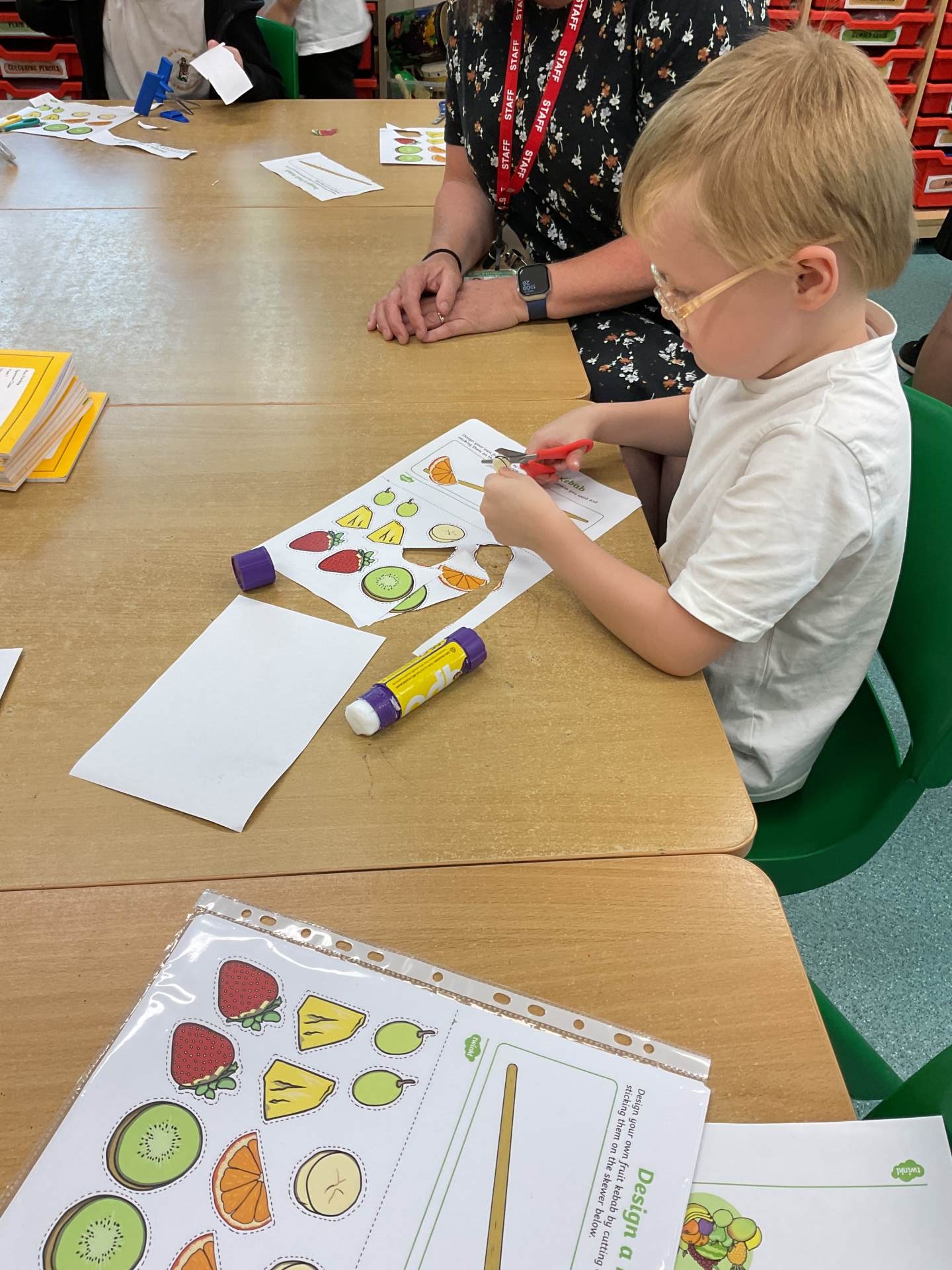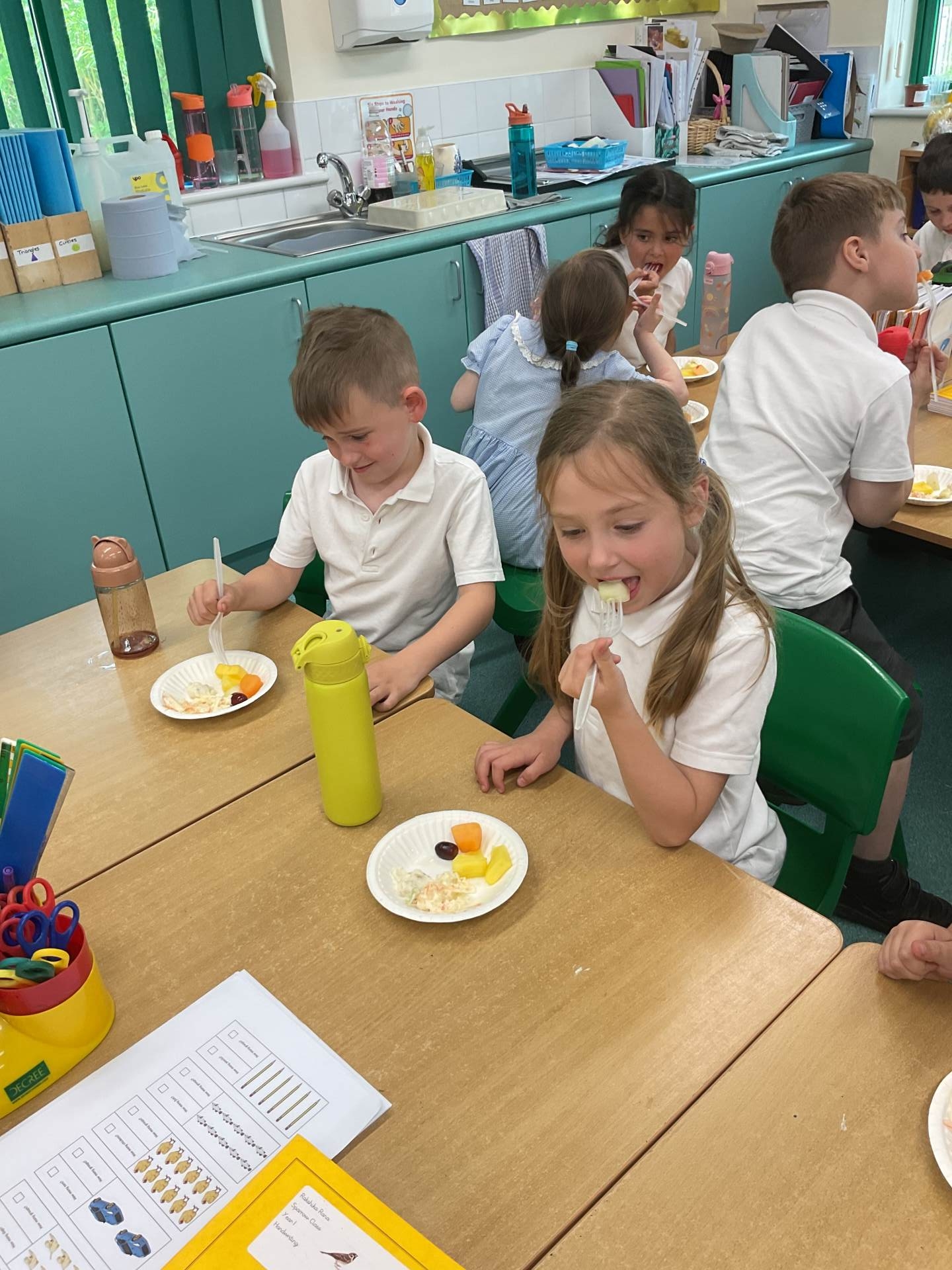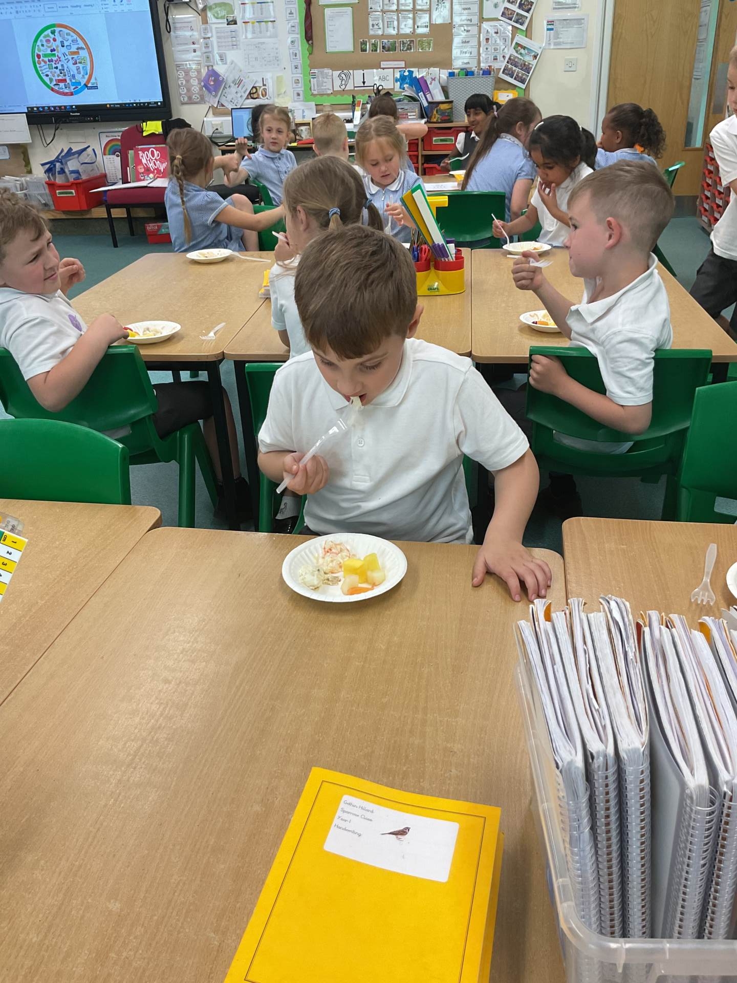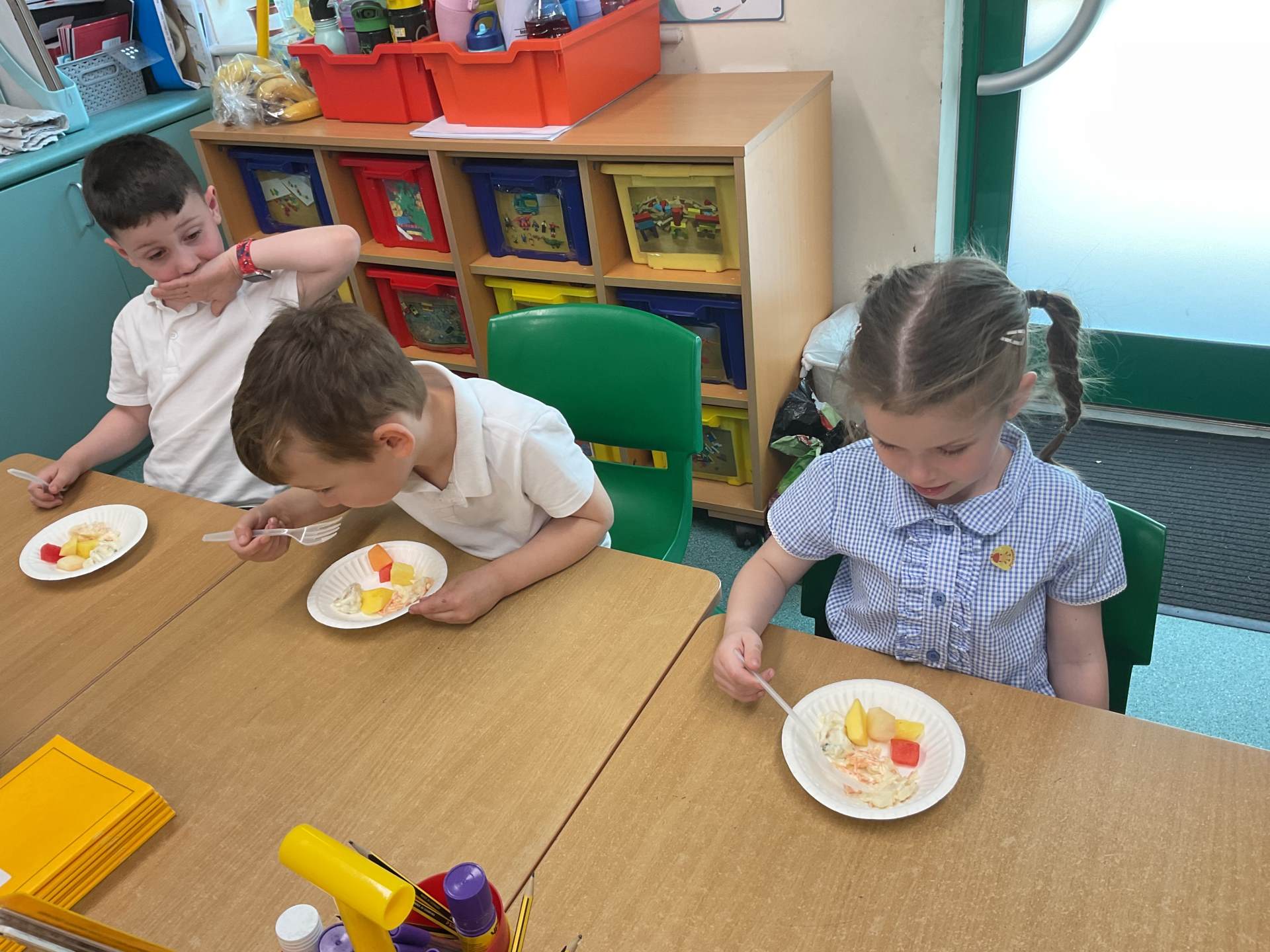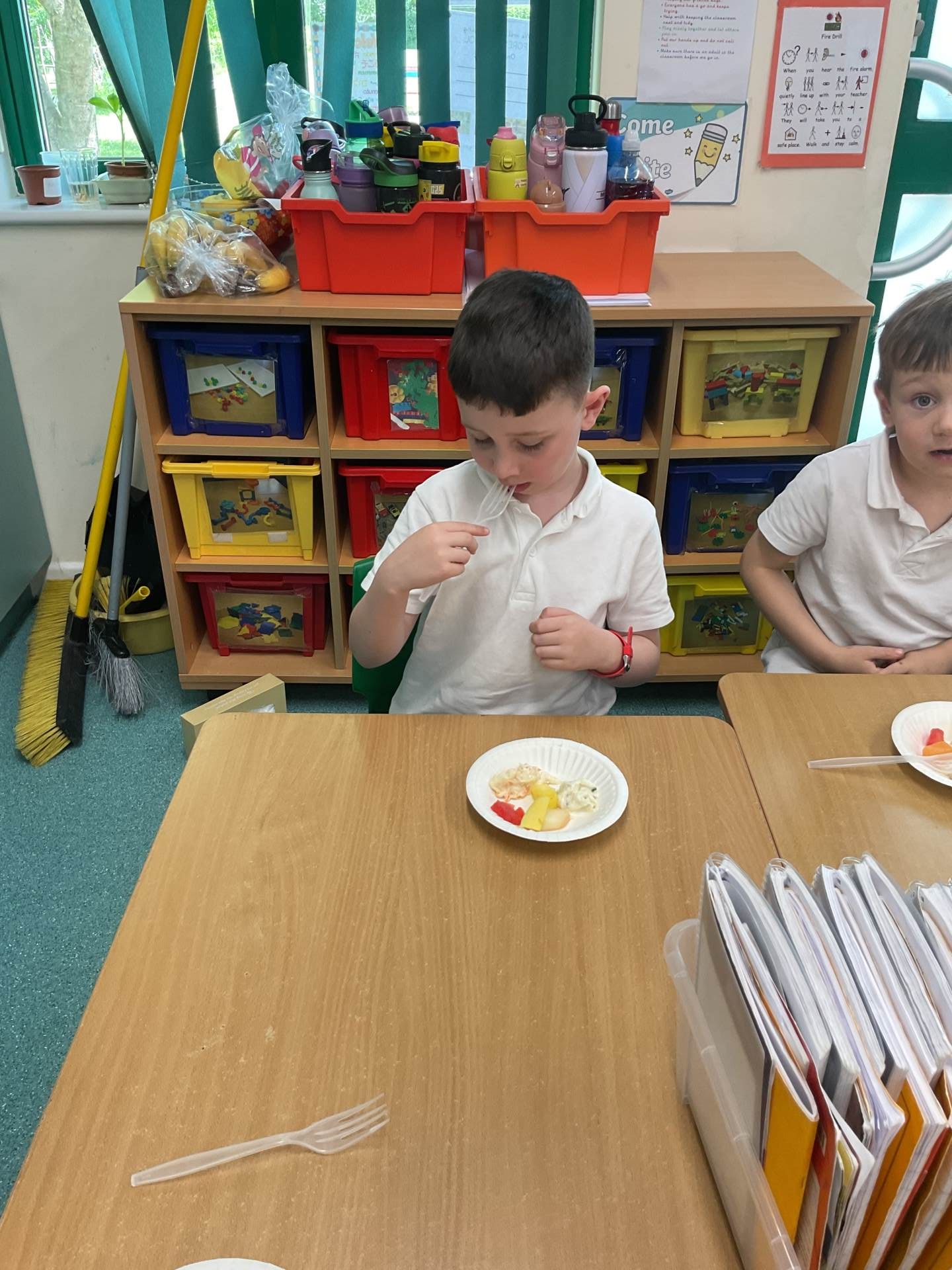 This morning in Sparrow class we have been thinking about healthy eating and how the different food groups support different parts of our bodies. We then made our own fruit kebabs. They tasted delicious. We also engaged in a range of healthy eating activities.