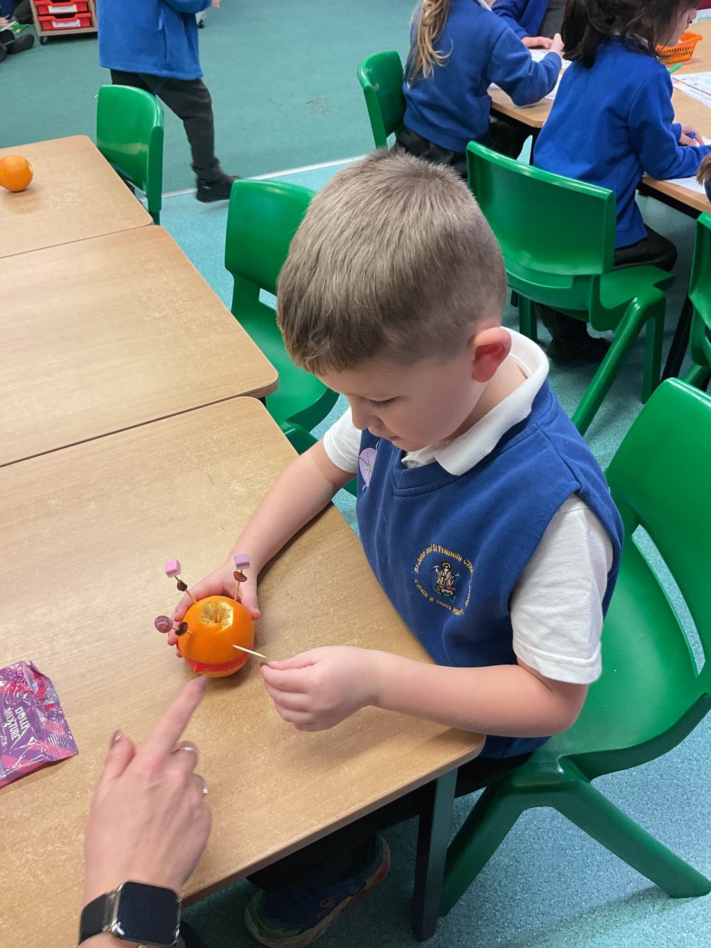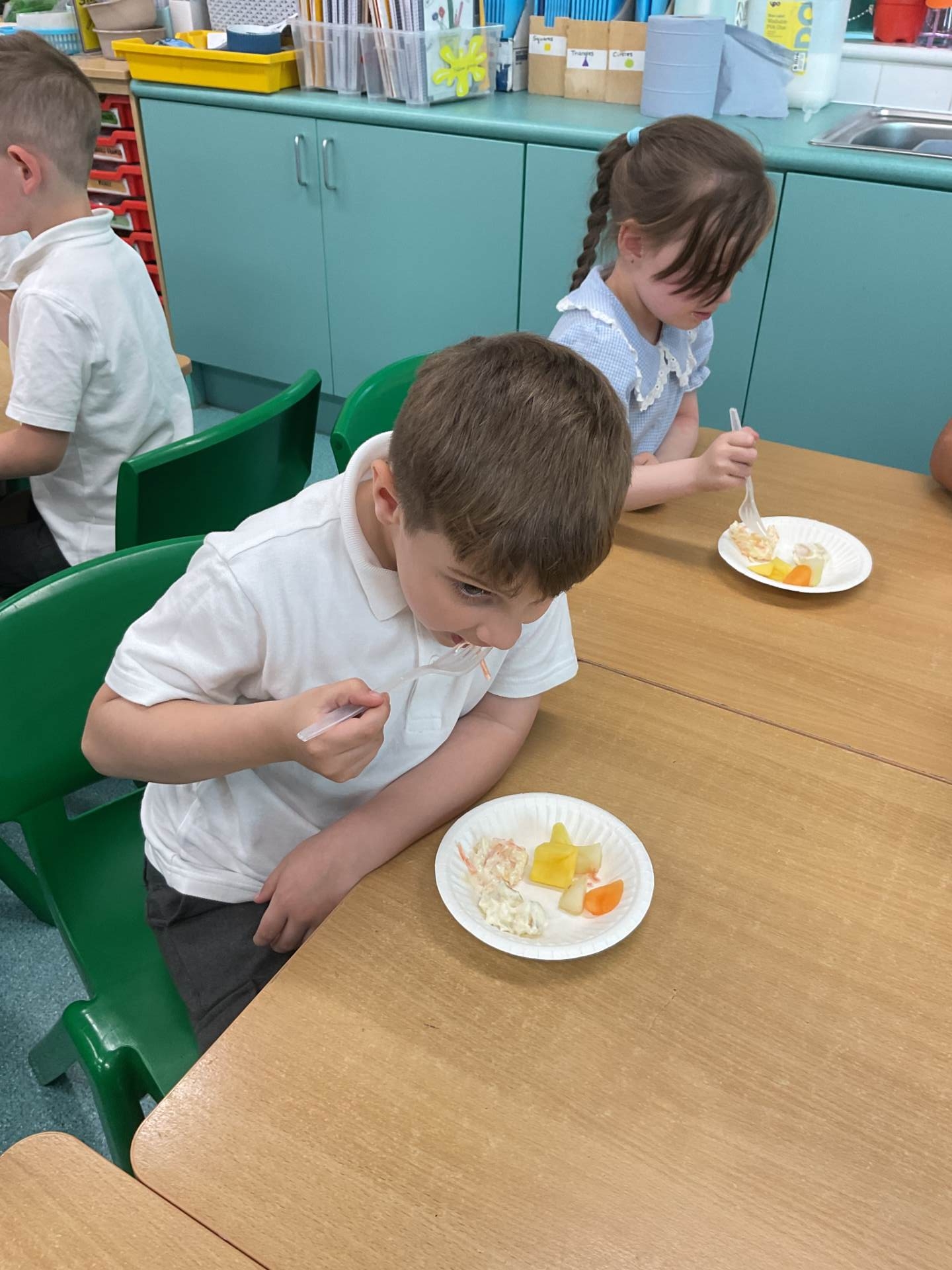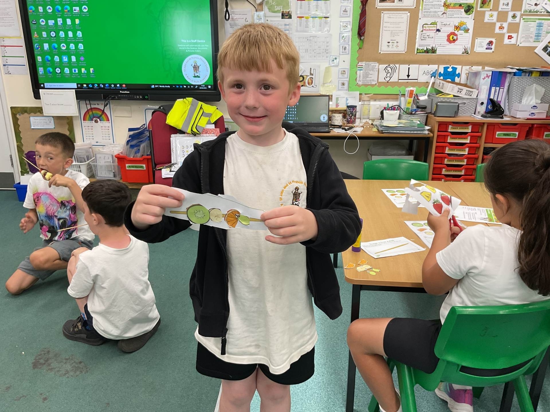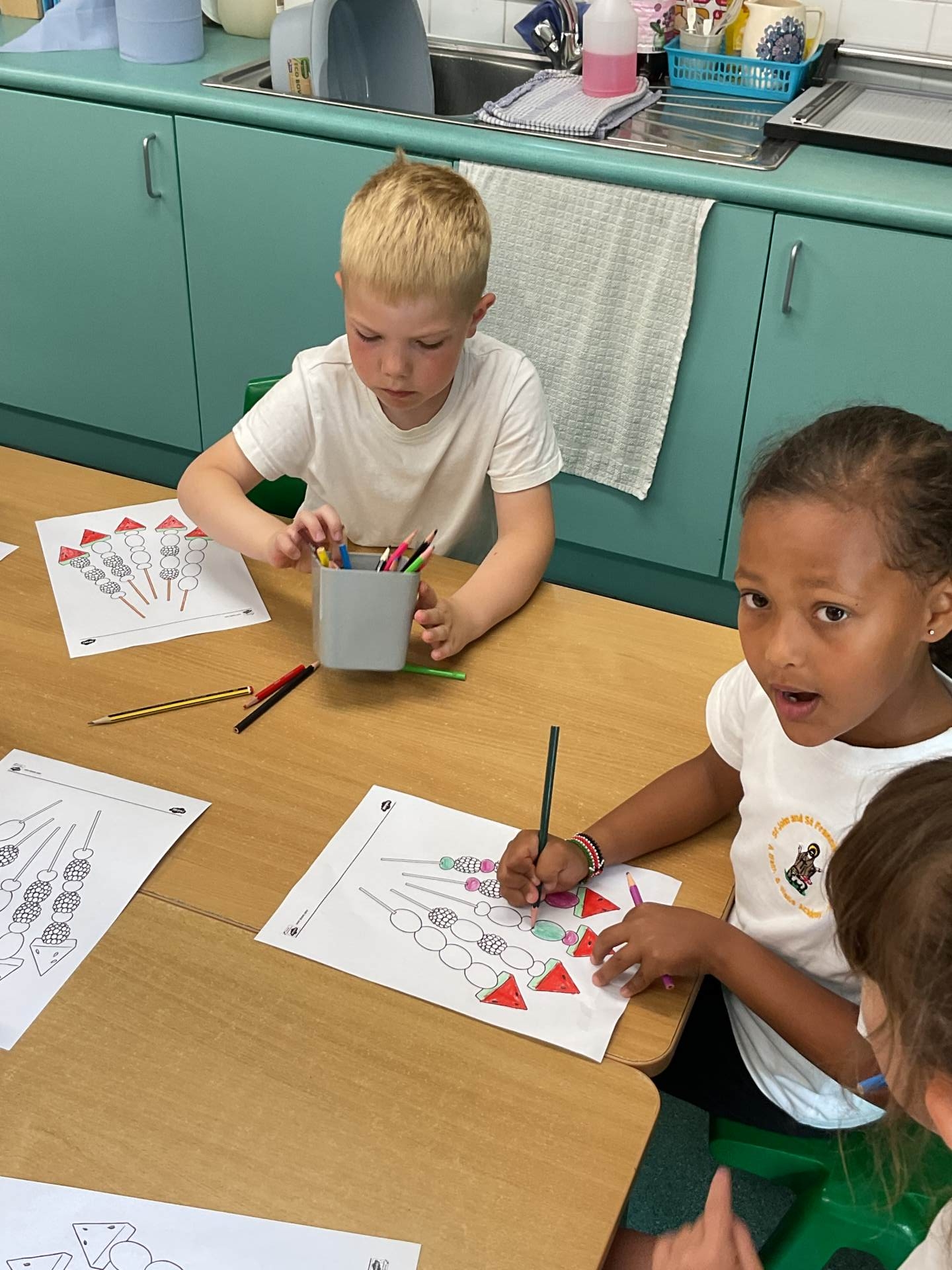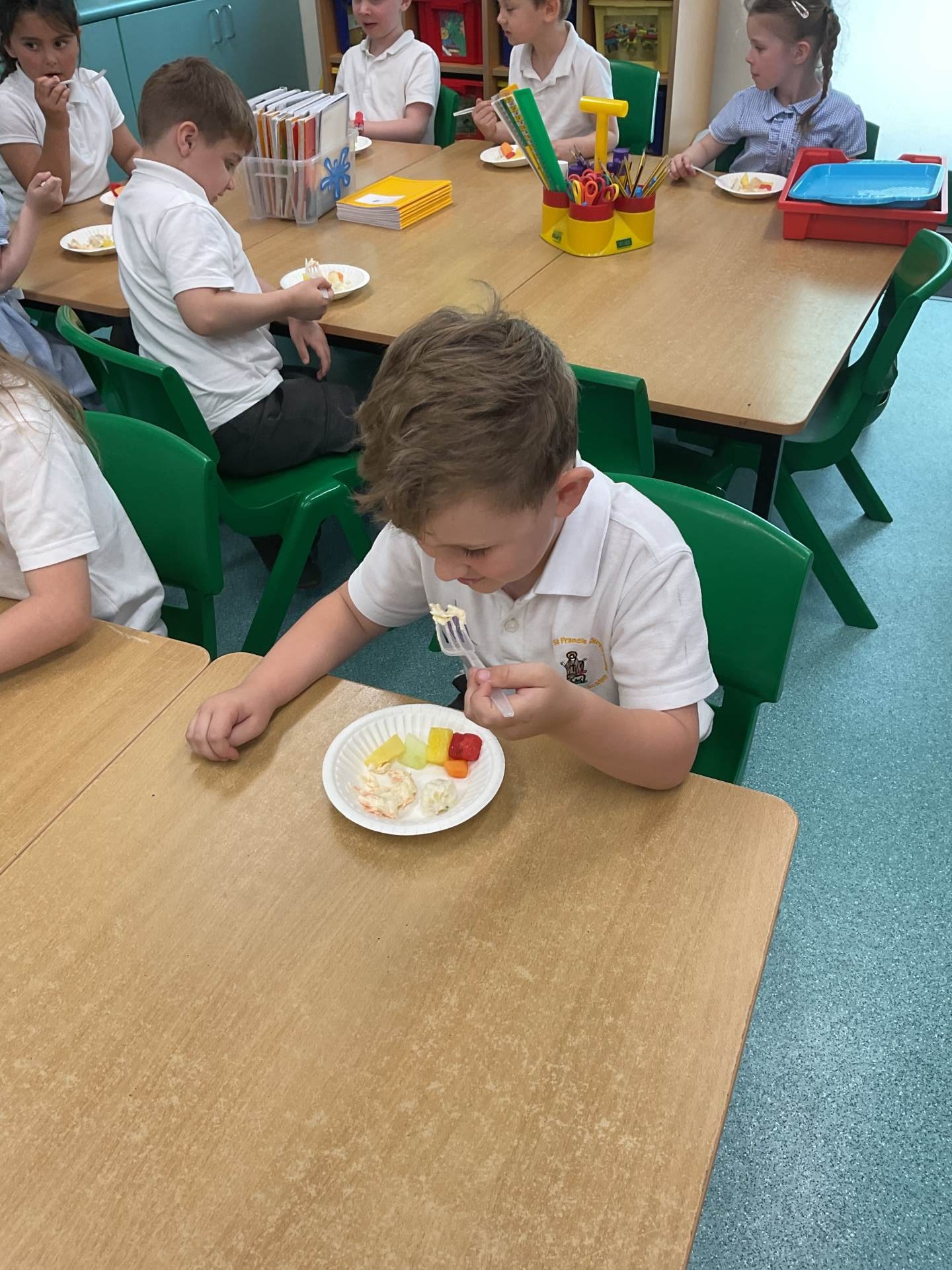 This morning in Sparrow class we have been thinking about healthy eating and how the different food groups support different parts of our bodies. We then made our own fruit kebabs. They tasted delicious. We also engaged in a range of healthy eating activities.