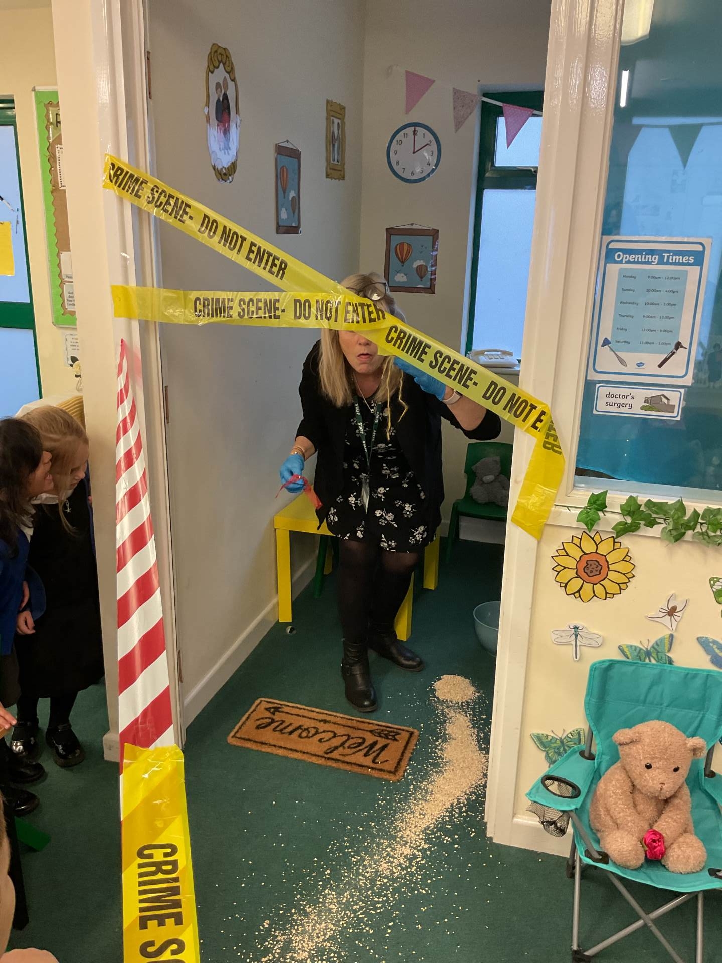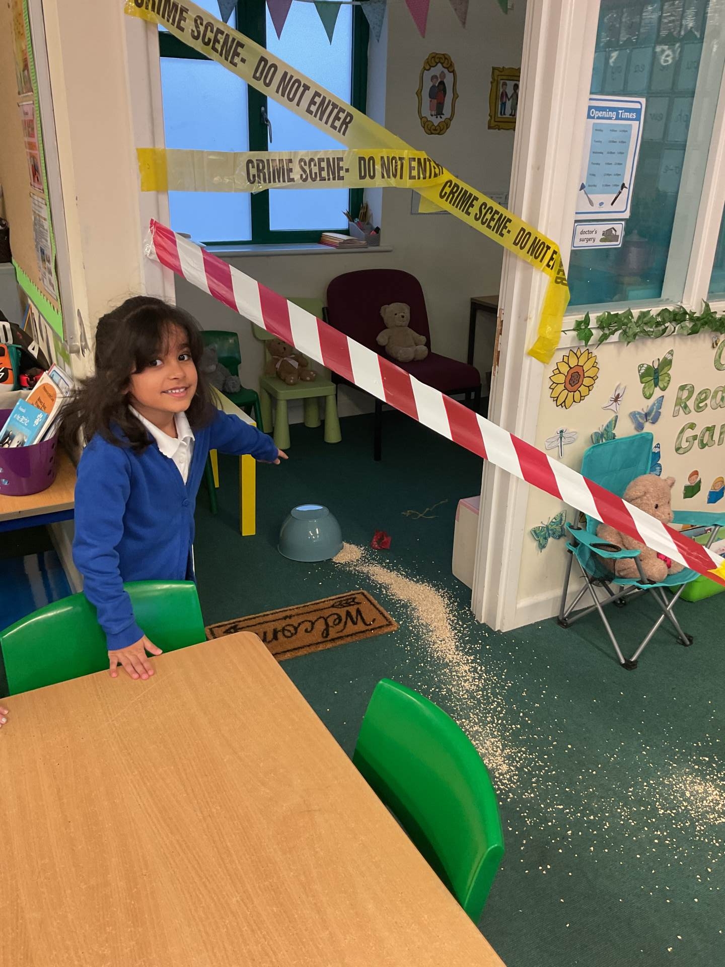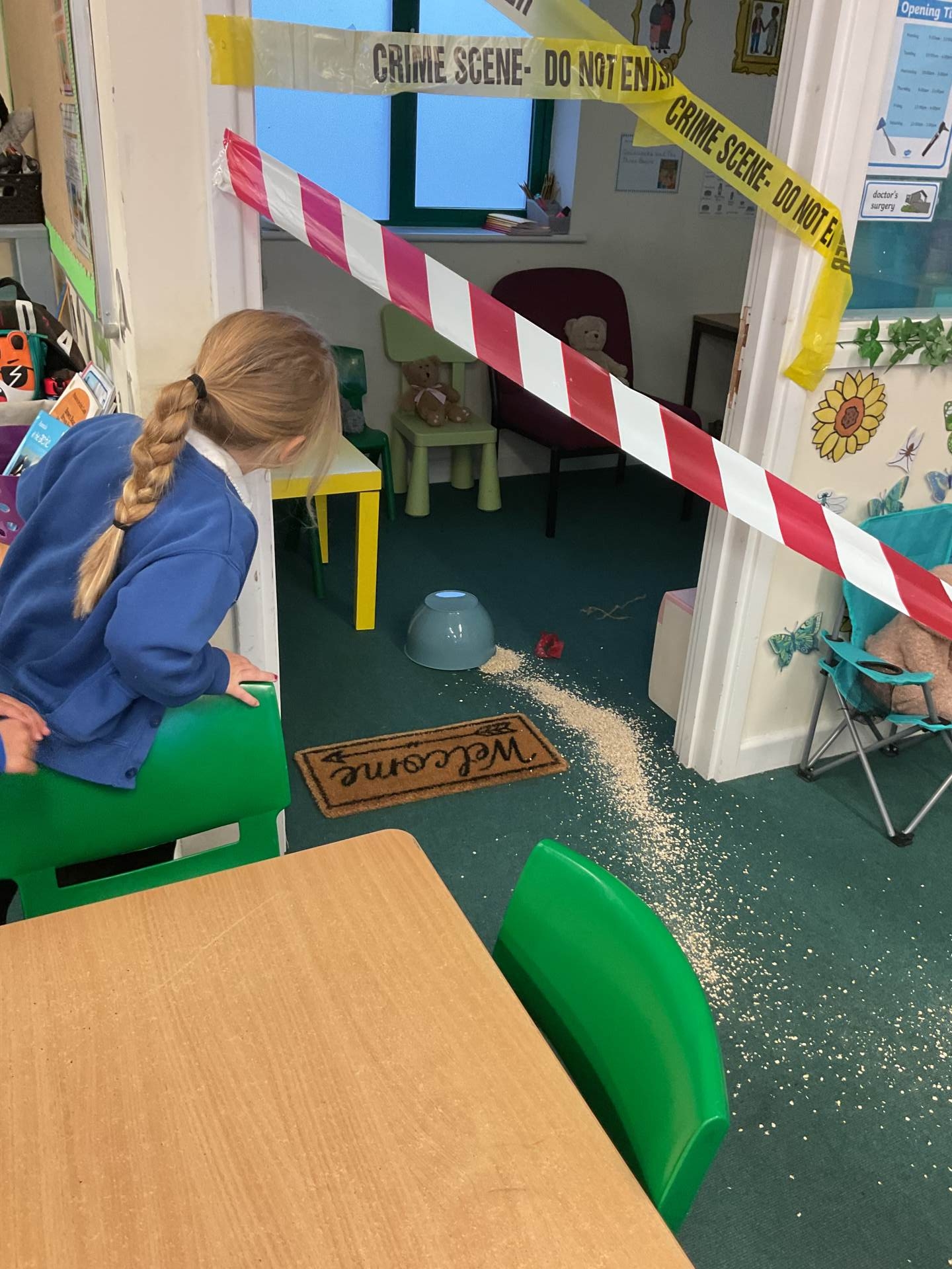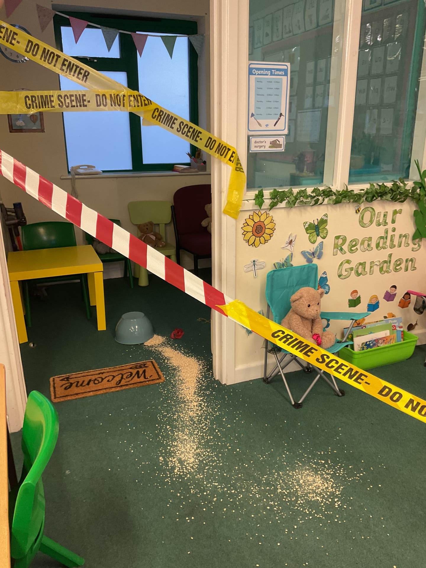 This morning we came into school and saw that our role-play area had been cornered off with police tape. The chairs had been knocked over and there was porridge all over the floor. What could have happened?