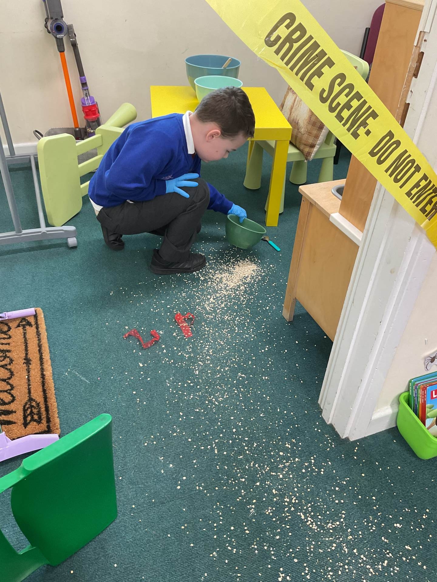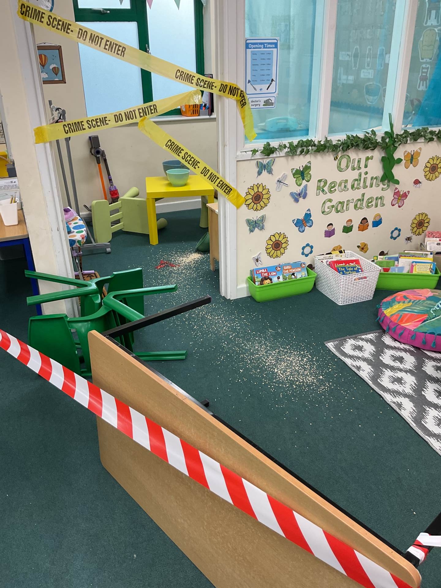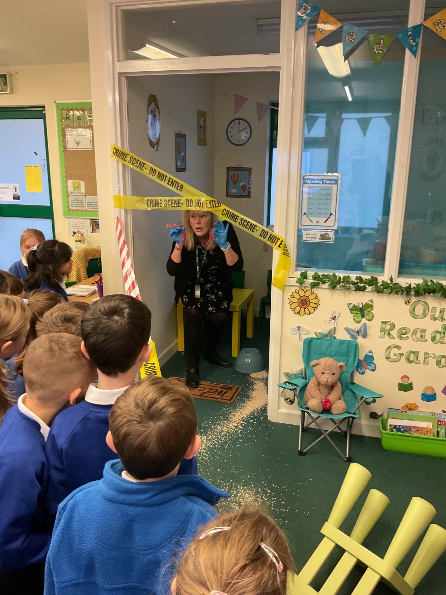 This morning we came into school and saw that our role-play area had been cornered off with police tape. The chairs had been knocked over and there was porridge all over the floor. What could have happened?