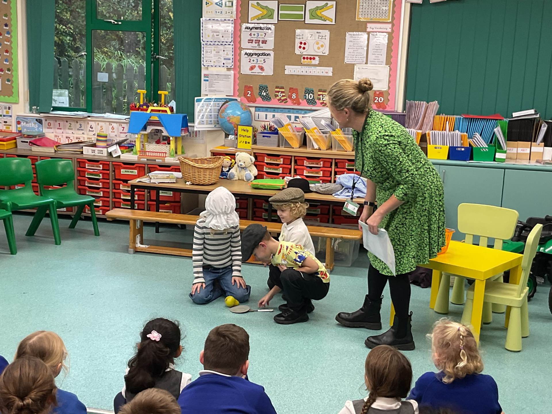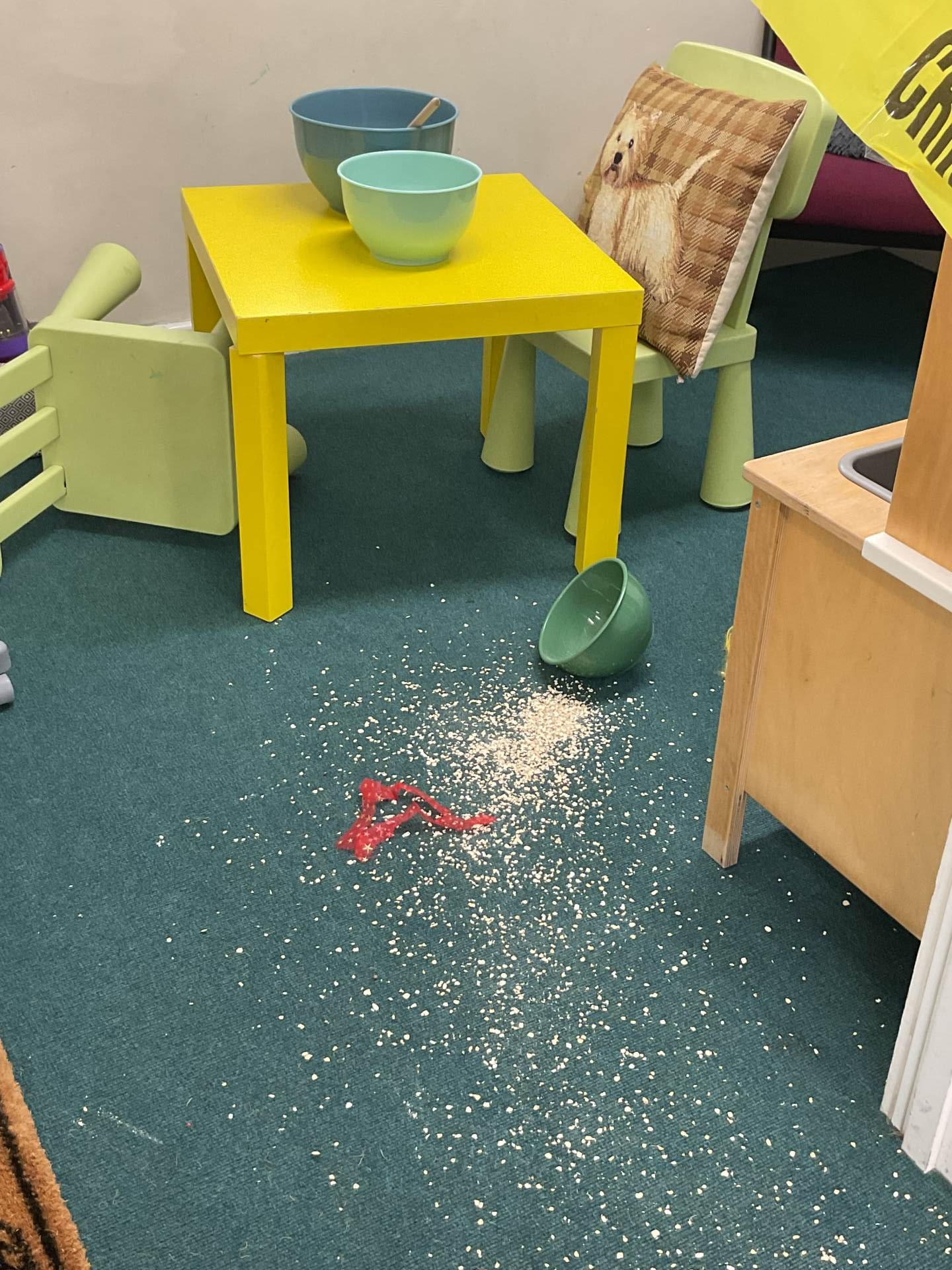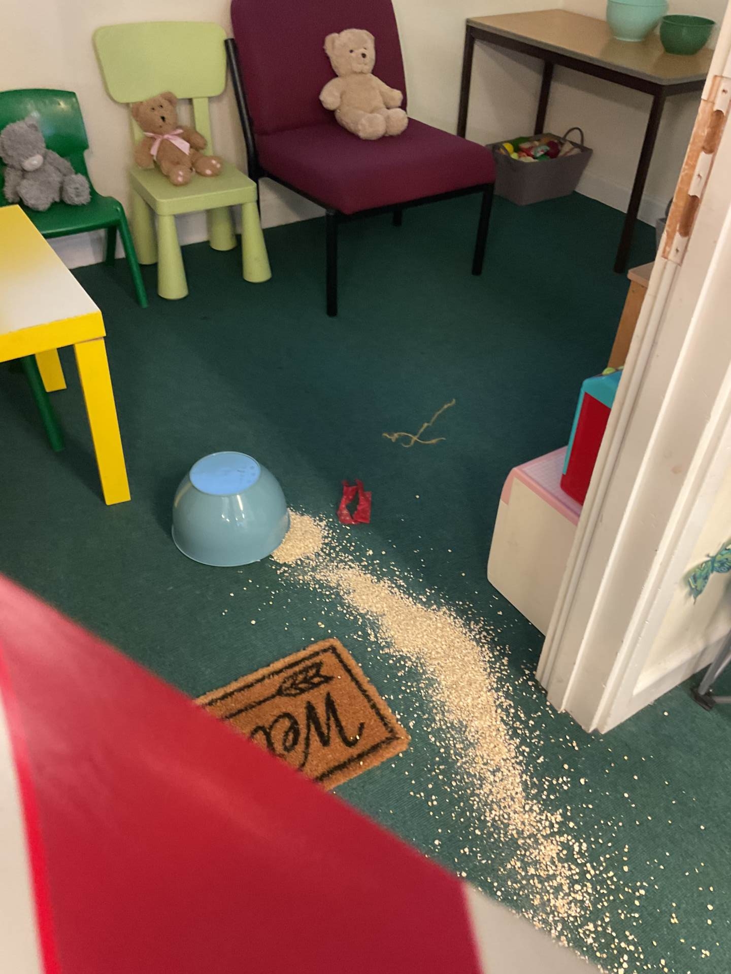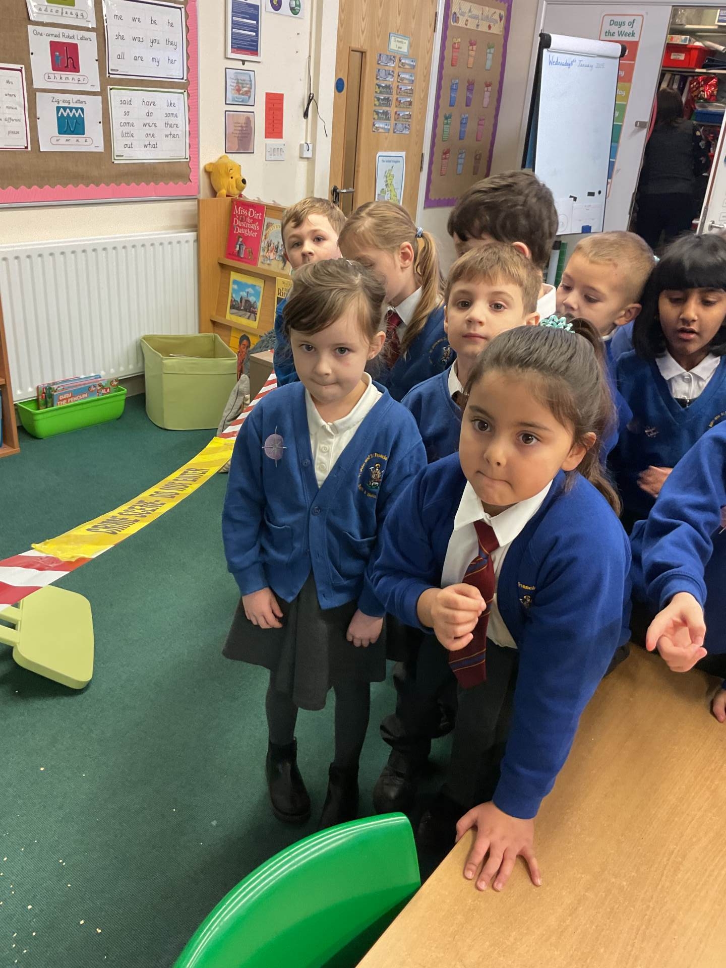 This morning we came into school and saw that our role-play area had been cornered off with police tape. The chairs had been knocked over and there was porridge all over the floor. What could have happened?