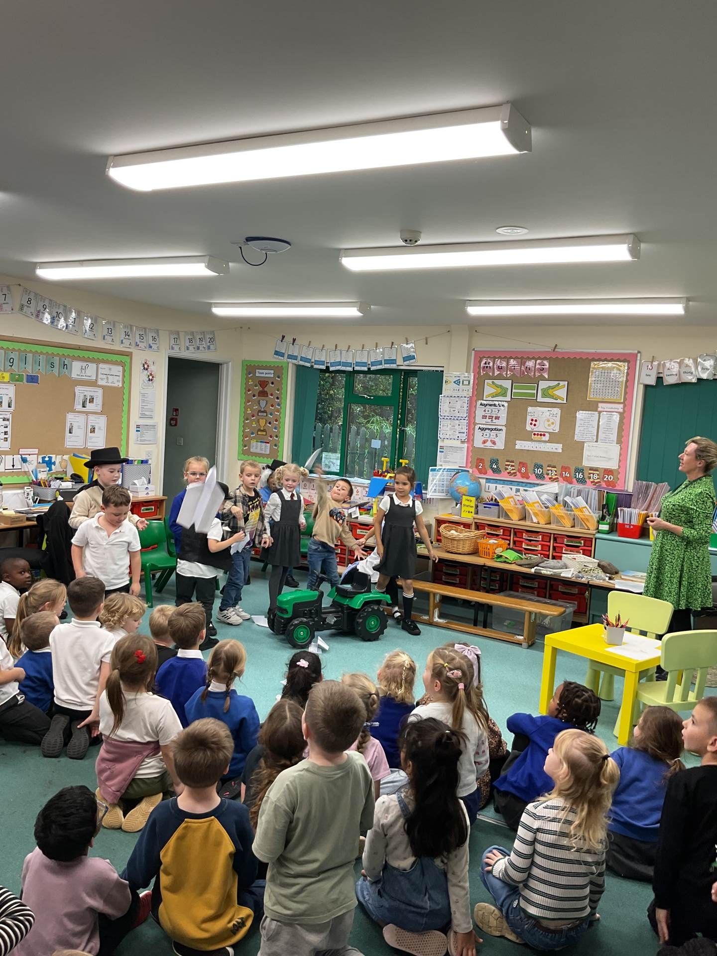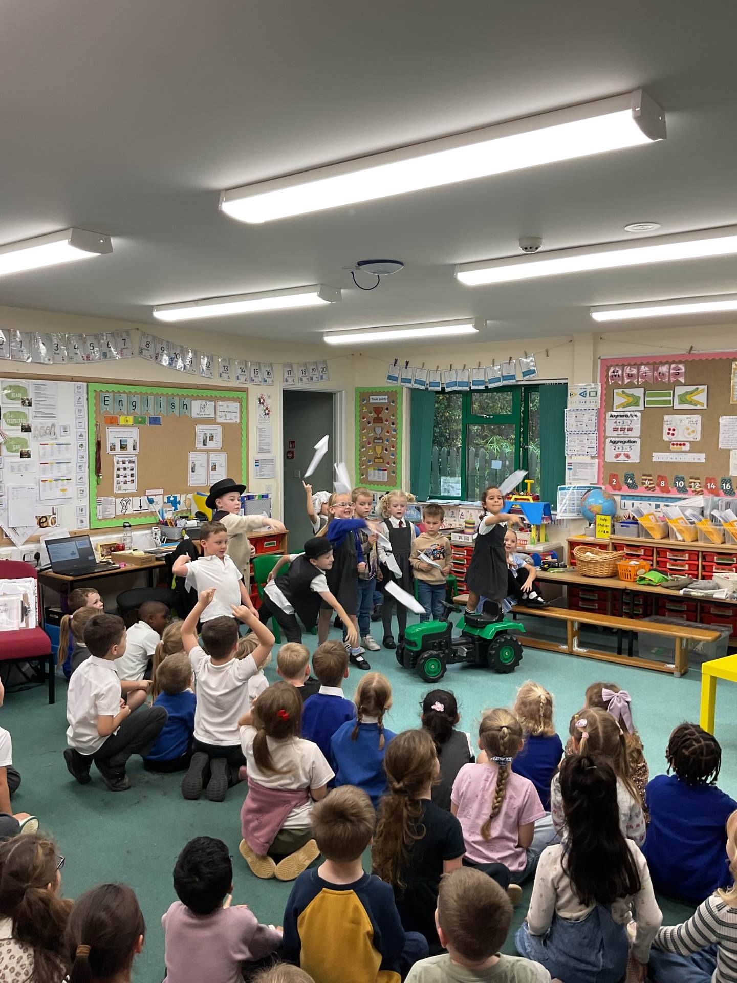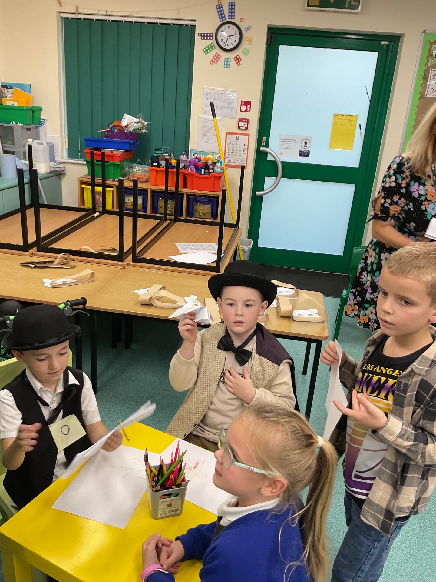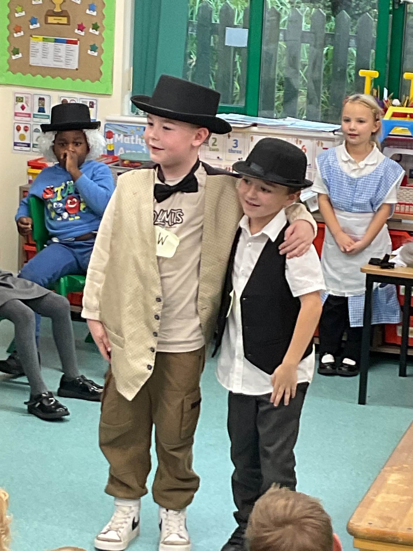 Today we began our new unit of work on First Flight by acting out the life story of the Wright brothers. We dressed up and took on the roles of the different characters. We learnt about how and where the Wright brothers grew up. The jobs that they had and how they persevered and never gave up on something that they believed they had the ability to achieve. That was to build and fly the first powered aircraft.