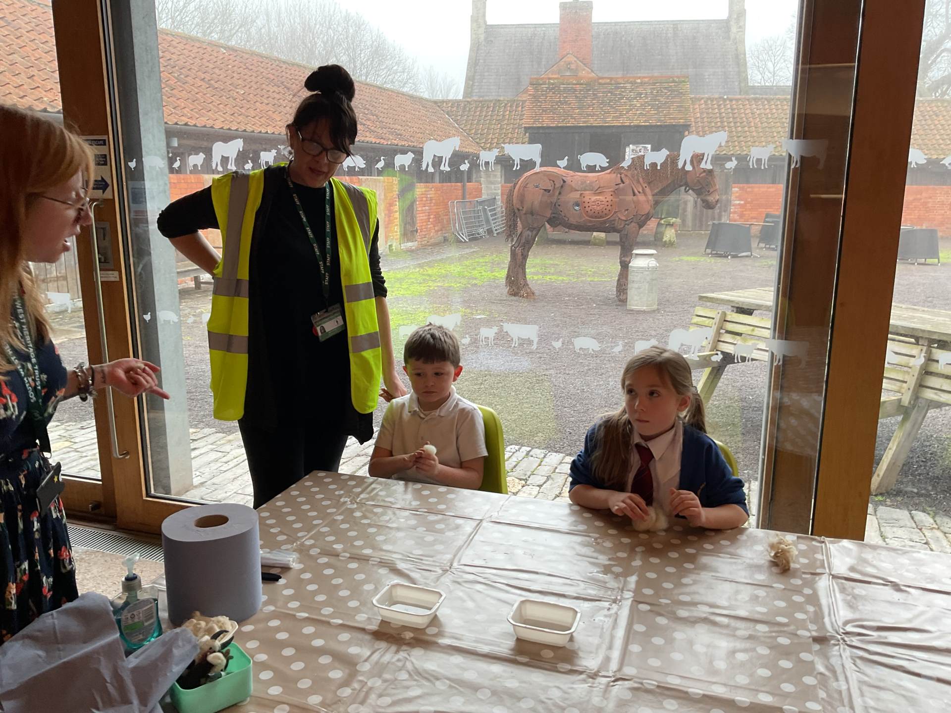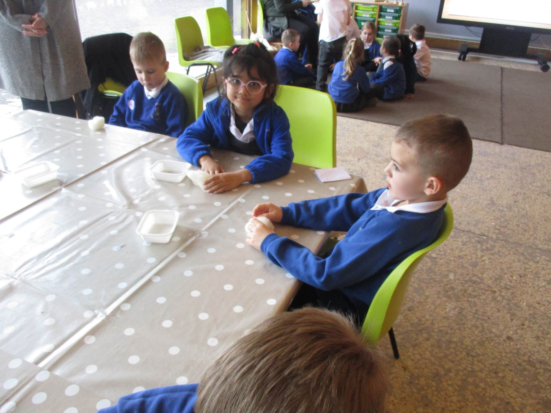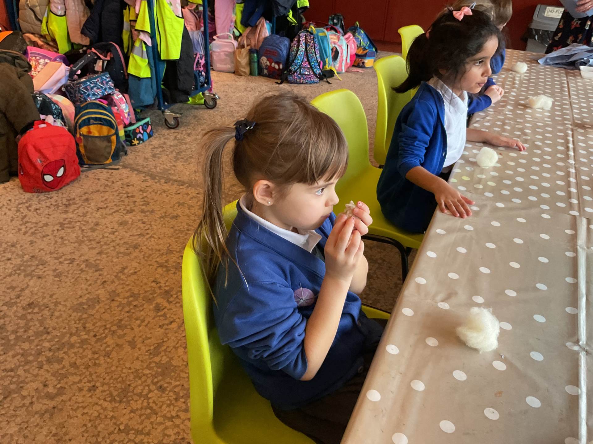 We learnt a lot during the workshop. We began by playing a sorting game with different materials, then took part in two activities. The first was an investigation using wool, soap and water. We found out that you can make felt out of wool by rubbing soap and water into it. It was great fun seeing which animals we could make from the felt.
